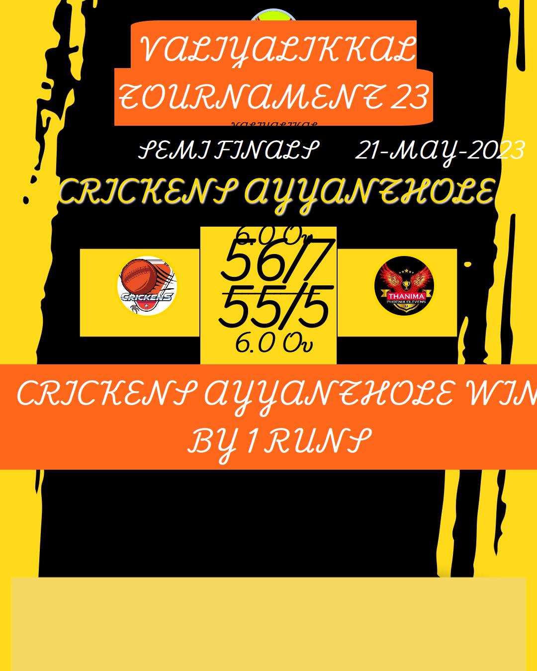 CRICKENS AYYANTHOLE WIN BY 1 RUNS