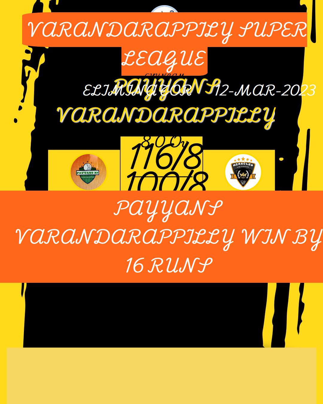 PAYYANS VARANDARAPPILLY WIN BY 16 RUNS
