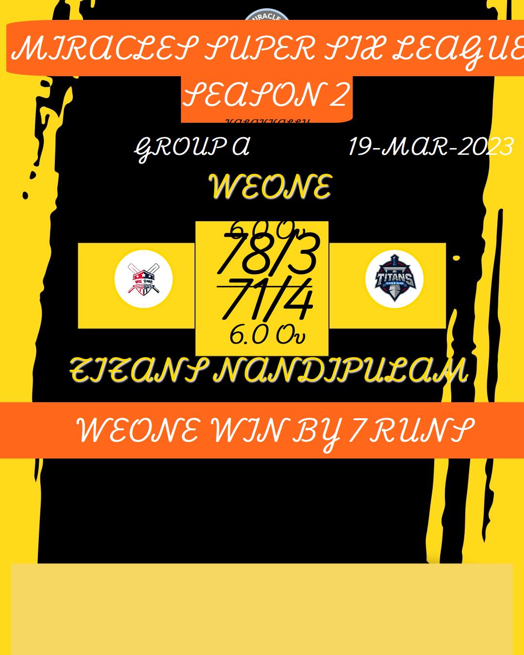 WEONE WIN BY 7 RUNS