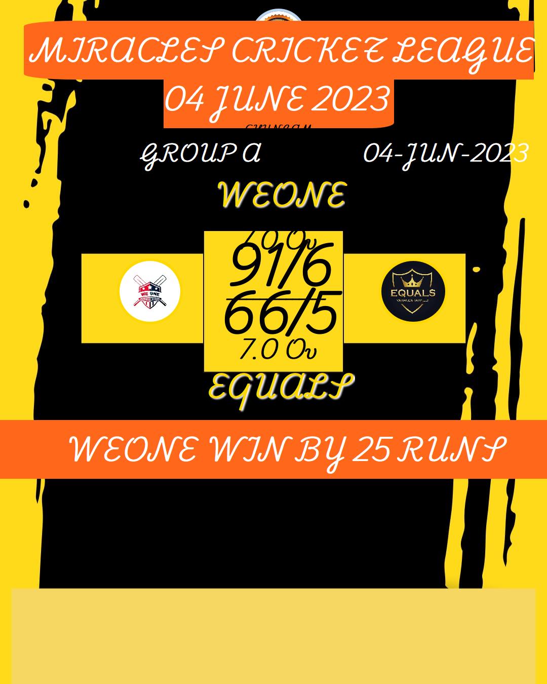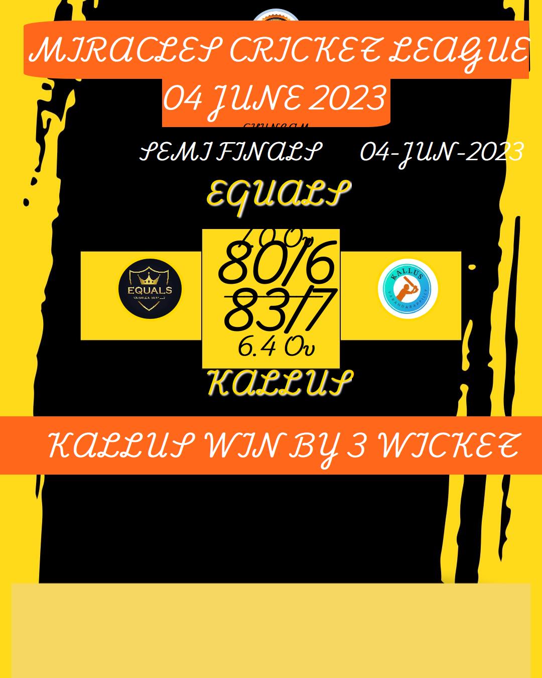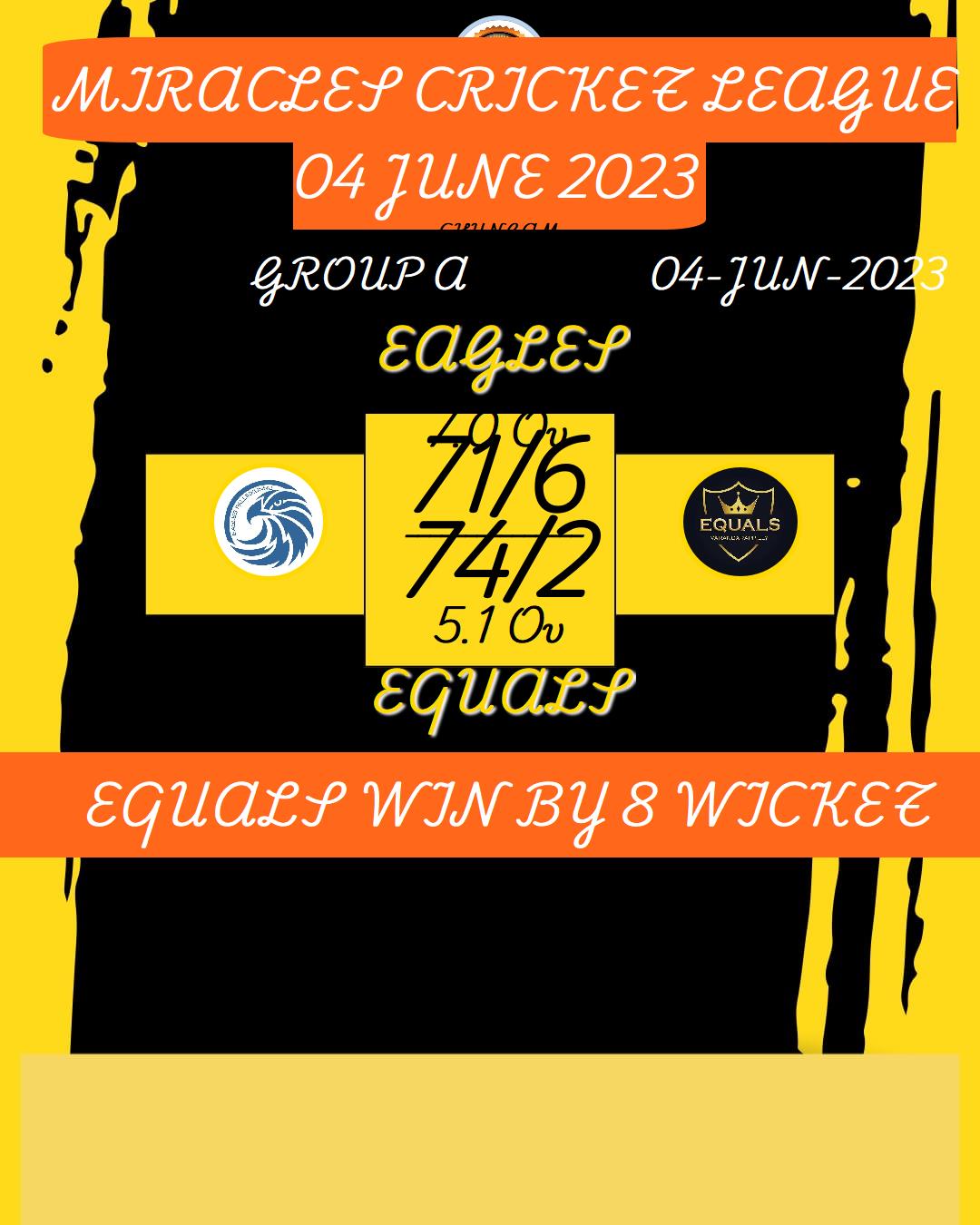 EQUALS (MIRACLES CRICKET LEAGUE 04 JUNE 2023) MATCHES