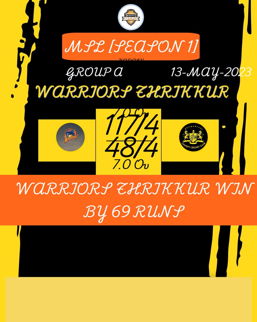 WARRIORS THRIKKUR WIN BY 69 RUNS