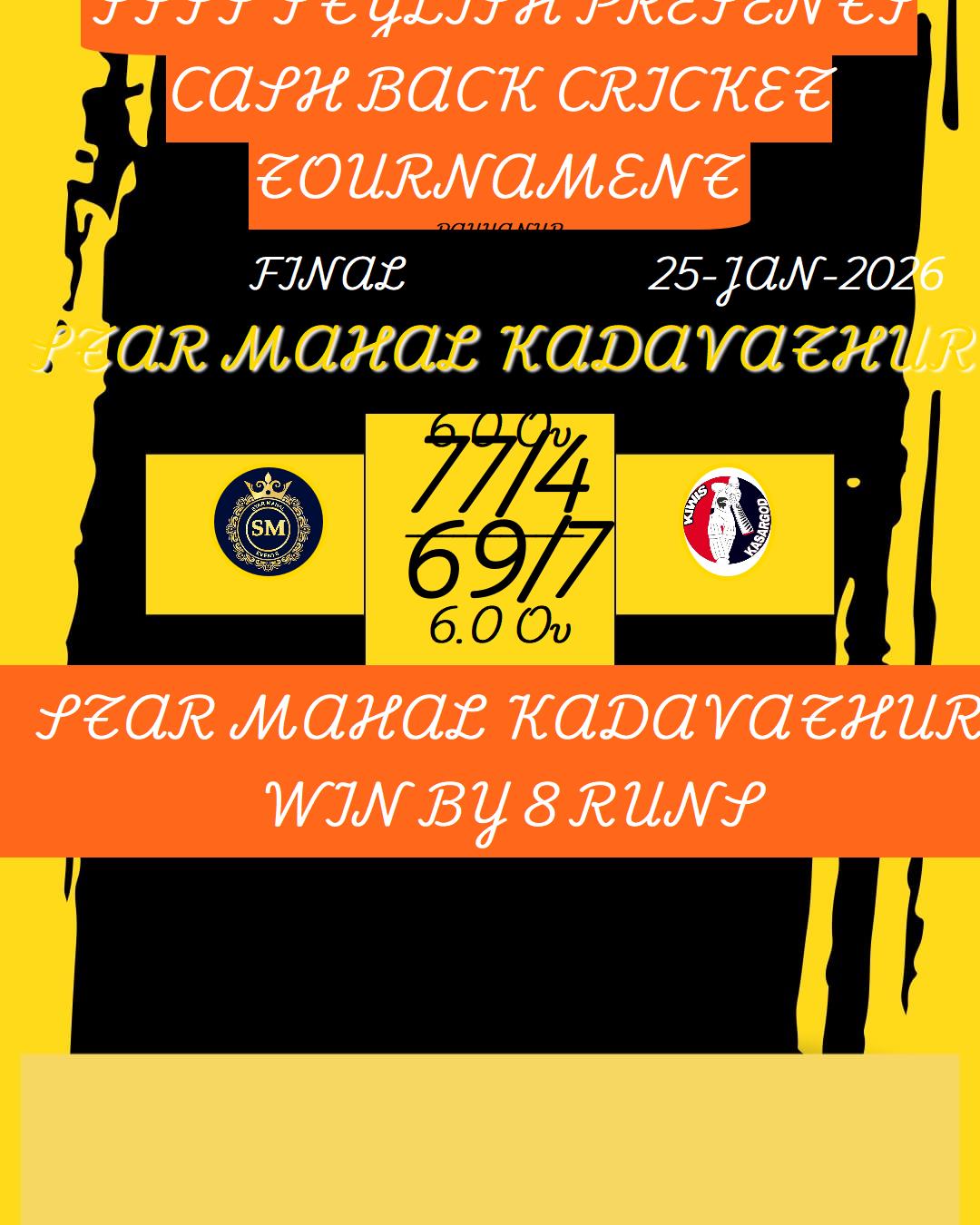 STAR MAHAL KADAVATHUR 53/2 4.0/6 STAR MAHAL KADAVATHUR WIN BY 8 WICKET -