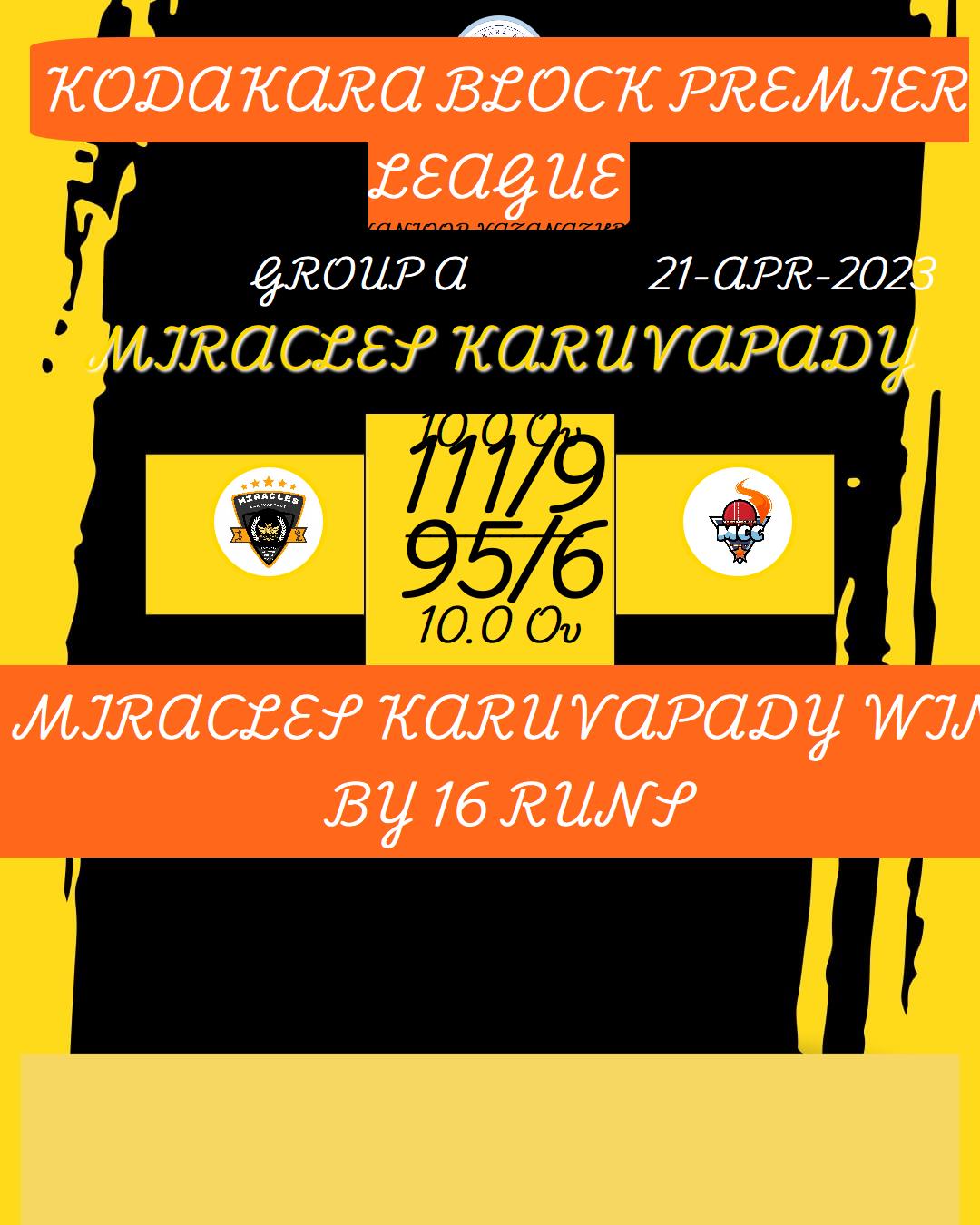 MIRACLES KARUVAPADY WIN BY 16 RUNS