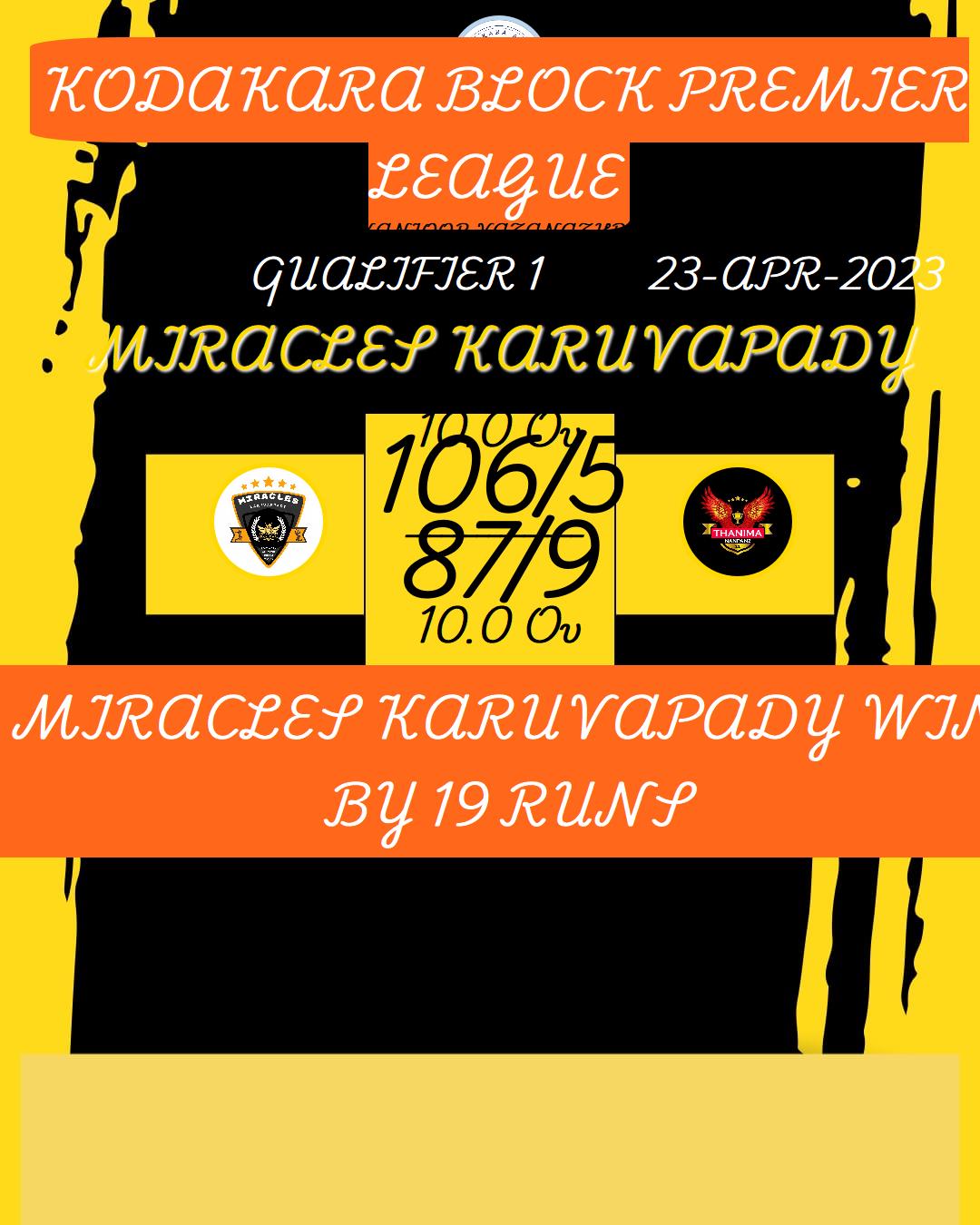 MIRACLES KARUVAPADY WIN BY 19 RUNS