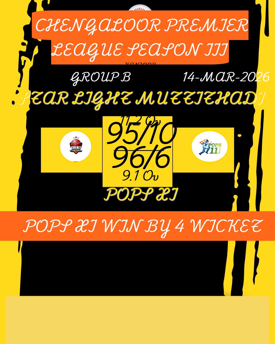 POPS XI 96/6 9.1/12 POPS XI WIN BY 4 WICKET -