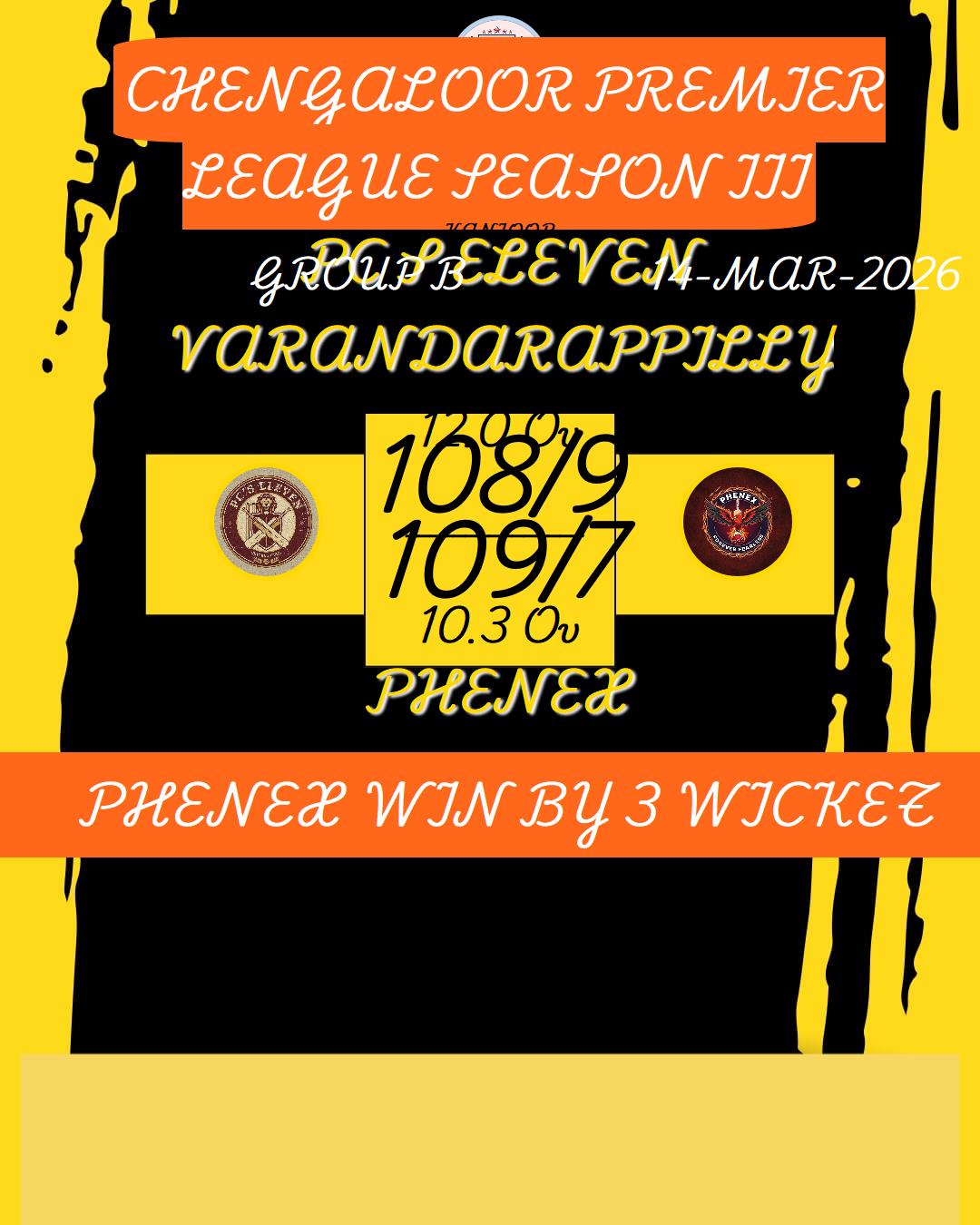 PHENEX 109/7 10.3/12 PHENEX WIN BY 3 WICKET -