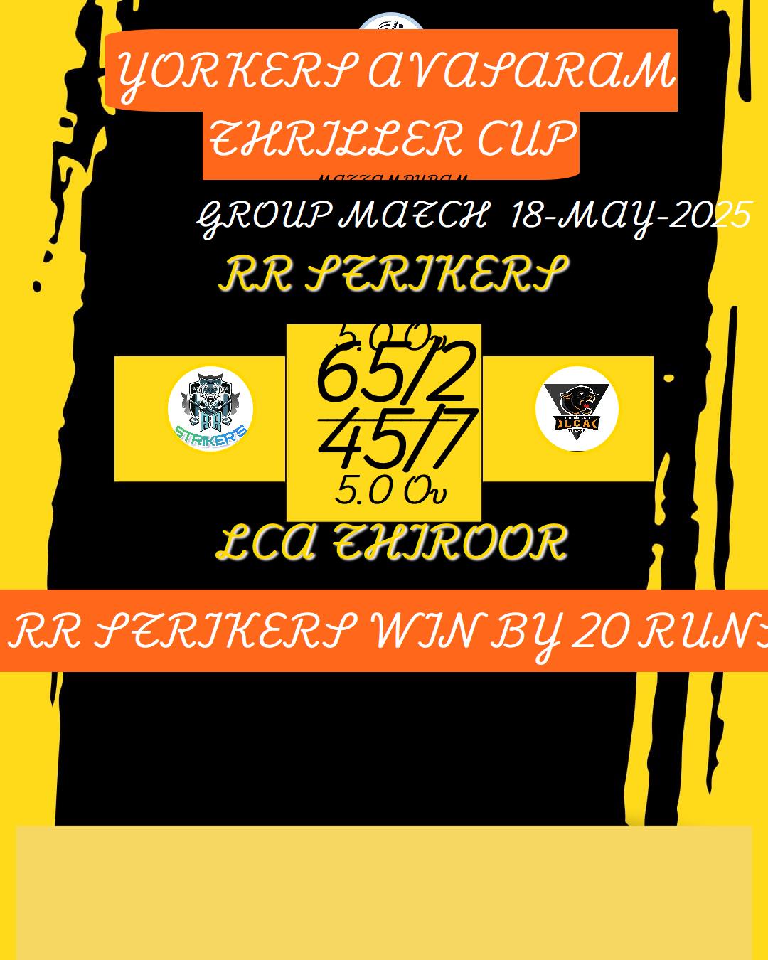 RR STRIKERS WIN BY 20 RUNS