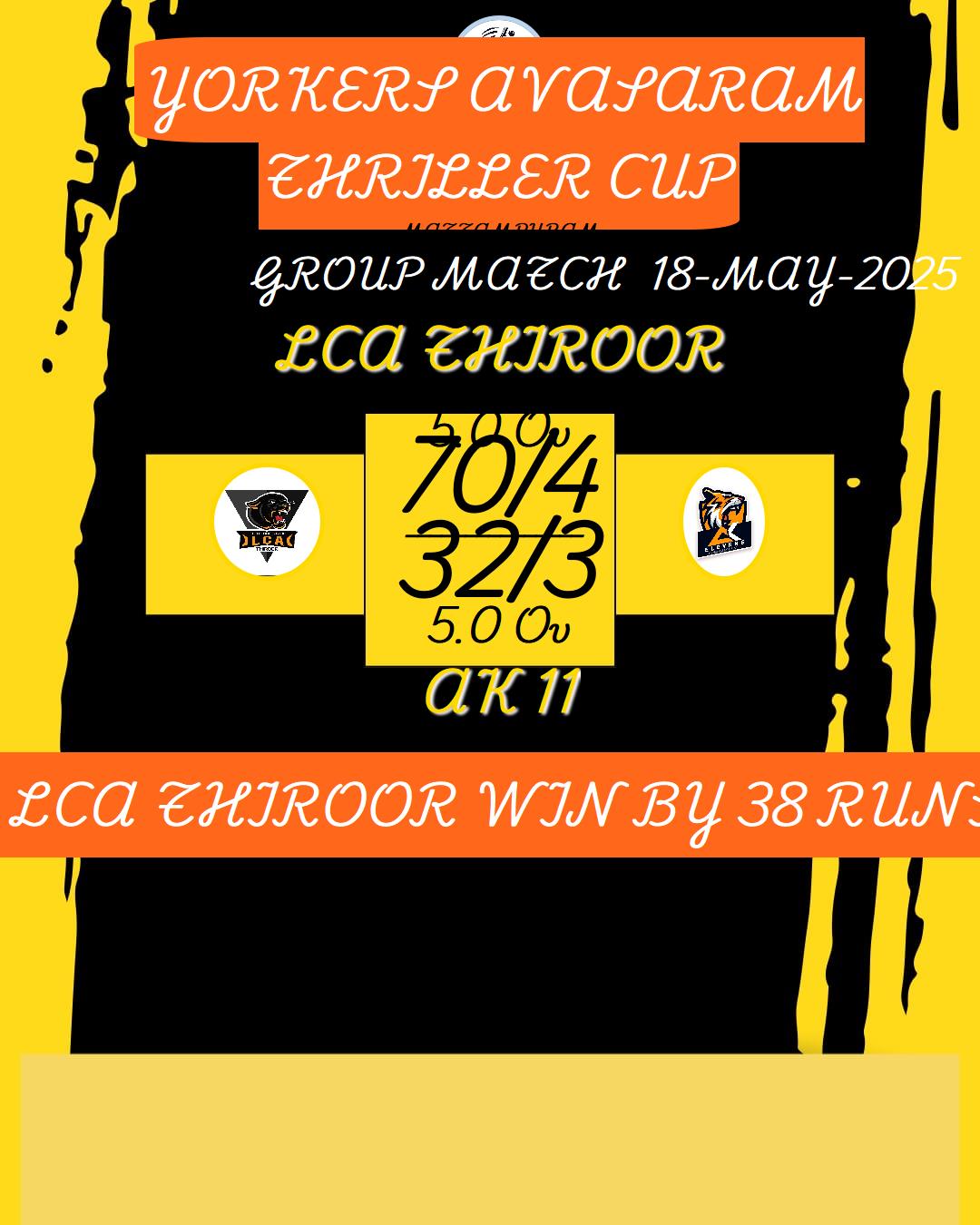 LCA THIROOR WIN BY 38 RUNS