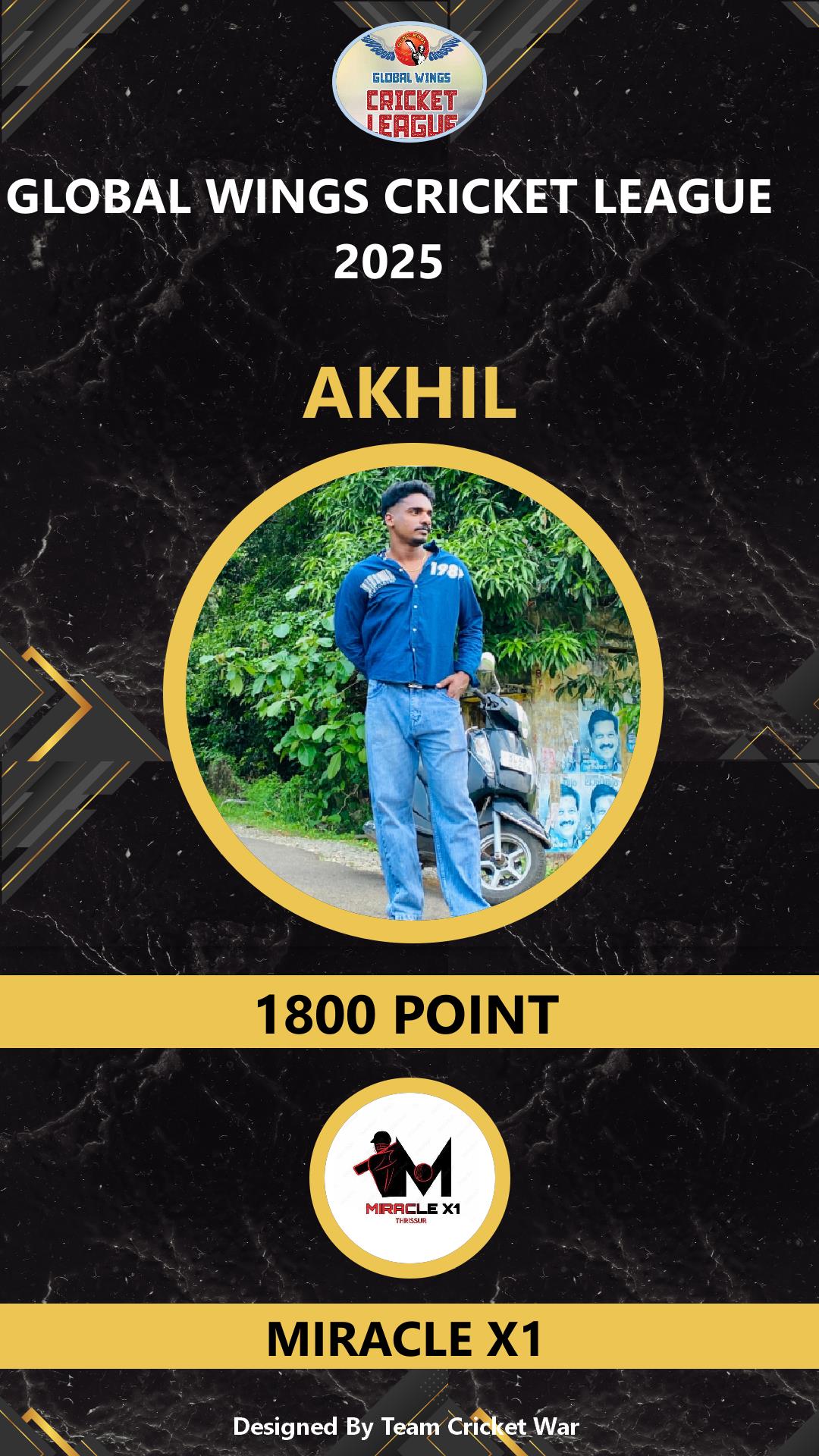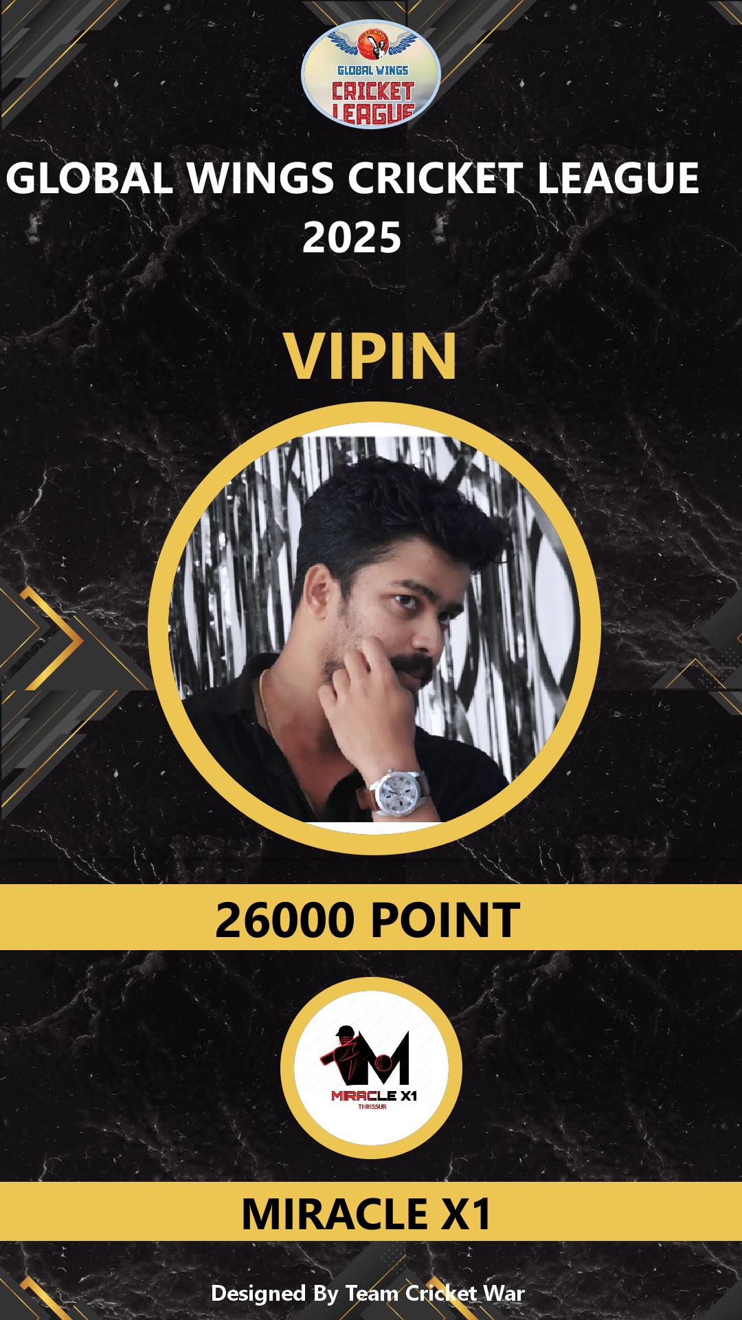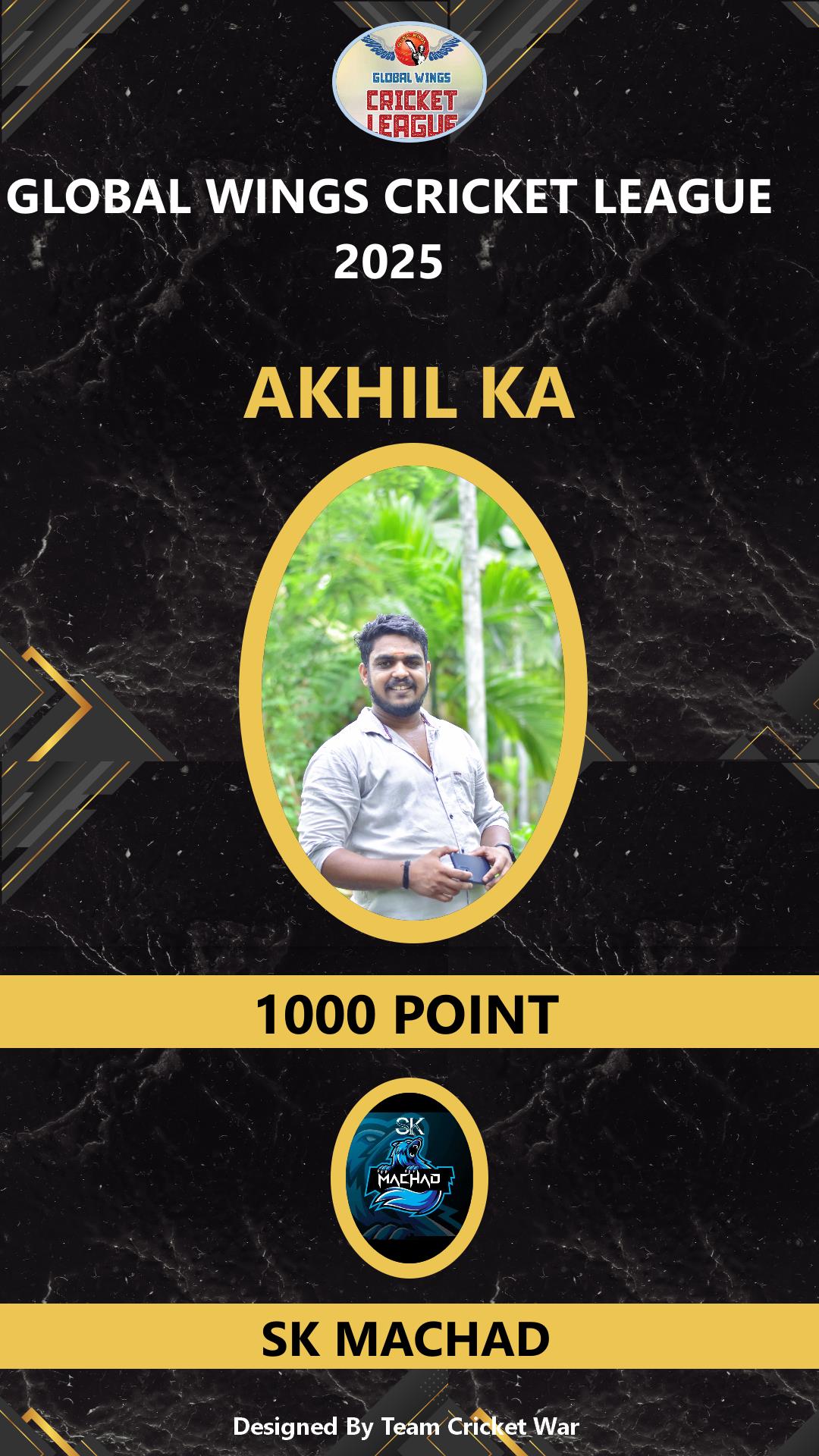 ALLROUNDER, AGE : 19 WADAKKANCHEY Bid Amount : 1000 Team : GLOBAL WINGS Download ID Card VIEW PROFILE |