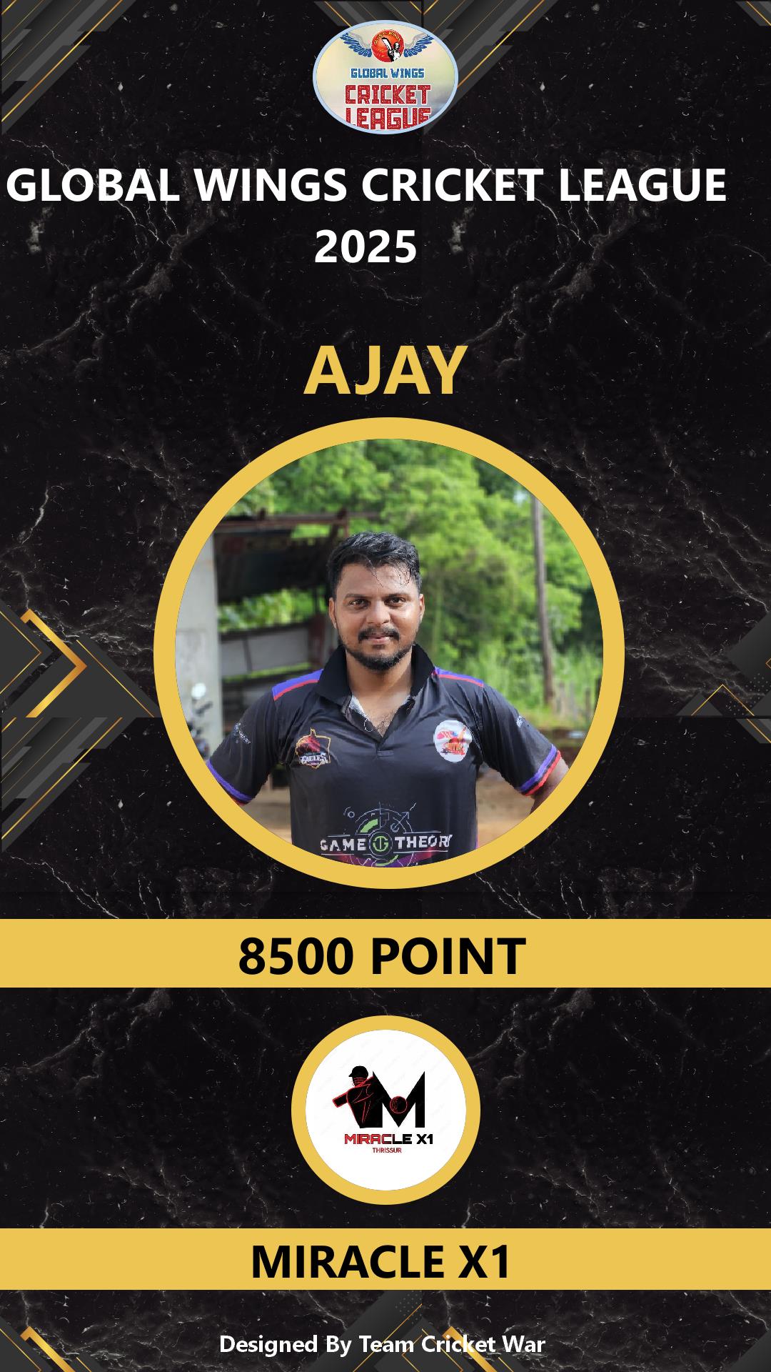 BOWLING ALLROUNDER, AGE : 32 WADAKKANCHERY Bid Amount : 26000 Team : MIRACLE X1 Download ID Card VIEW PROFILE |