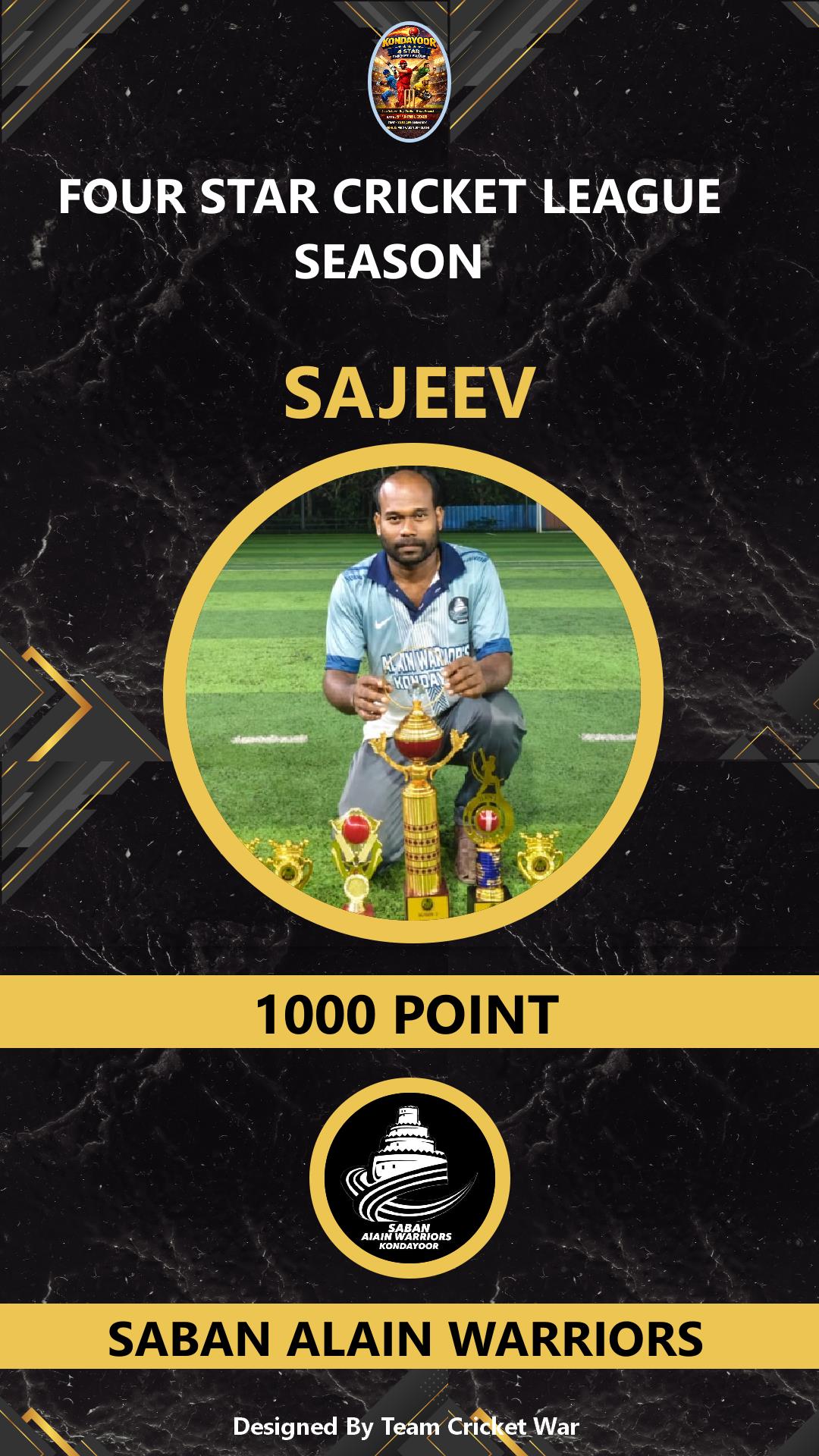 BATTING ALLROUNDER, AGE : 37 VARAVATTOOR Bid Amount : 1000 Team : SABAN ALAIN WARRIORS Download ID Card VIEW PROFILE |