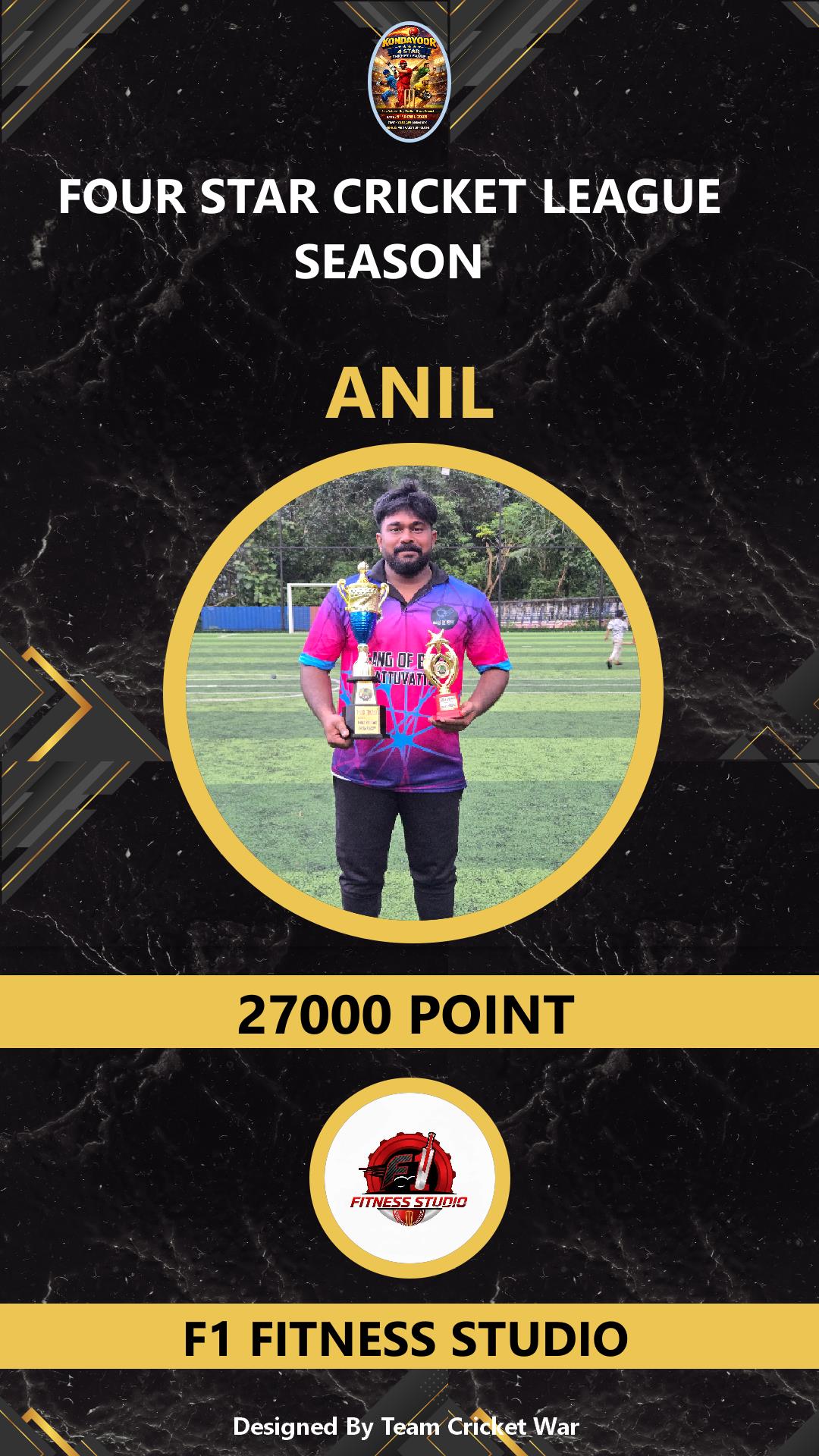 BATTING ALLROUNDER, AGE : 40 VARAVATTOOR Bid Amount : 1000 Team : F1 FITNESS STUDIO Download ID Card VIEW PROFILE |