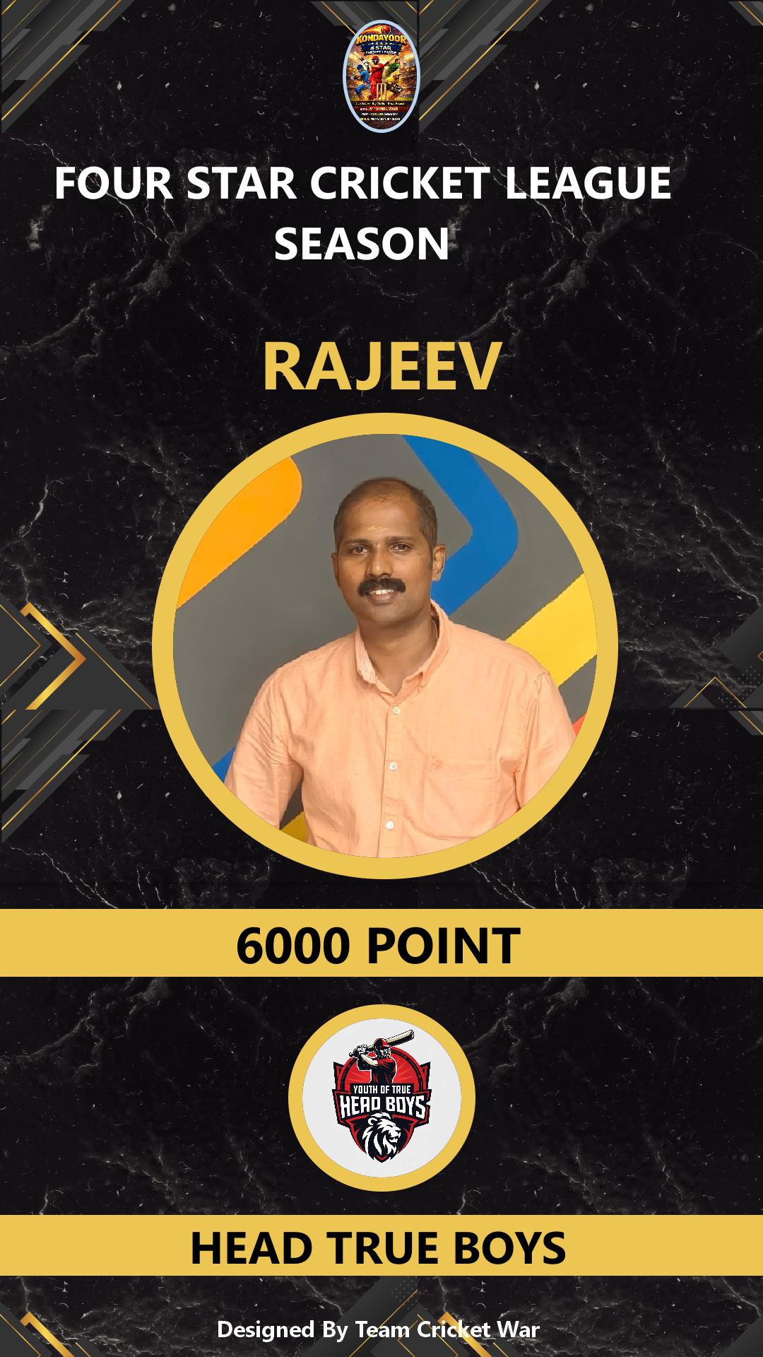 BOWLING ALLROUNDER, AGE : 34 VARAVATTOOR Bid Amount : 7000 Team : HEAD TRUE BOYS Download ID Card VIEW PROFILE |