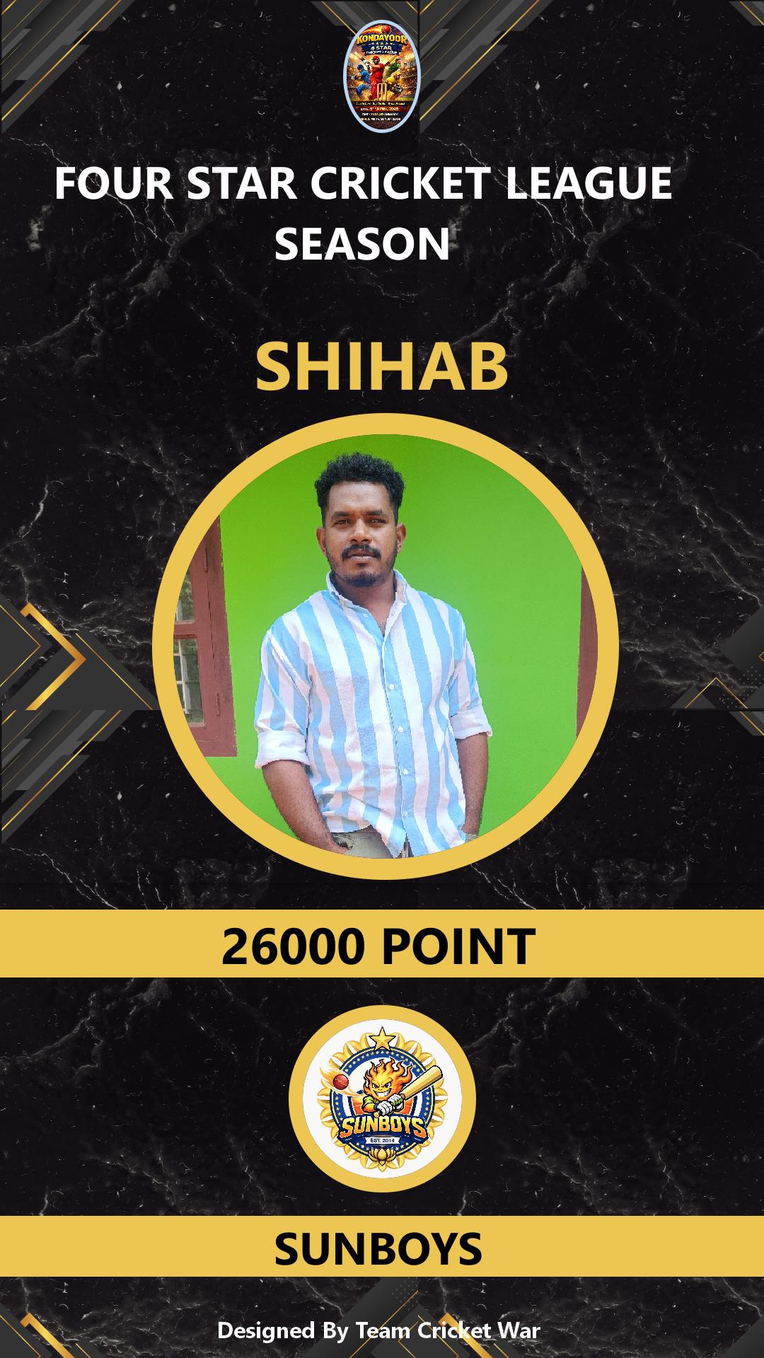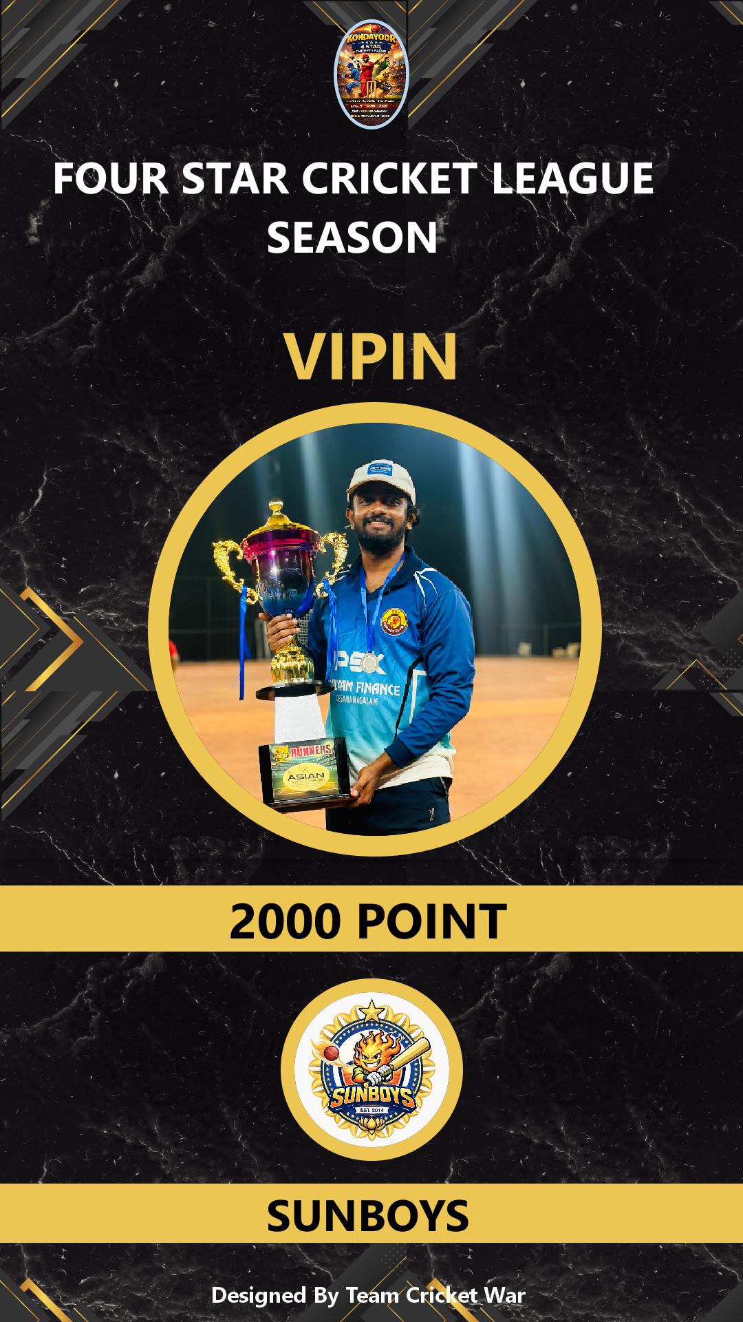 BOWLING ALLROUNDER, AGE : 29 KONDAYOOR Bid Amount : 6000 Team : SUNBOYS Download ID Card VIEW PROFILE |