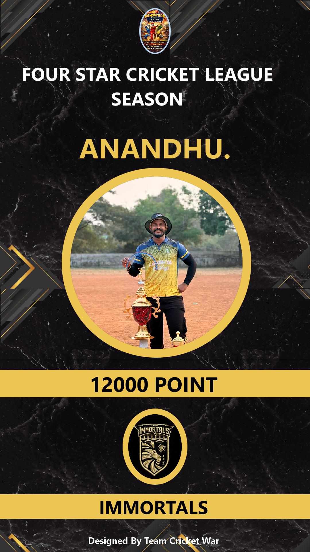 BATSMAN, AGE : 33 THIRUMITTACODE- Bid Amount : 1000 Team : IMMORTALS Download ID Card VIEW PROFILE |