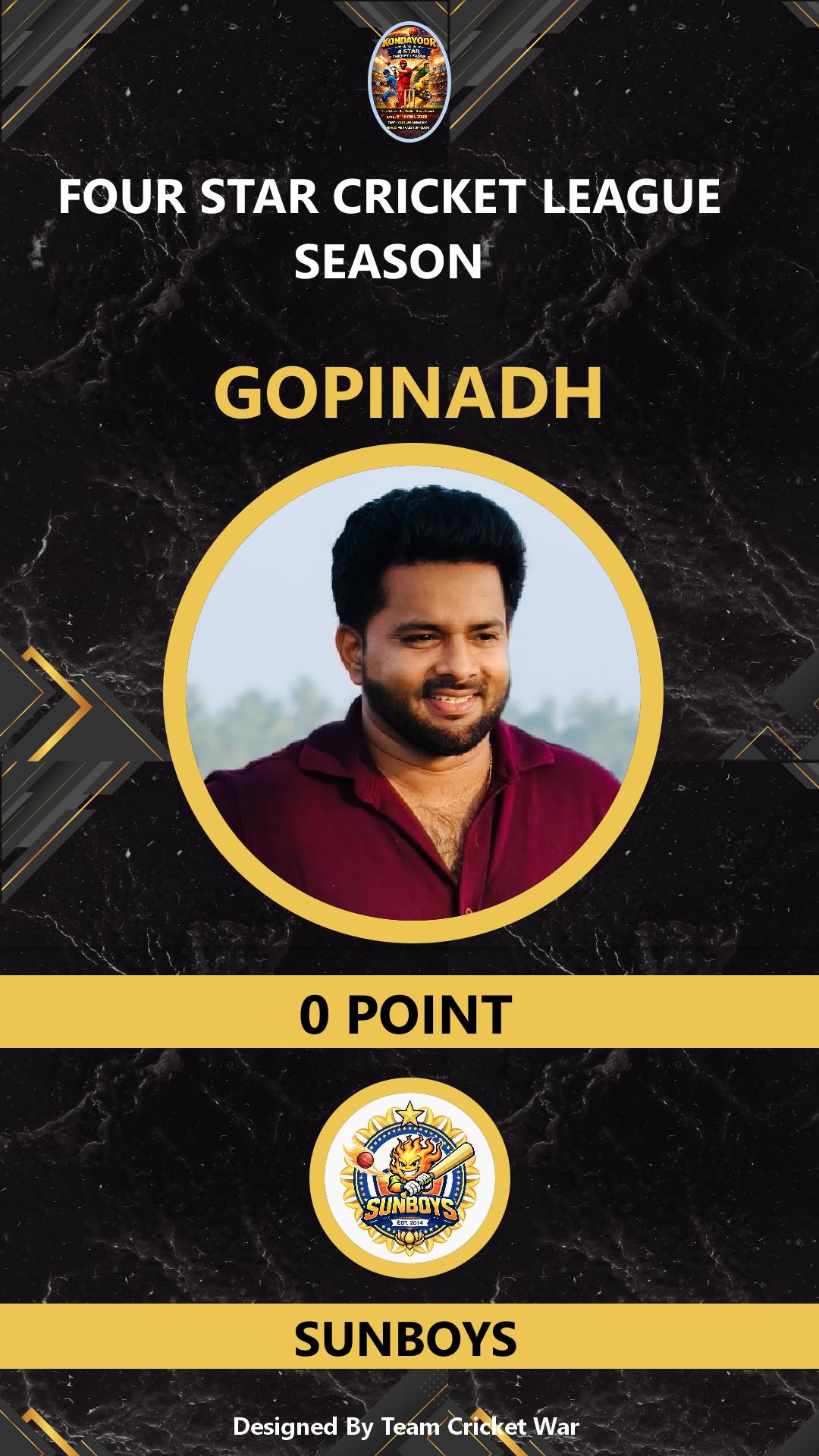 BATSMAN, AGE : 41 VARAVOOR Bid Amount : 0 Team : SUNBOYS Download ID Card VIEW PROFILE |