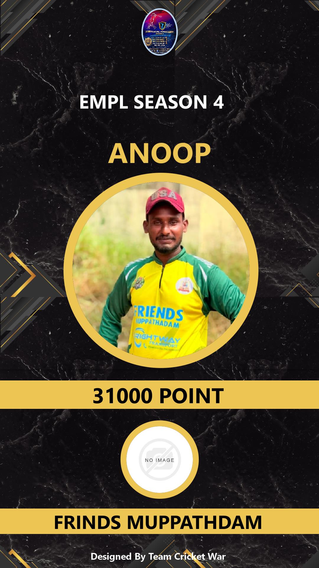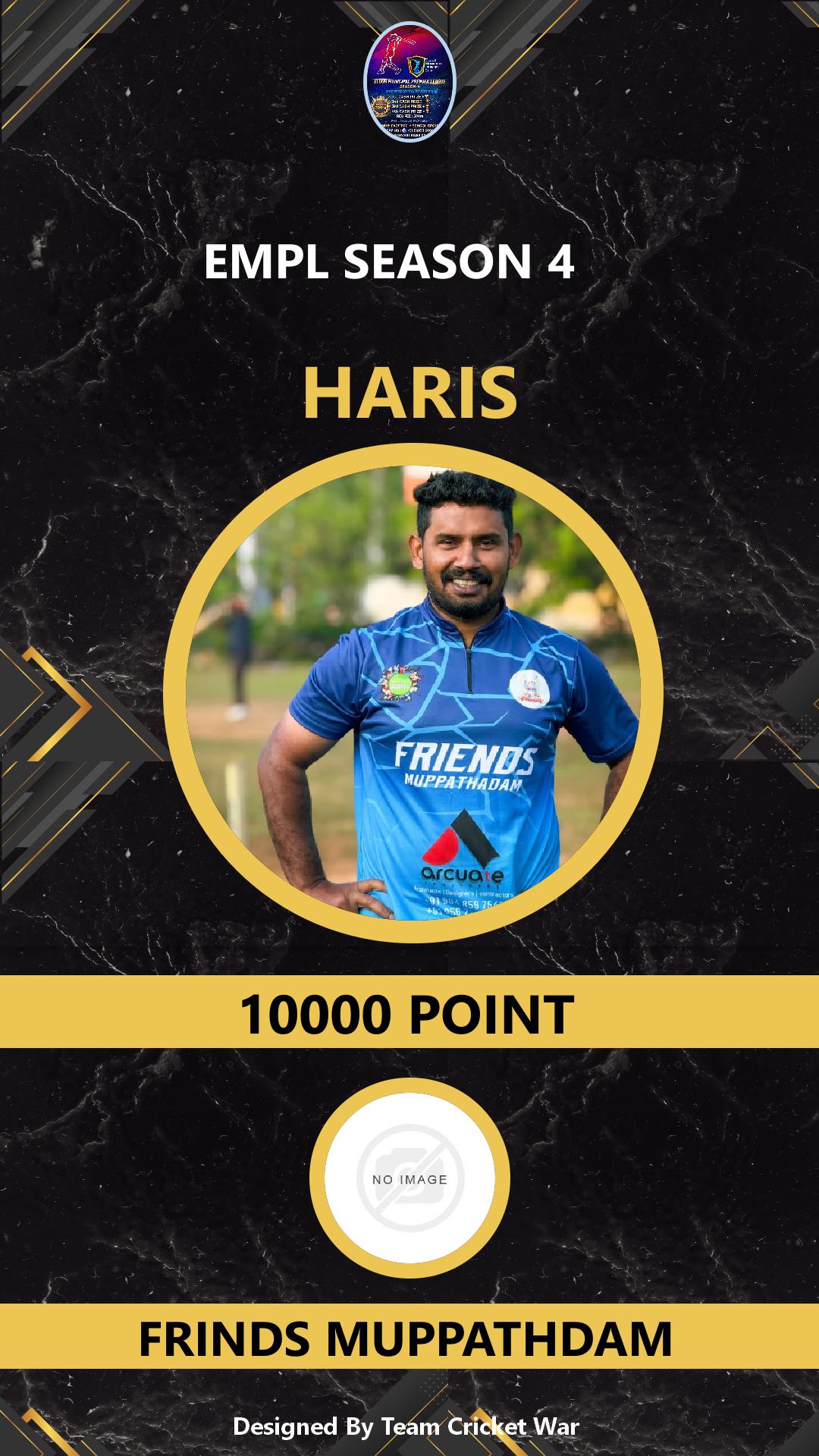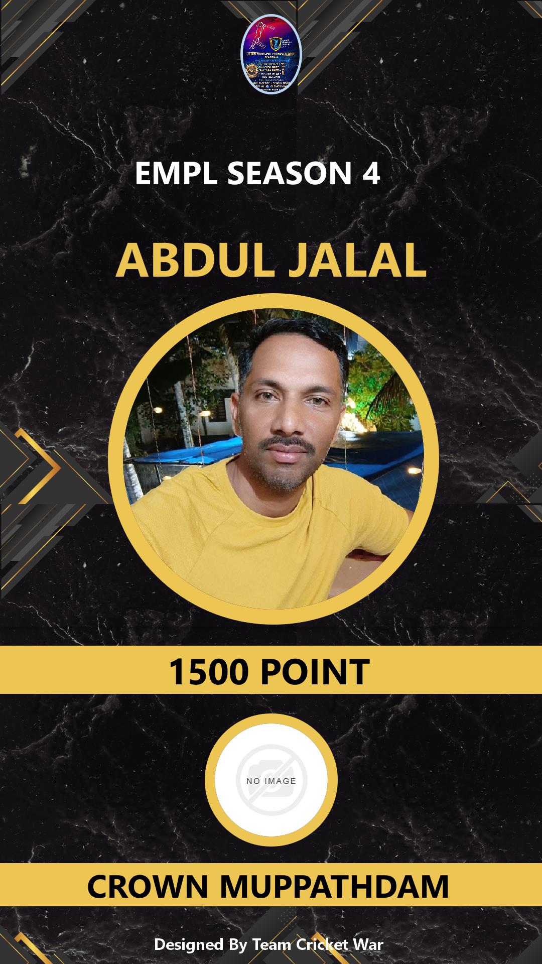 BATTING ALLROUNDER, AGE : 0 ELOOR Bid Amount : 1000 Team : FRINDS MUPPATHDAM Download ID Card VIEW PROFILE |