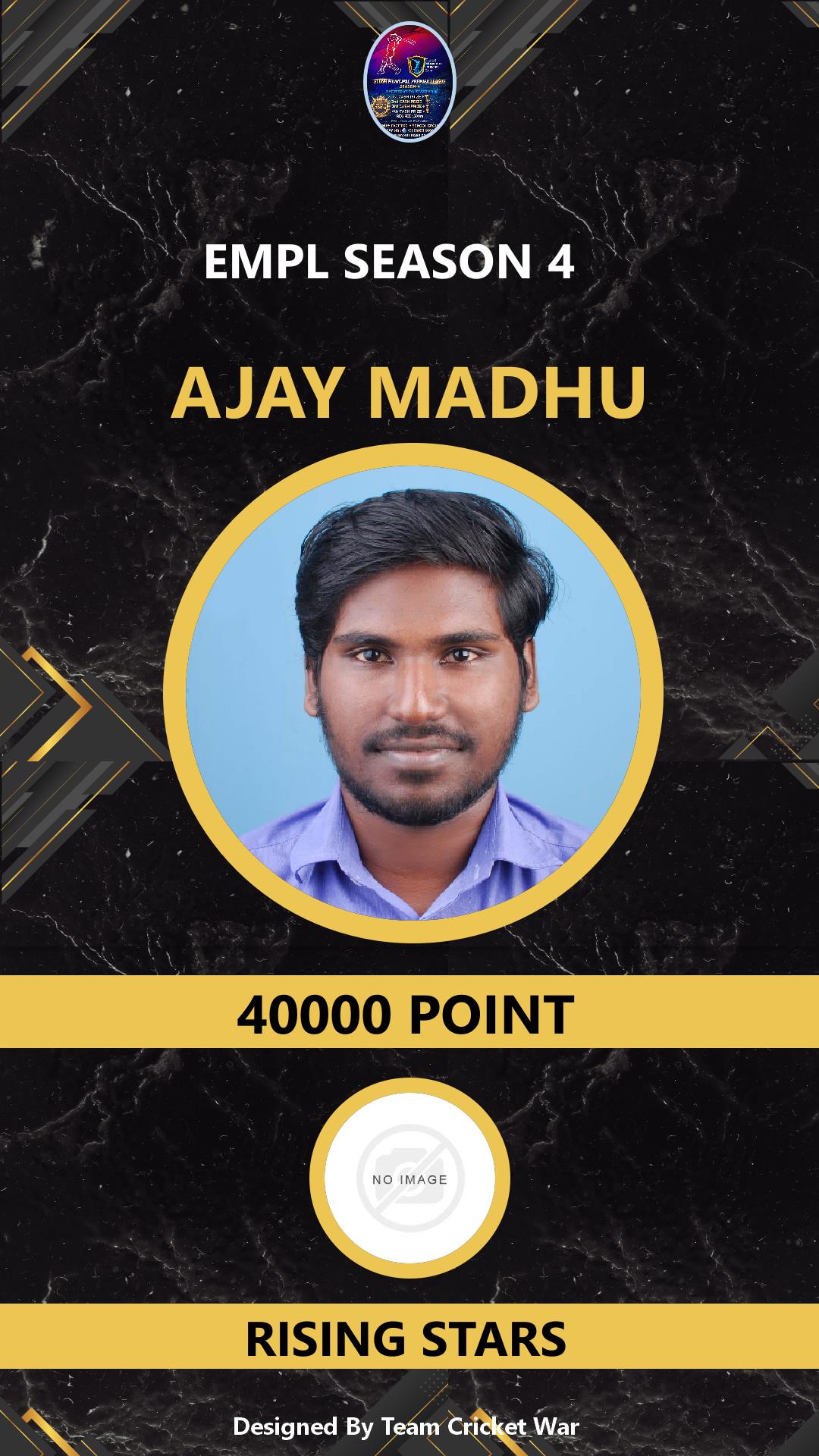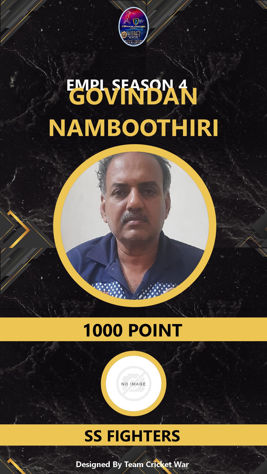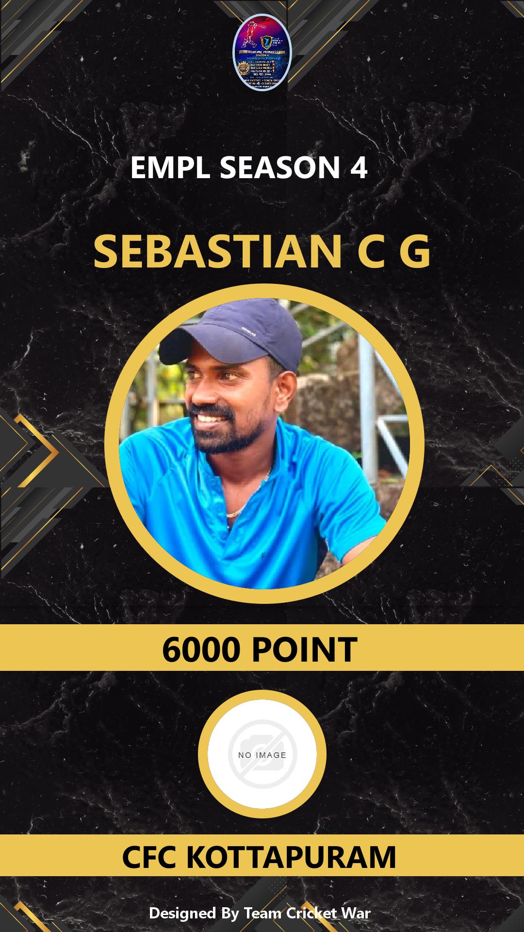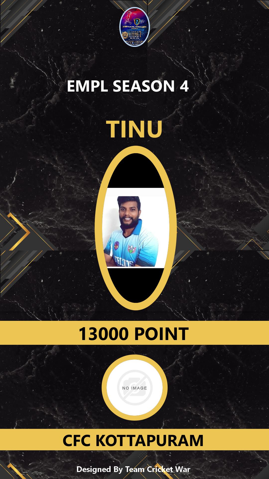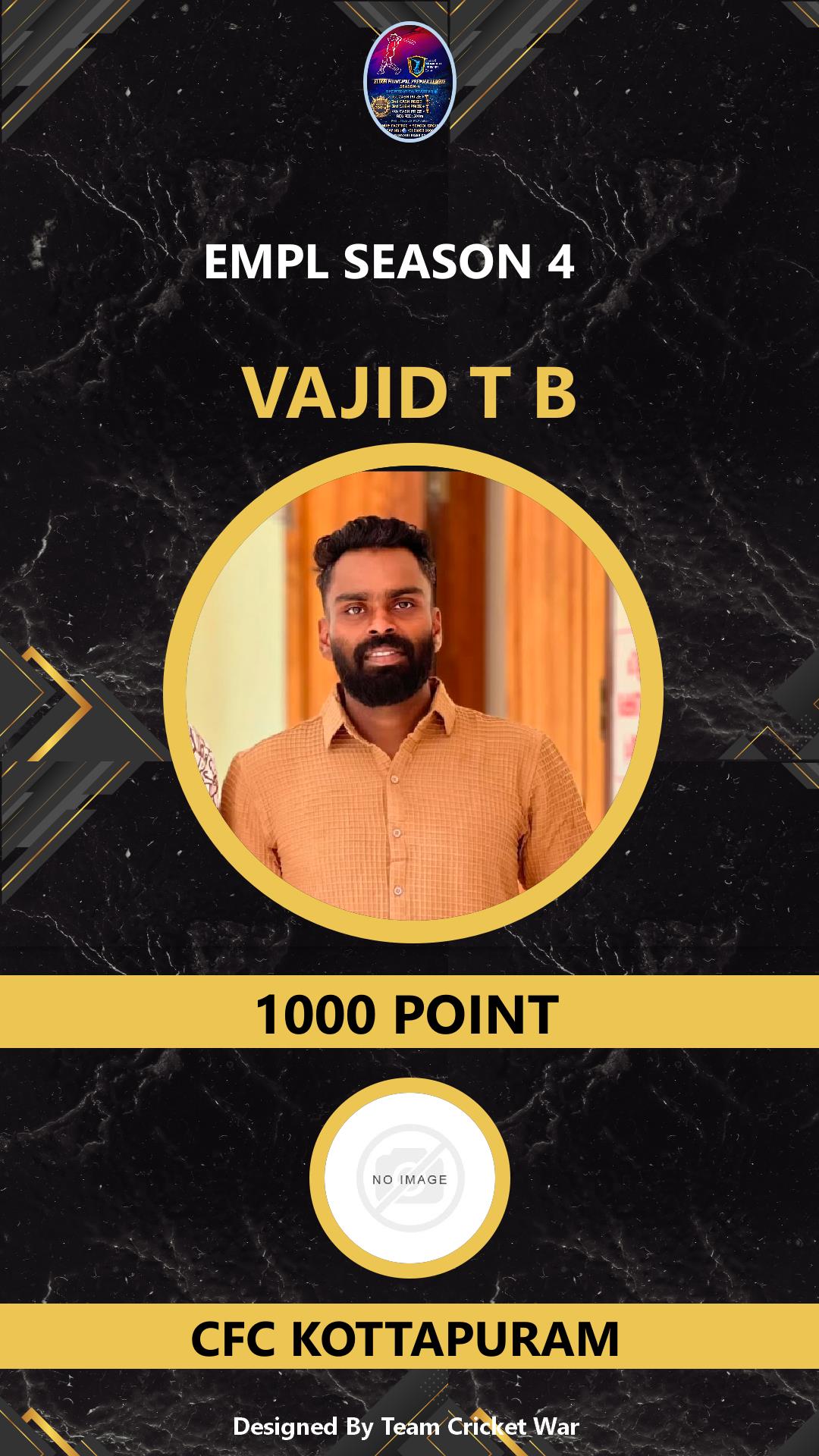 BATTING ALLROUNDER, AGE : 0 ELOOR Bid Amount : 1000 Team : CFC KOTTAPURAM Download ID Card VIEW PROFILE |