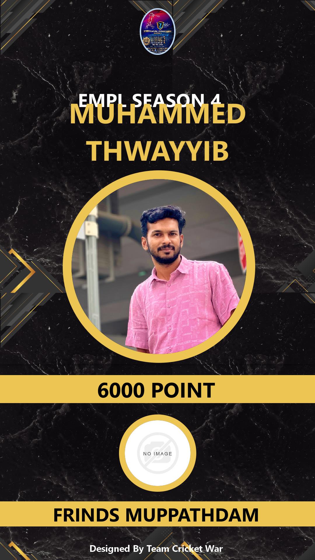 BOWLING ALLROUNDER, AGE : 1 MUPPATHADAM Bid Amount : 6000 Team : FRINDS MUPPATHDAM Download ID Card VIEW PROFILE |