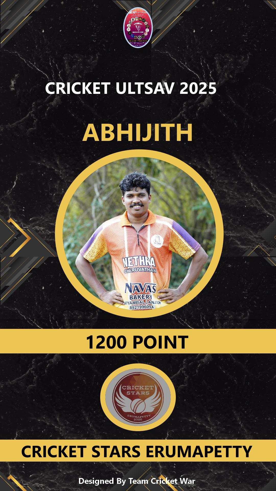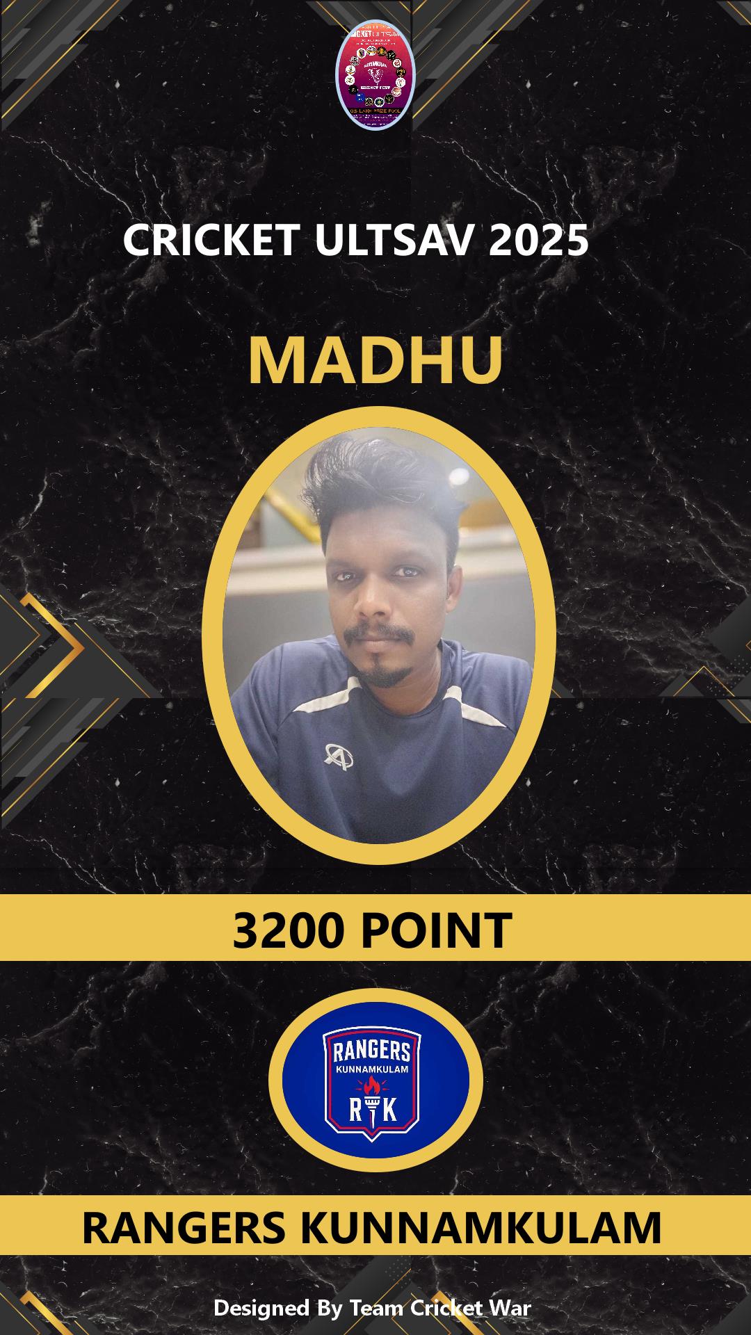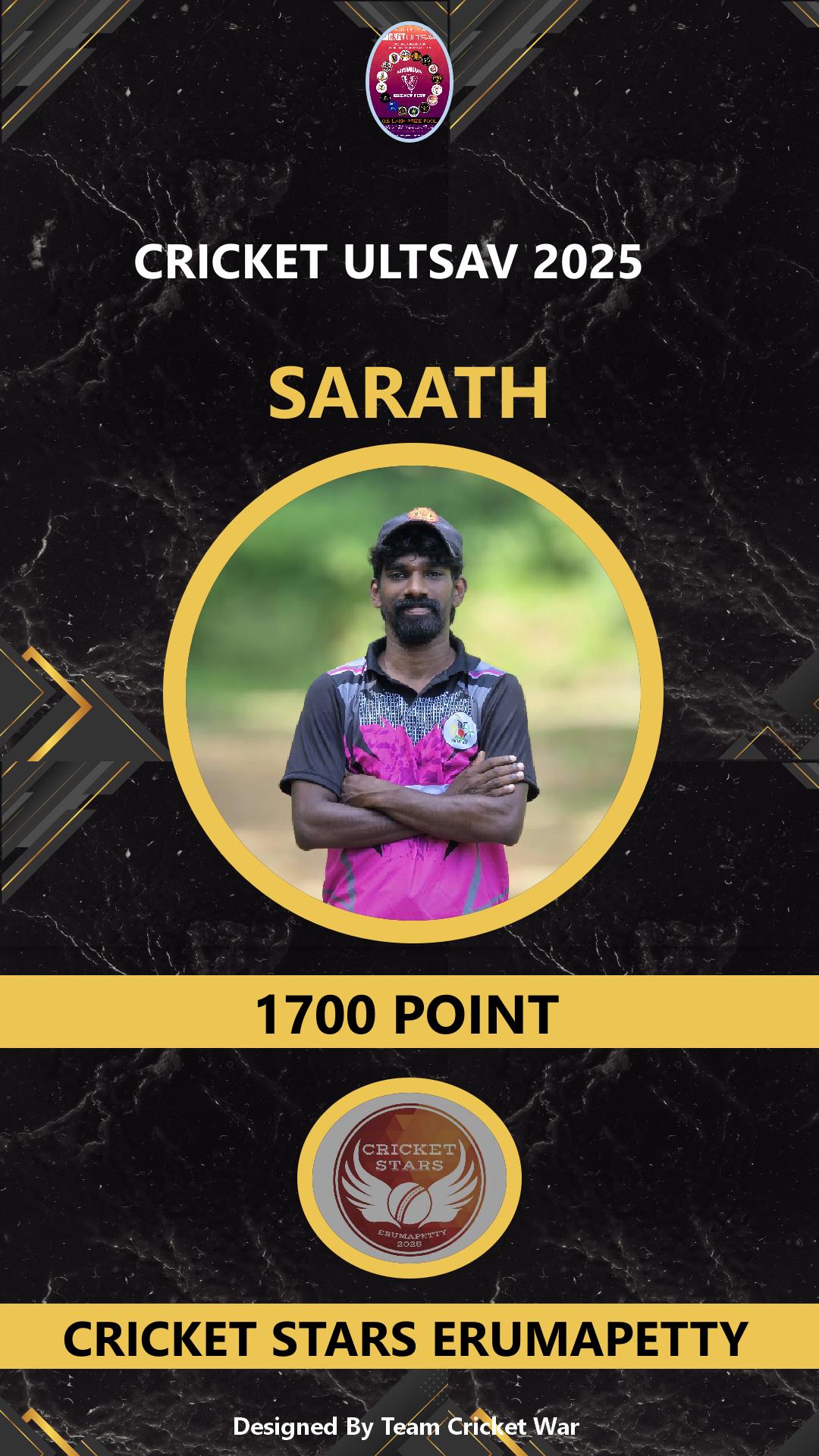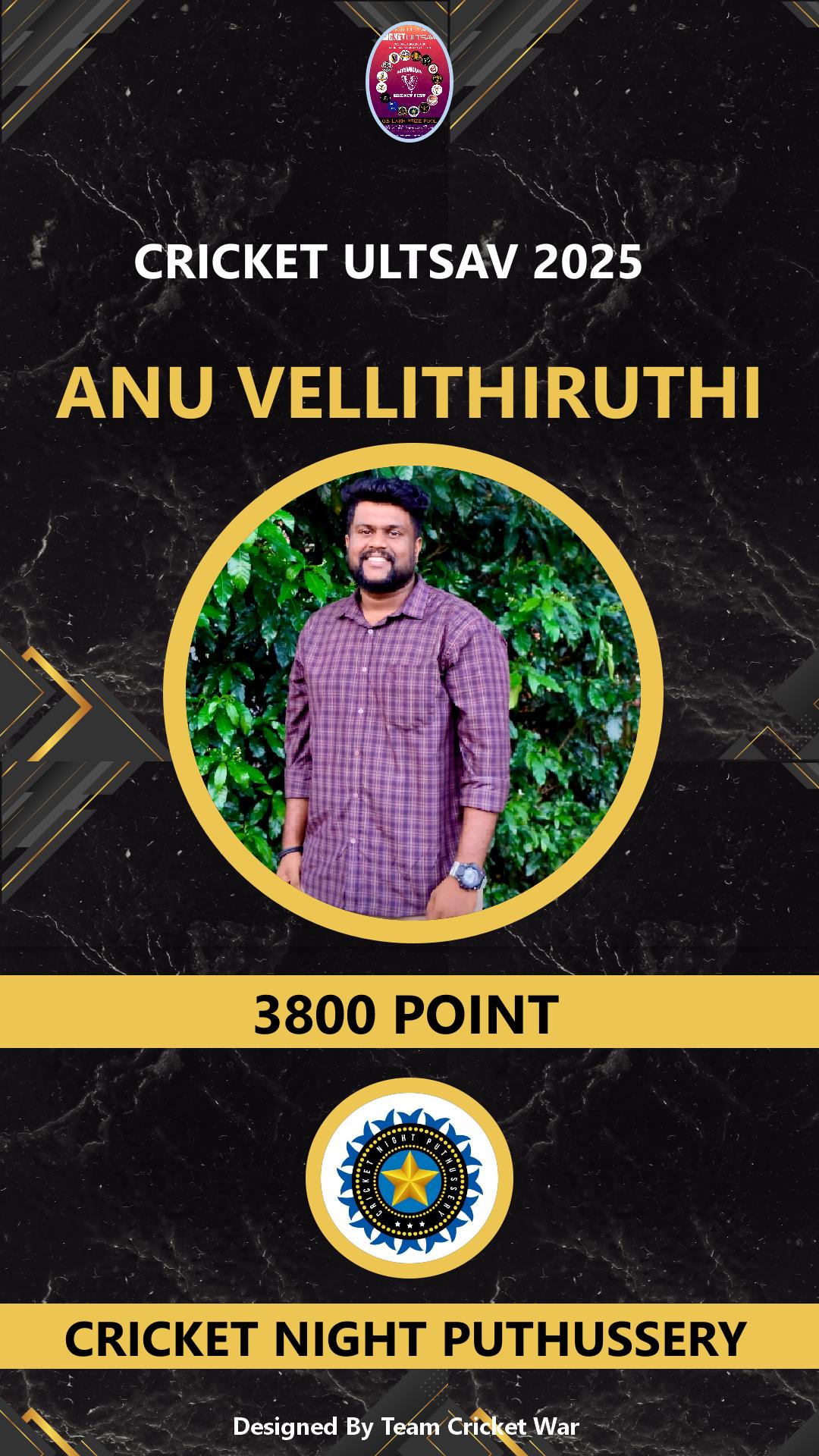 ALLROUNDER, AGE : 26 ANJOOR Bid Amount : 1700 Team : CRICKET STARS ERUMAPETTY Download ID Card VIEW PROFILE |