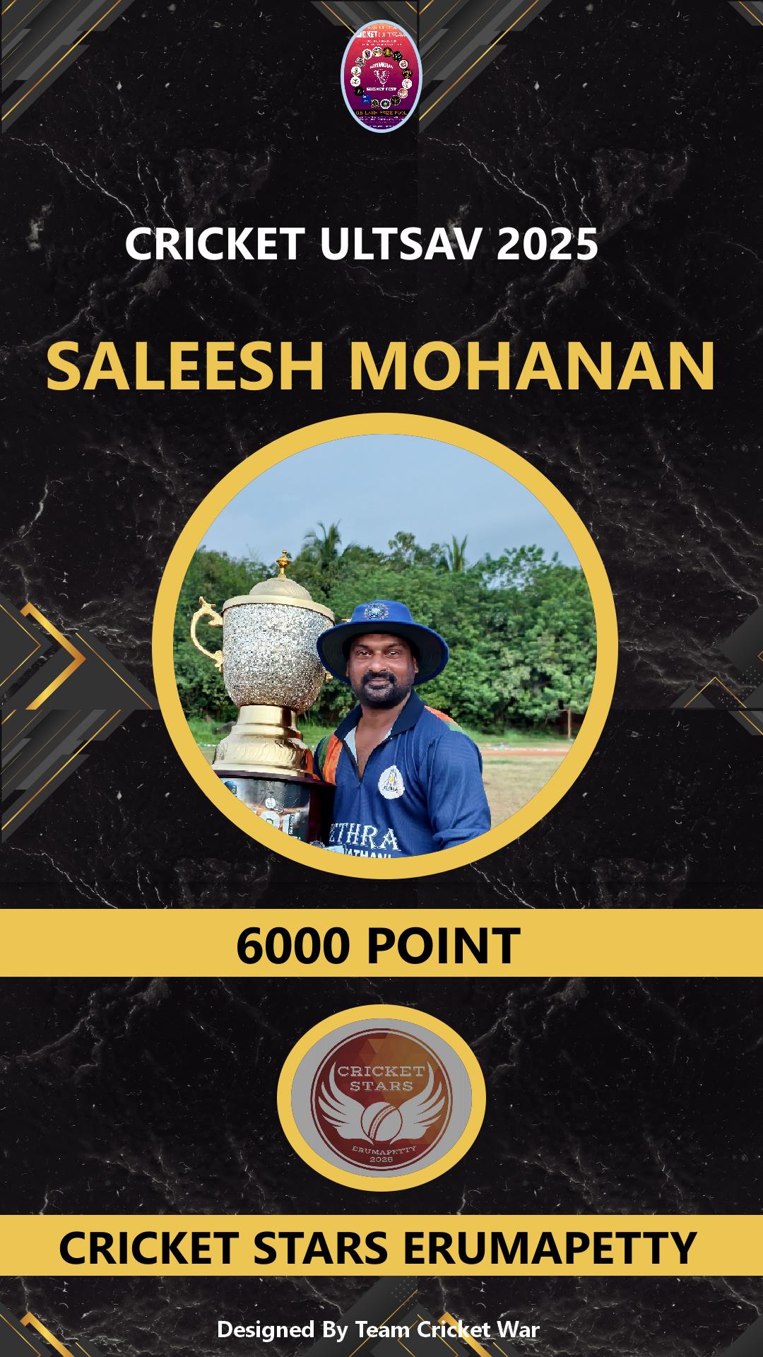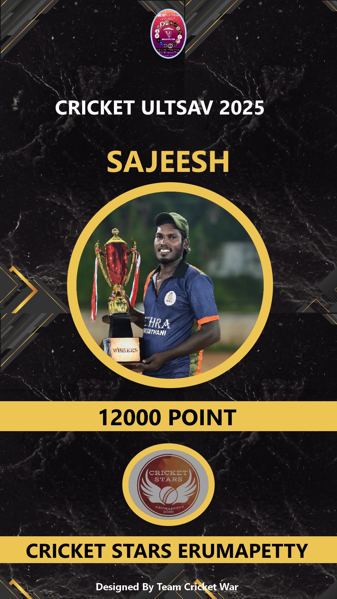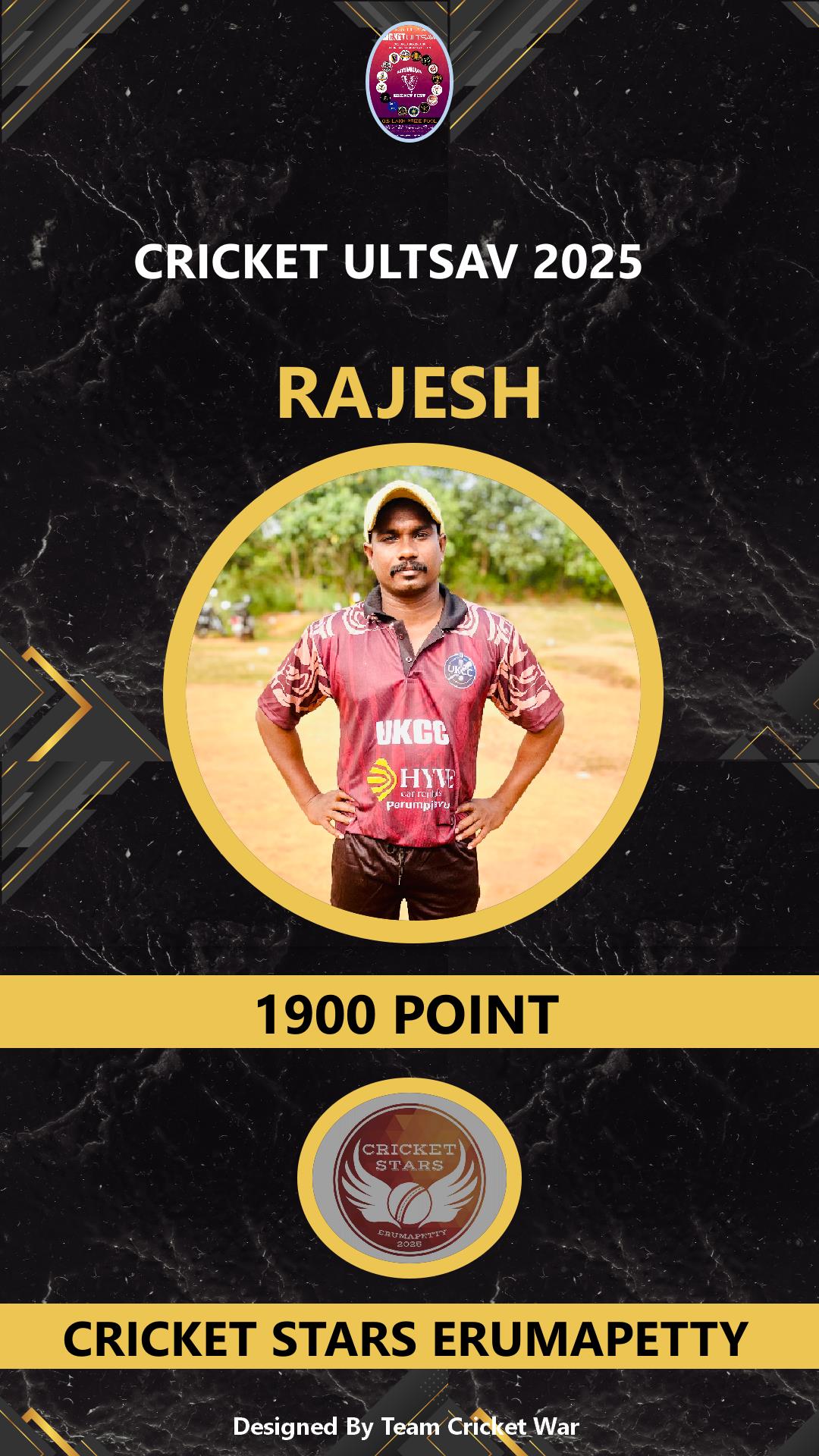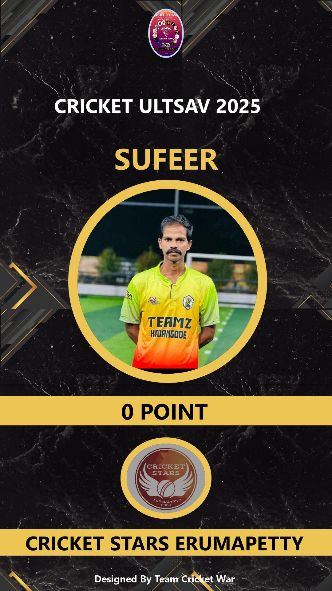 ALLROUNDER, AGE : 30 EYYAL Bid Amount : 1100 Team : CRICKET STARS ERUMAPETTY Download ID Card VIEW PROFILE |