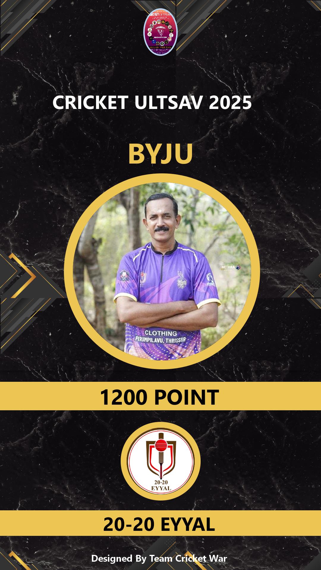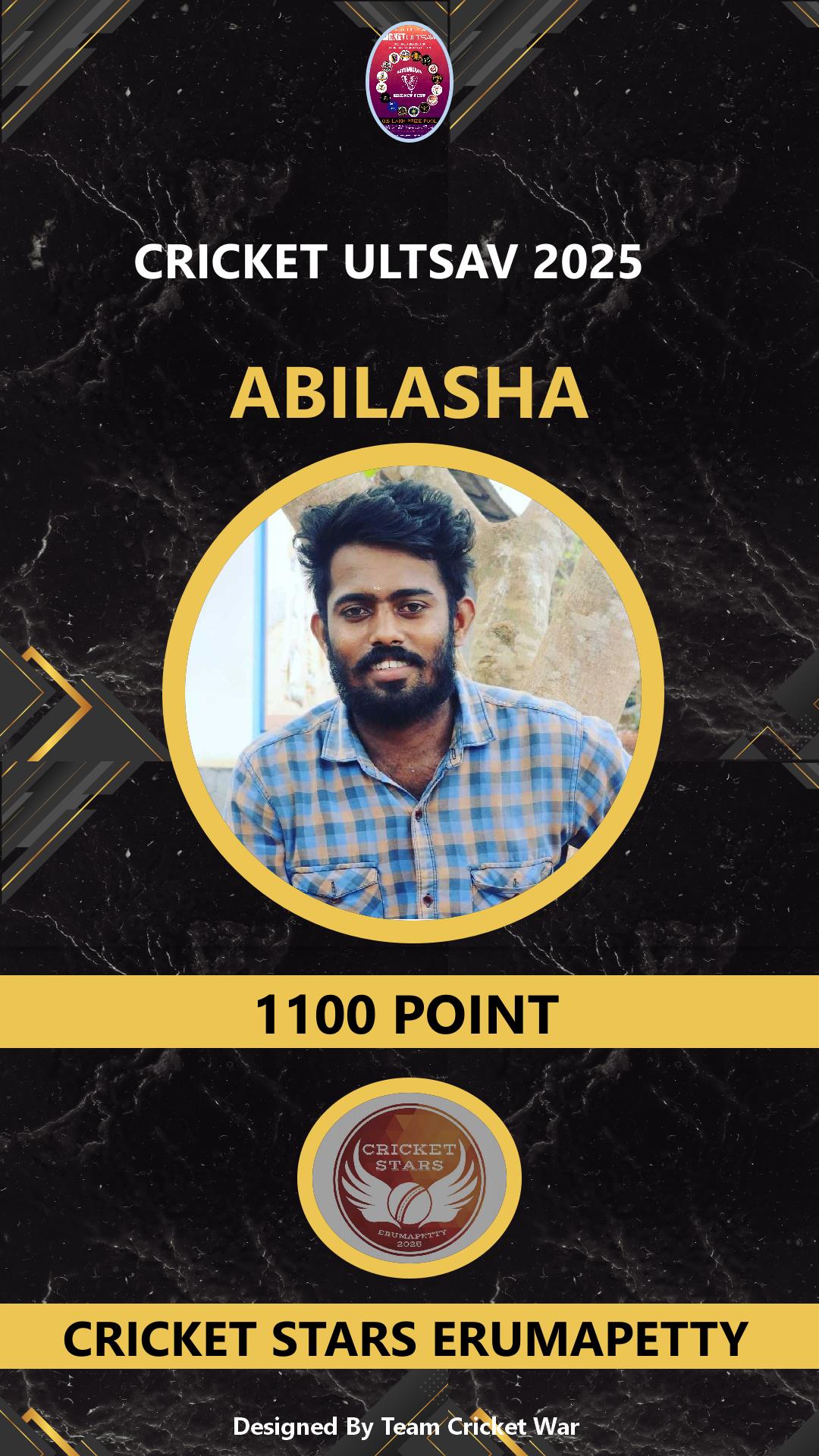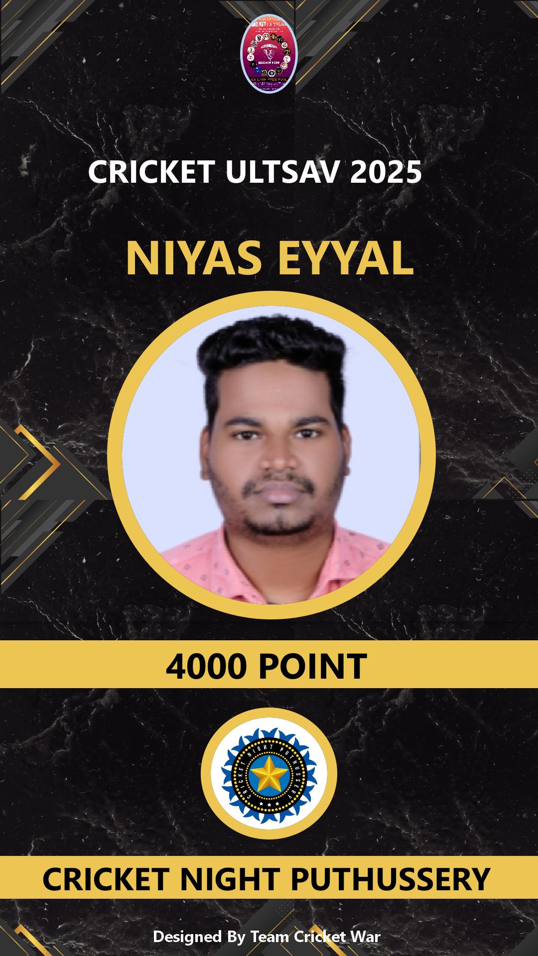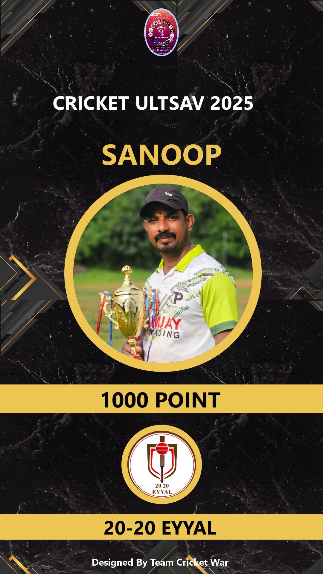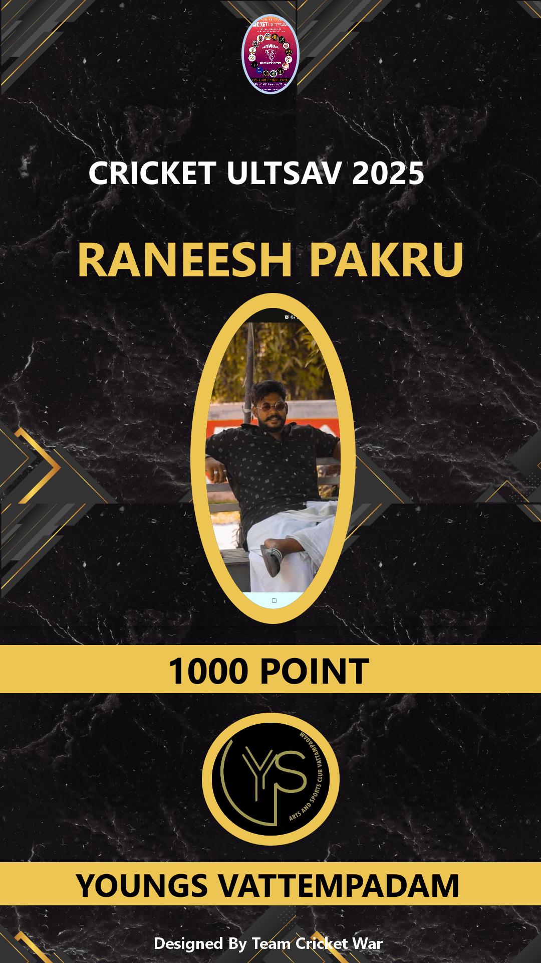 ALLROUNDER, AGE : 30 EYYAL Bid Amount : 1100 Team : CRICKET STARS ERUMAPETTY Download ID Card VIEW PROFILE |