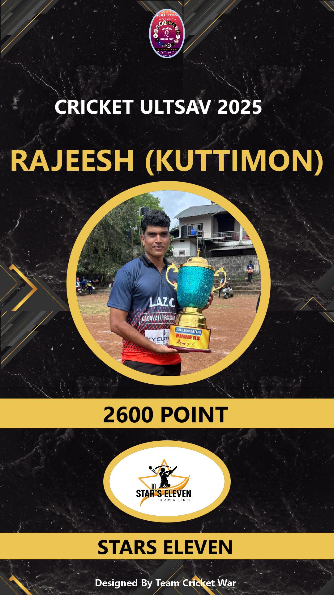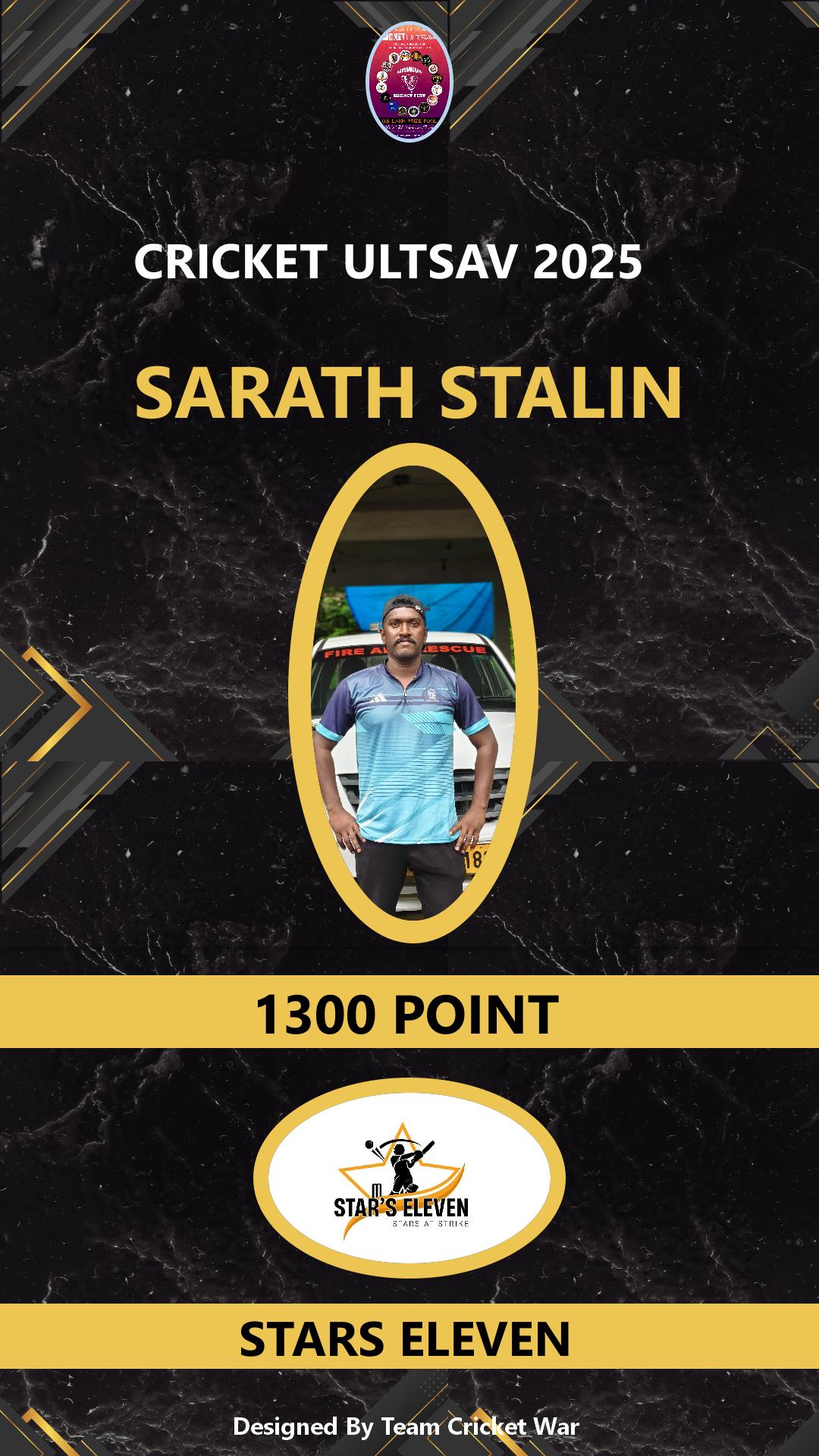ALLROUNDER, AGE : 35 KURUKKAN PARA Bid Amount : 1100 Team : STARS ELEVEN Download ID Card VIEW PROFILE |