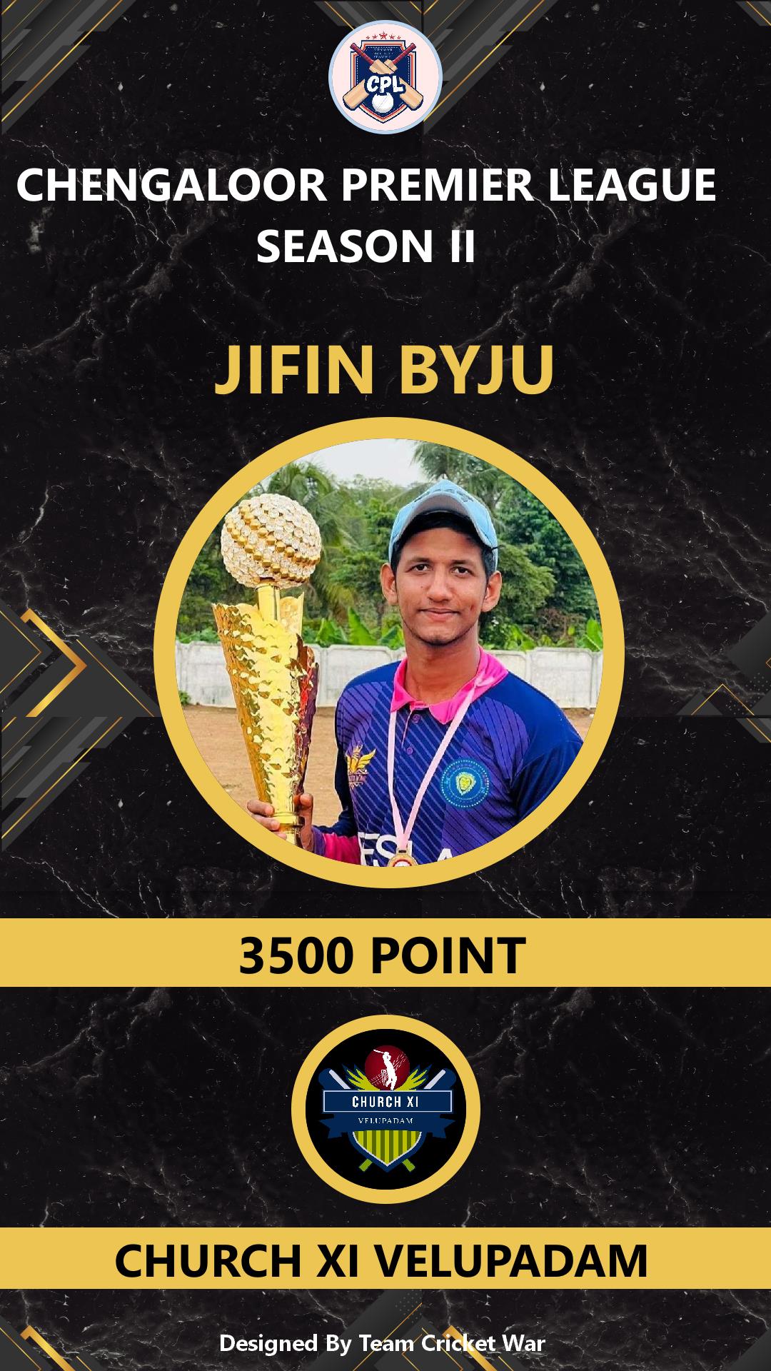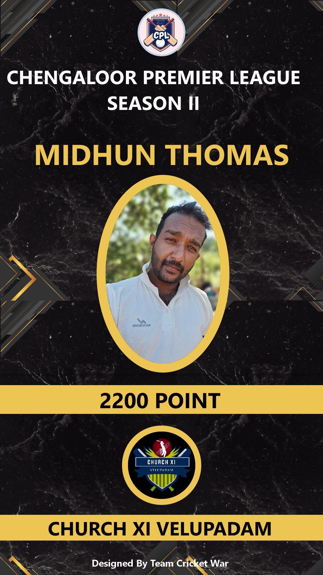 ALLROUNDER, AGE : 25 VARANDARAPILLY Bid Amount : 1800 Team : CHURCH XI VELUPADAM Download ID Card VIEW PROFILE |
