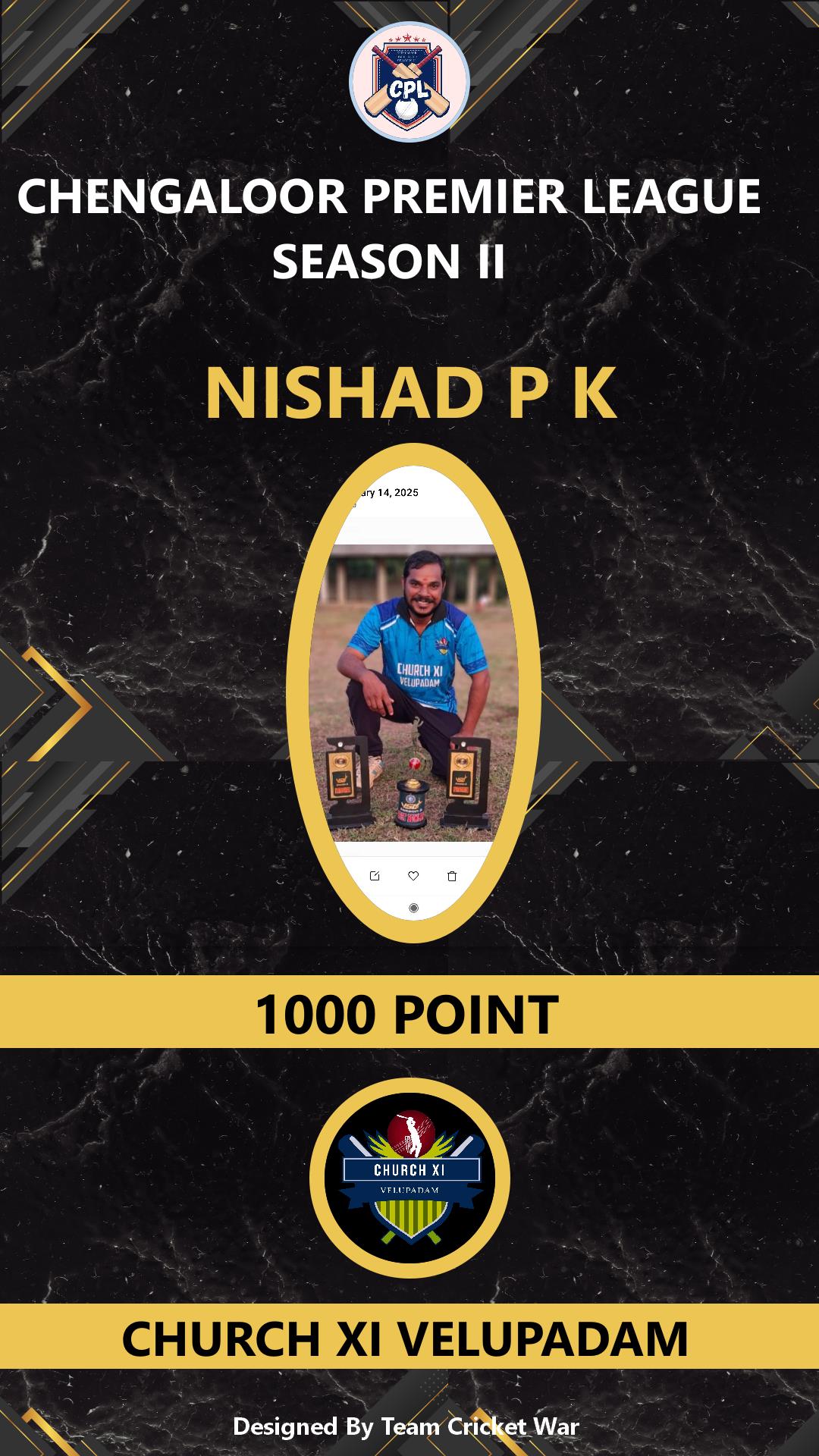 ALLROUNDER, AGE : 37 VELUPADAM Bid Amount : 8000 Team : CHURCH XI VELUPADAM Download ID Card VIEW PROFILE |