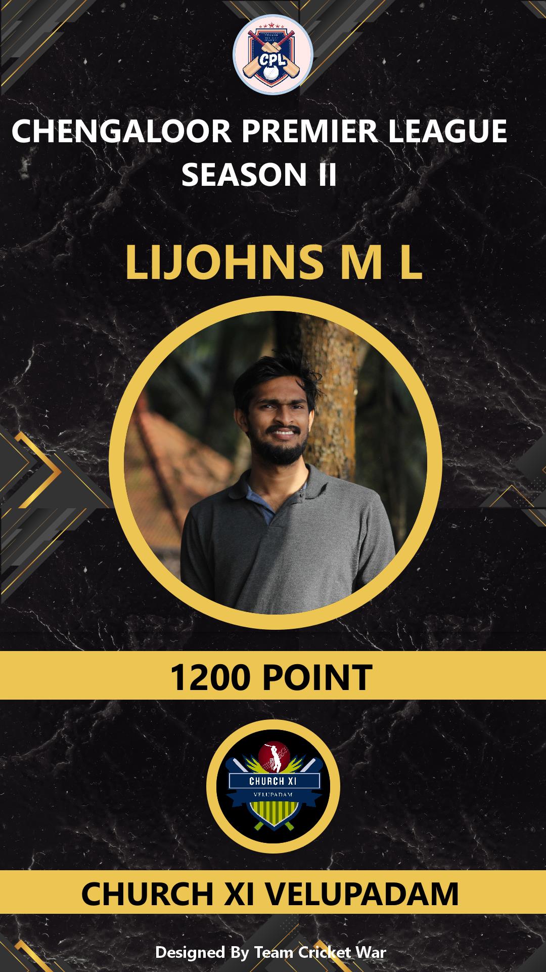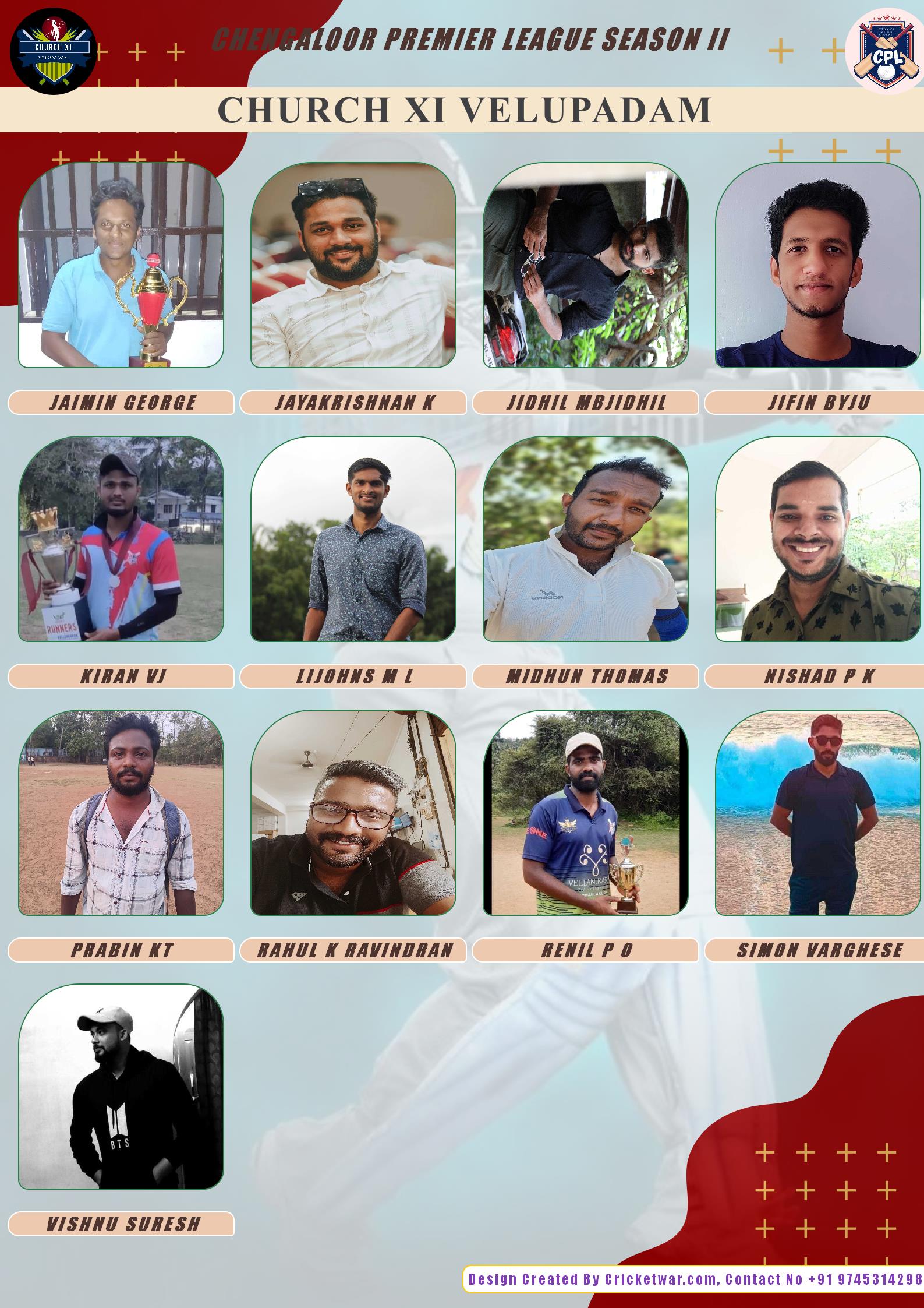 ALLROUNDER, AGE : 36 VELUPPADAM Bid Amount : 1100 Team : CHURCH XI VELUPADAM Download ID Card VIEW PROFILE |