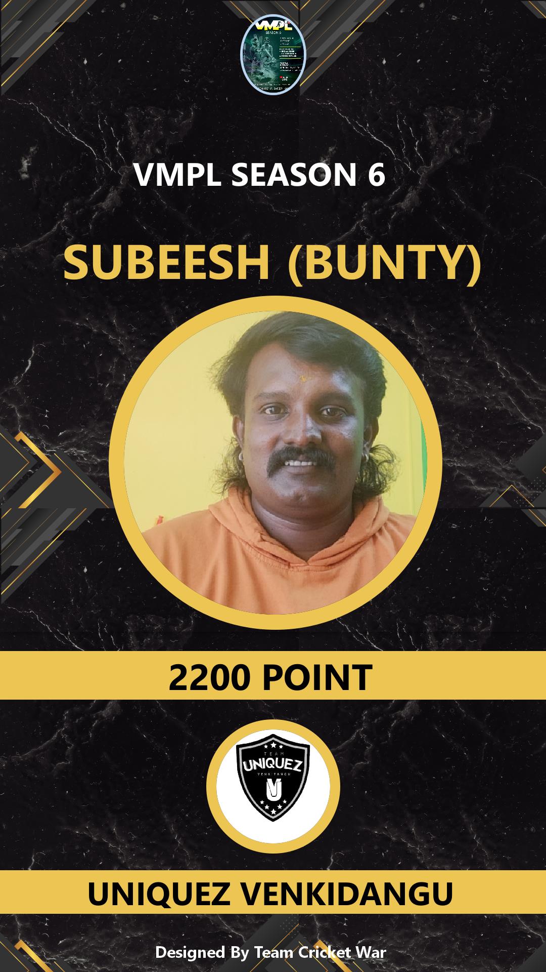 ALLROUNDER, AGE : 36 VENKIDANGU Bid Amount : 16000 Team : UNIQUEZ VENKIDANGU Download ID Card VIEW PROFILE |