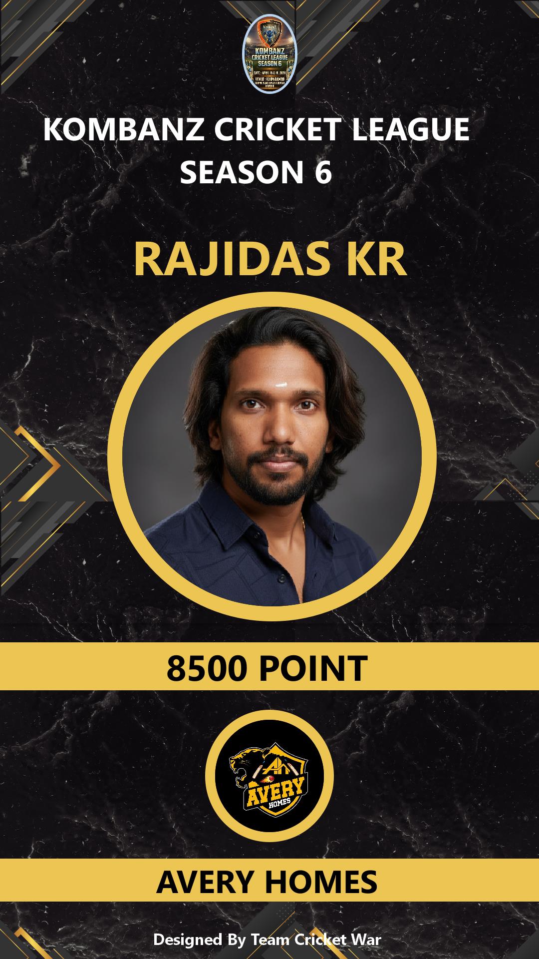 ALLROUNDER, AGE : 33 KAIPARAMBU Bid Amount : 800 Team : AVERY HOMES Download ID Card VIEW PROFILE |