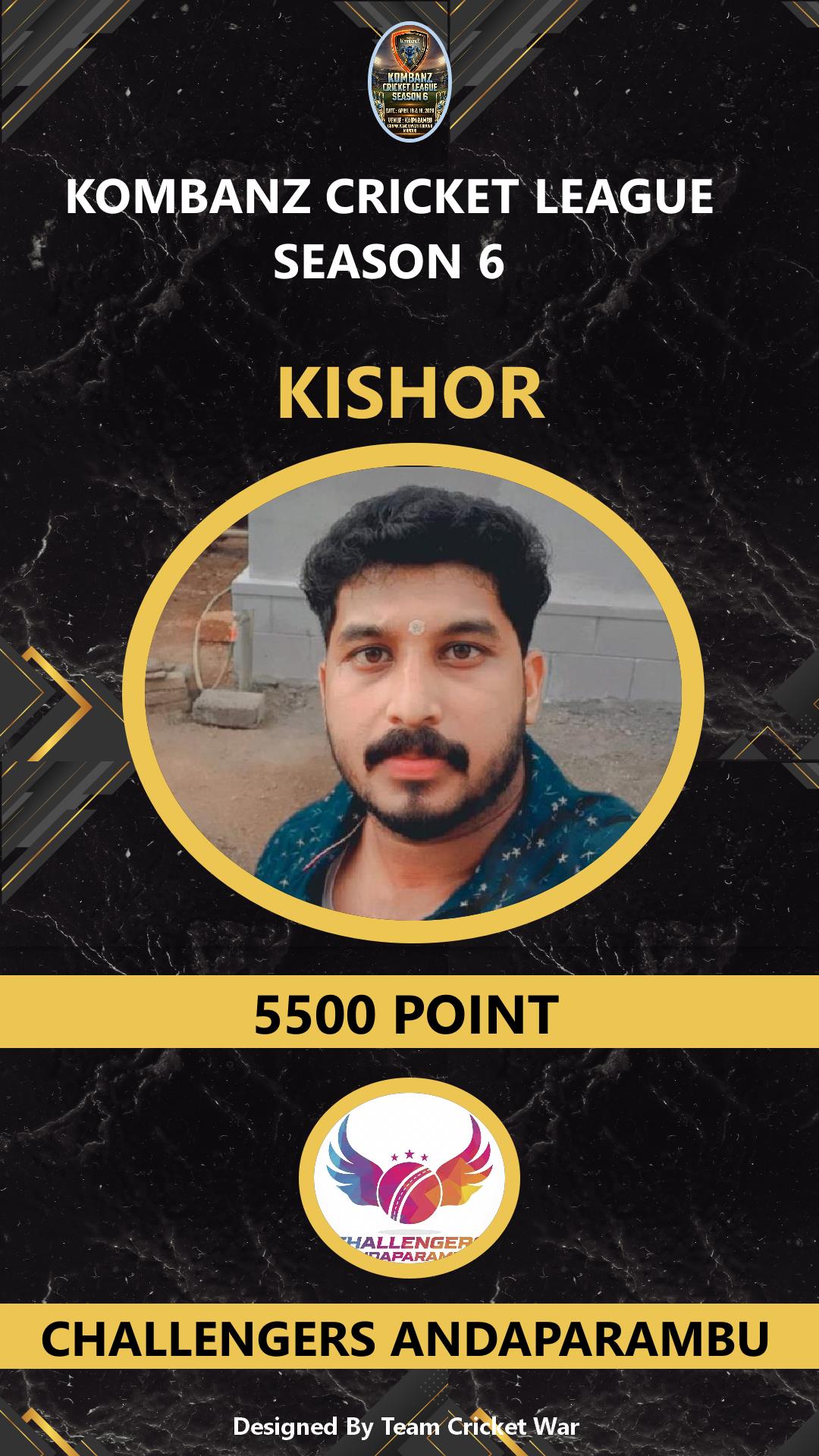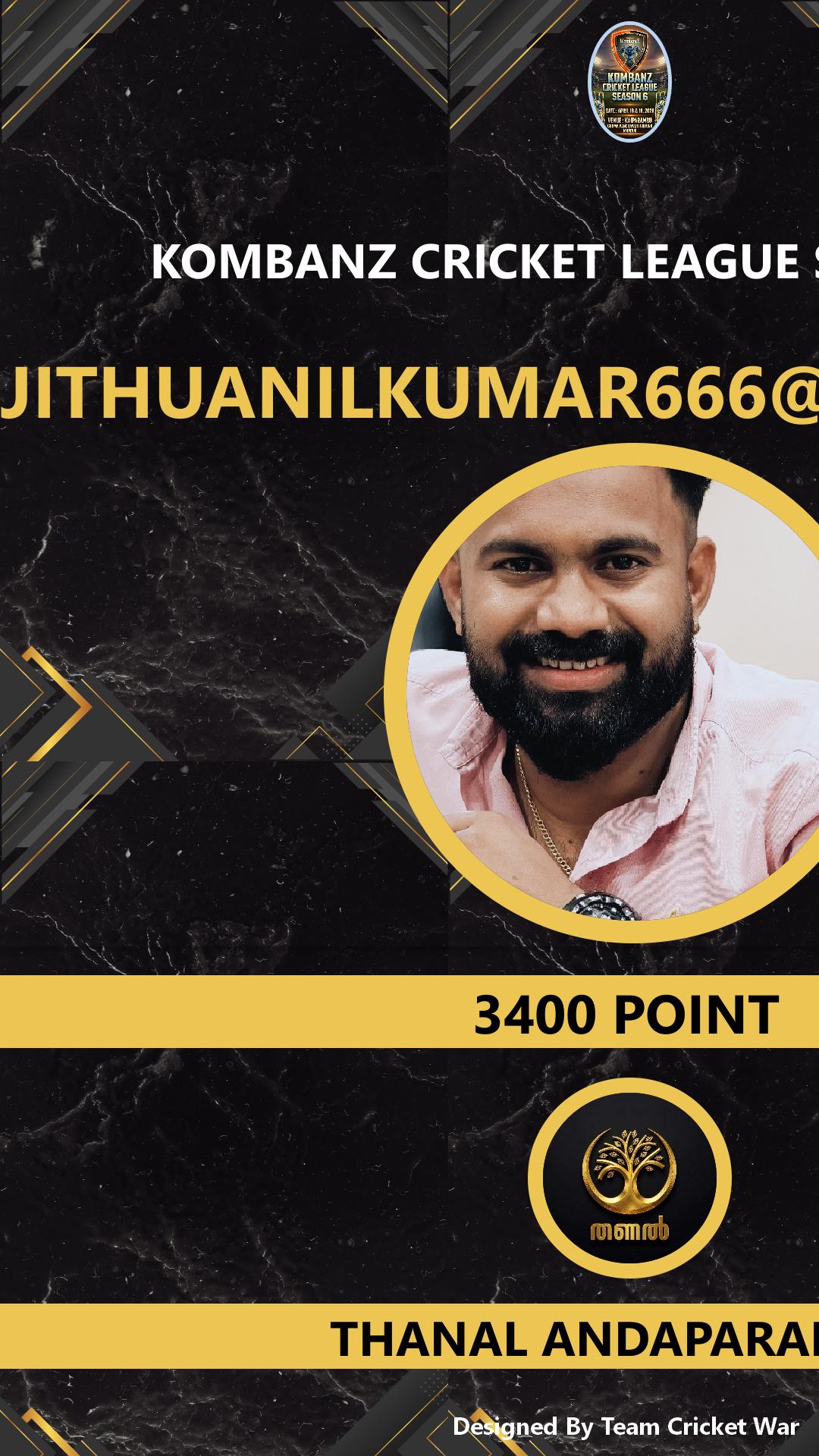 ALLROUNDER, AGE : 28 THRISS Bid Amount : 500 Team : CHALLENGERS ANDAPARAMBU Download ID Card VIEW PROFILE |
