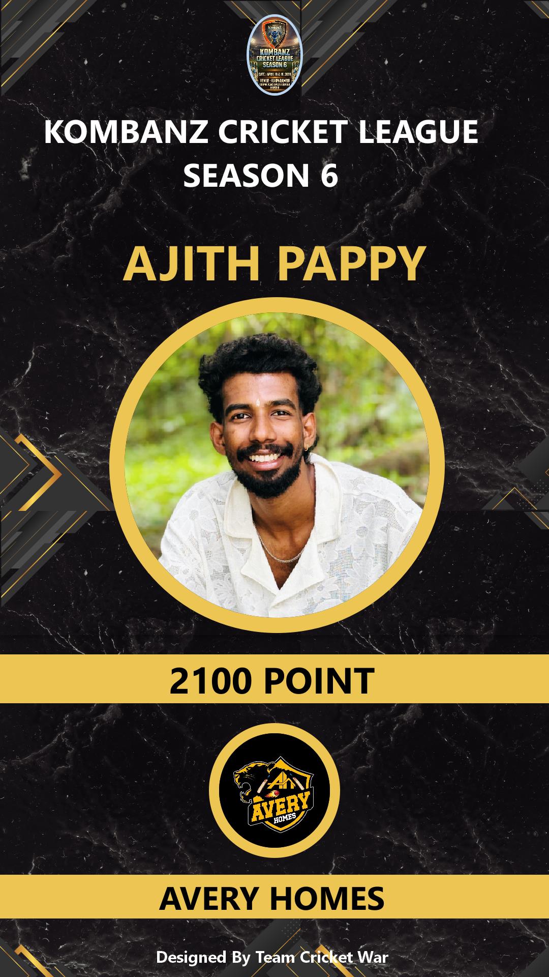 BOWLING ALLROUNDER, AGE : 26 PERAMANGALAM Bid Amount : 2100 Team : AVERY HOMES Download ID Card VIEW PROFILE |