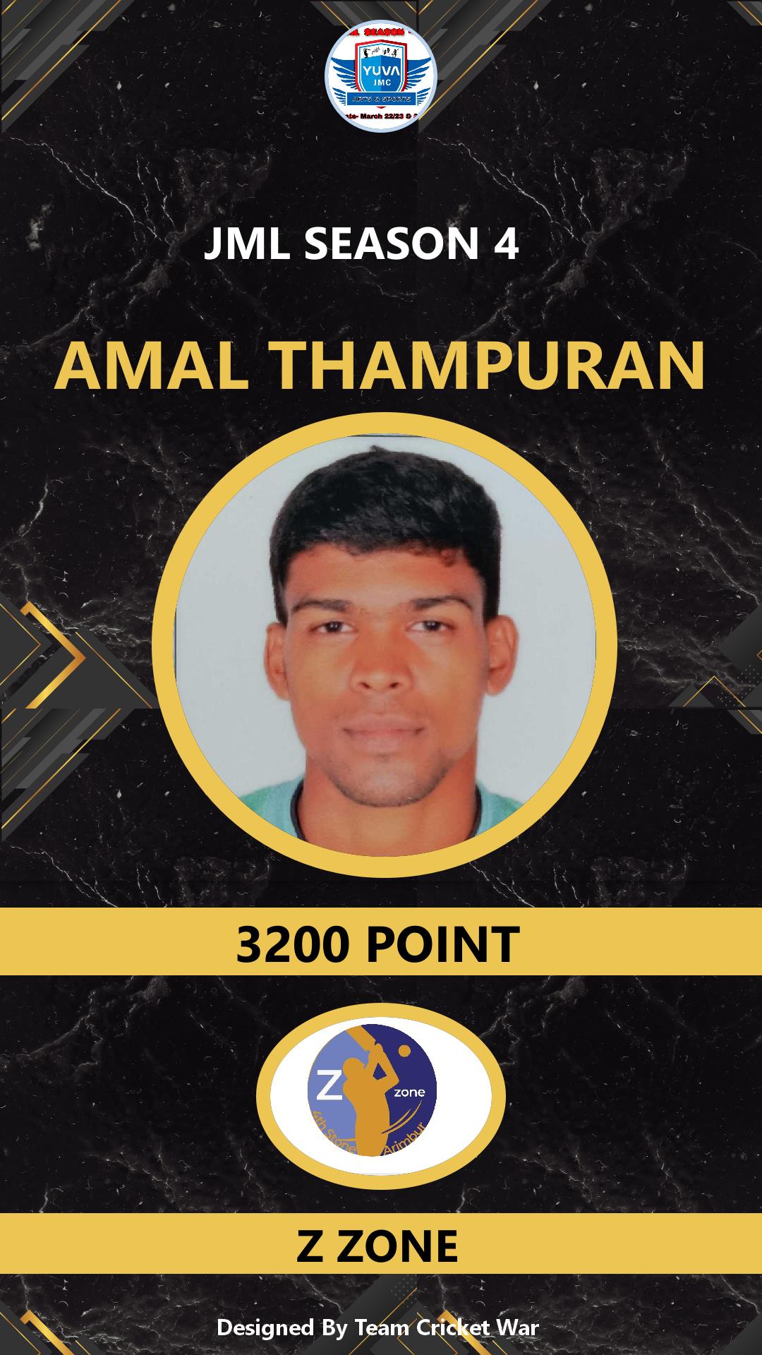 BATTING ALLROUNDER, AGE : 35 ARIMBUR Bid Amount : 3200 Team : Z ZONE Download ID Card VIEW PROFILE |