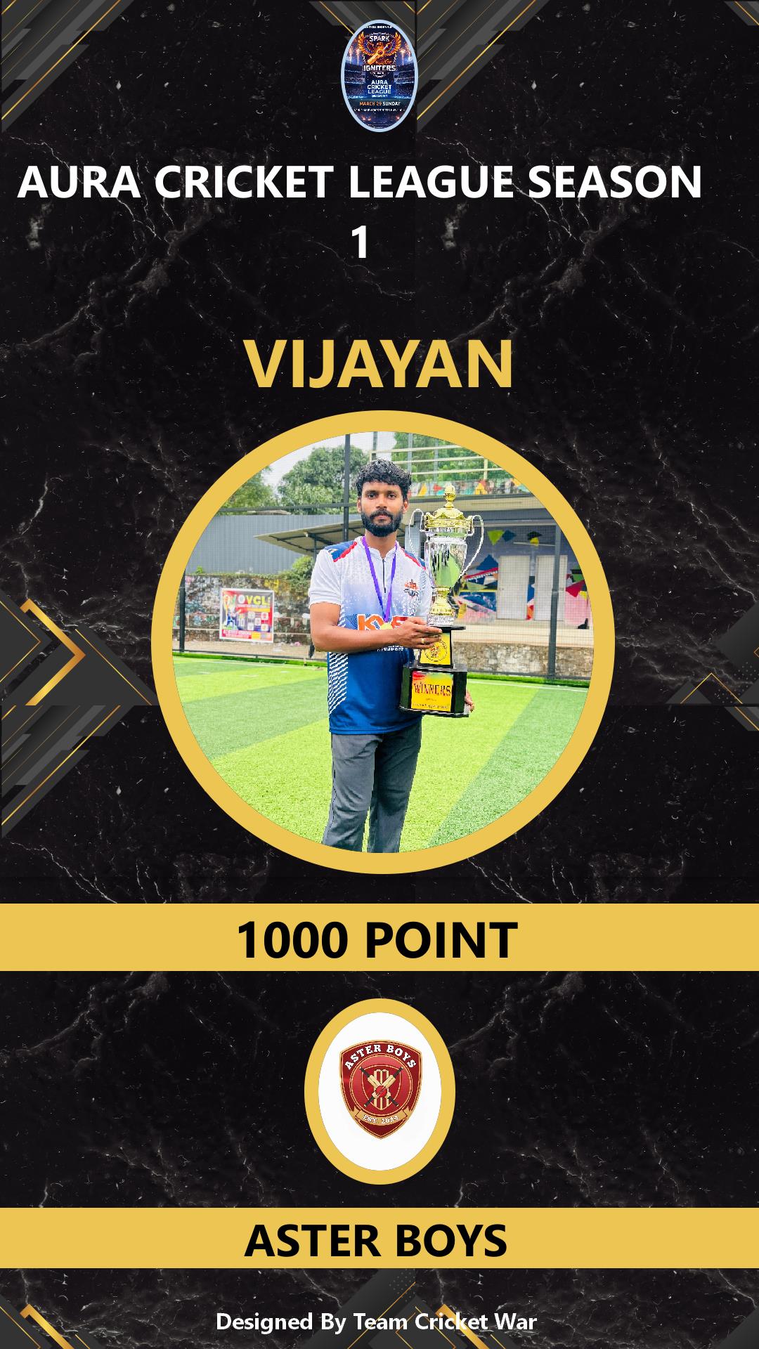BATTING ALLROUNDER, AGE : 1 VARAVATTOOR Bid Amount : 1000 Team : SUNBOYS Download ID Card VIEW PROFILE |