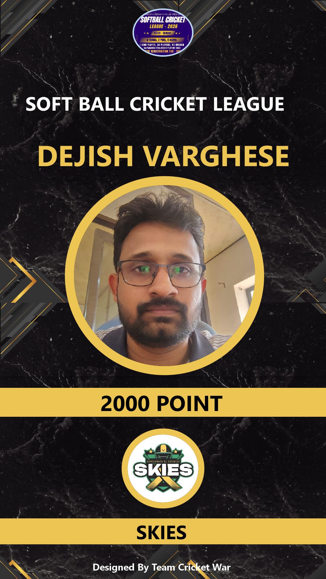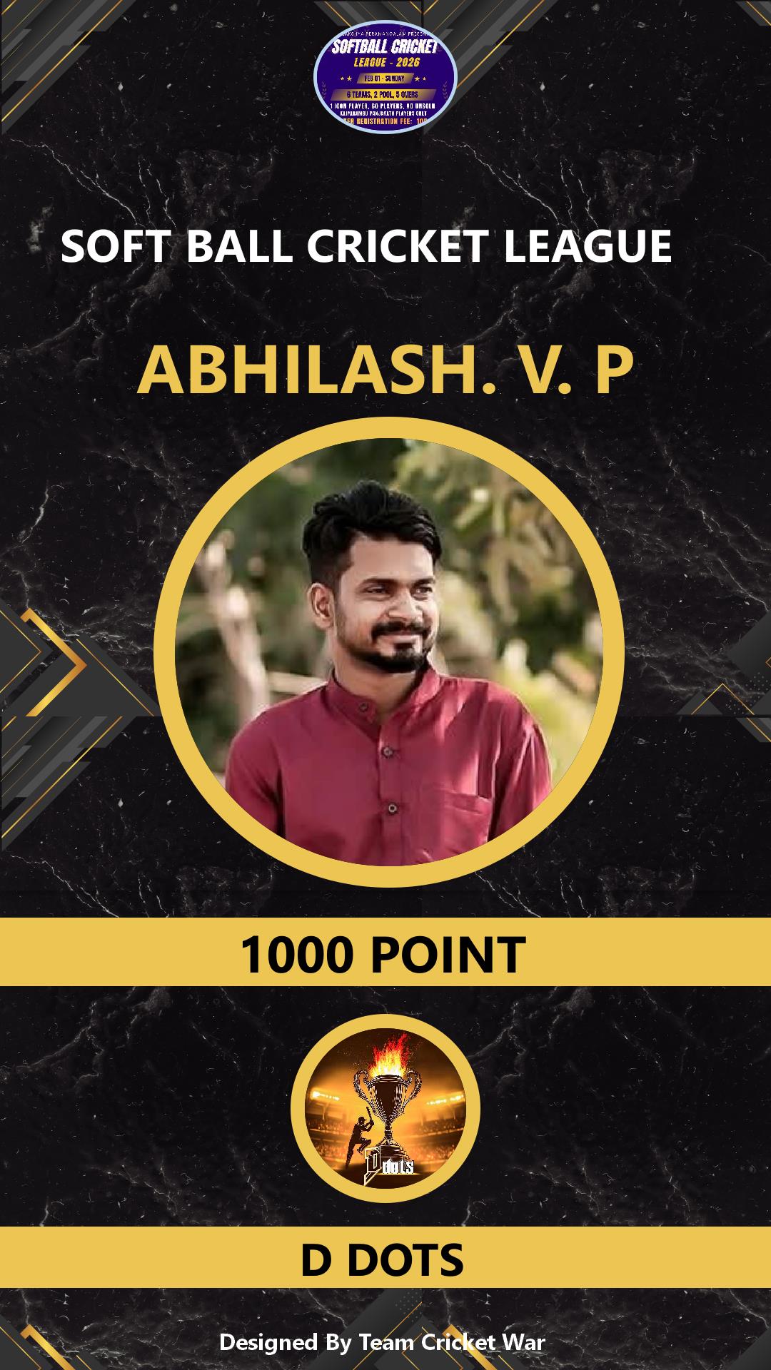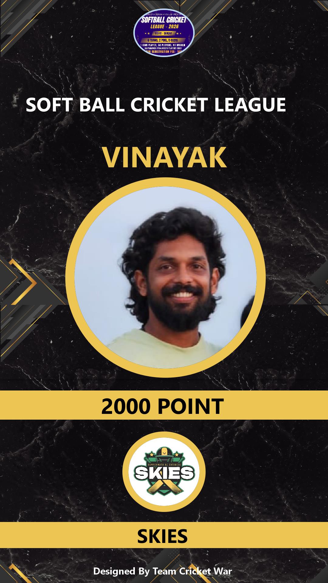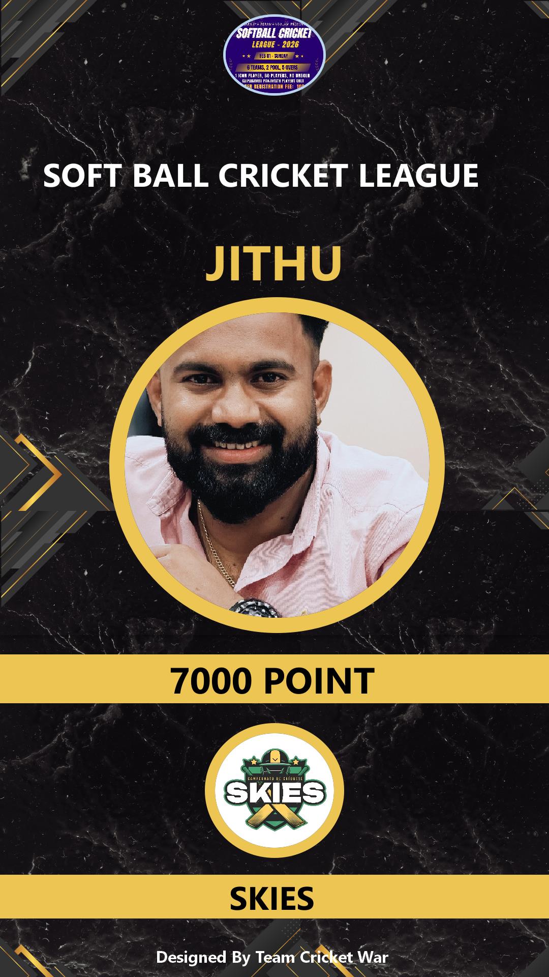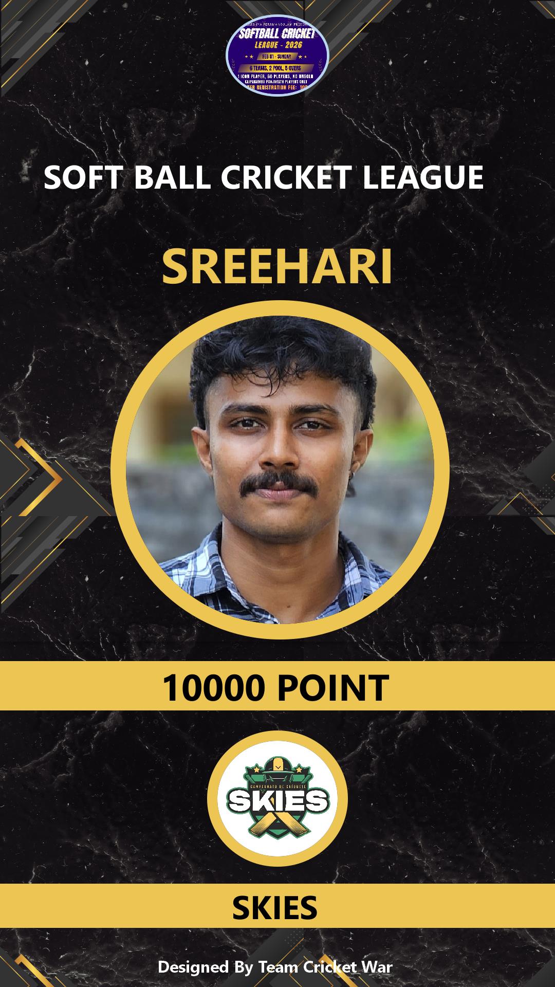 ALLROUNDER, AGE : 36 VARADIYAM Bid Amount : 1500 Team : SKIES Download ID Card VIEW PROFILE |