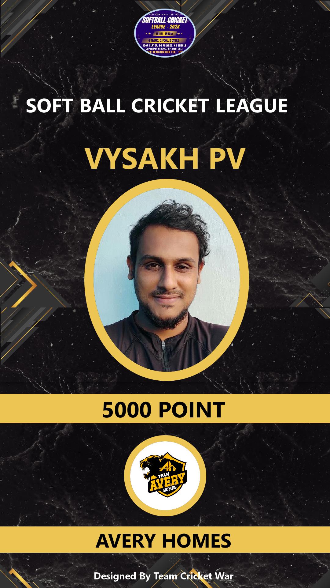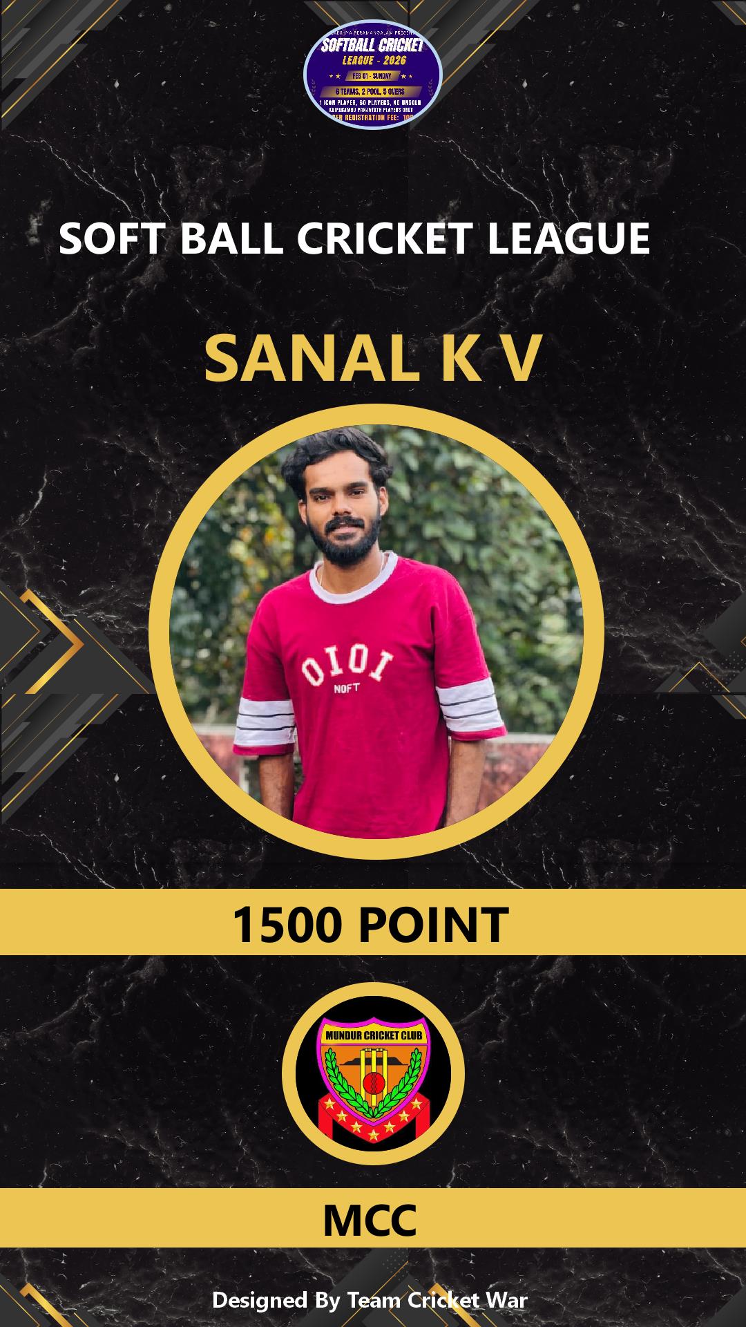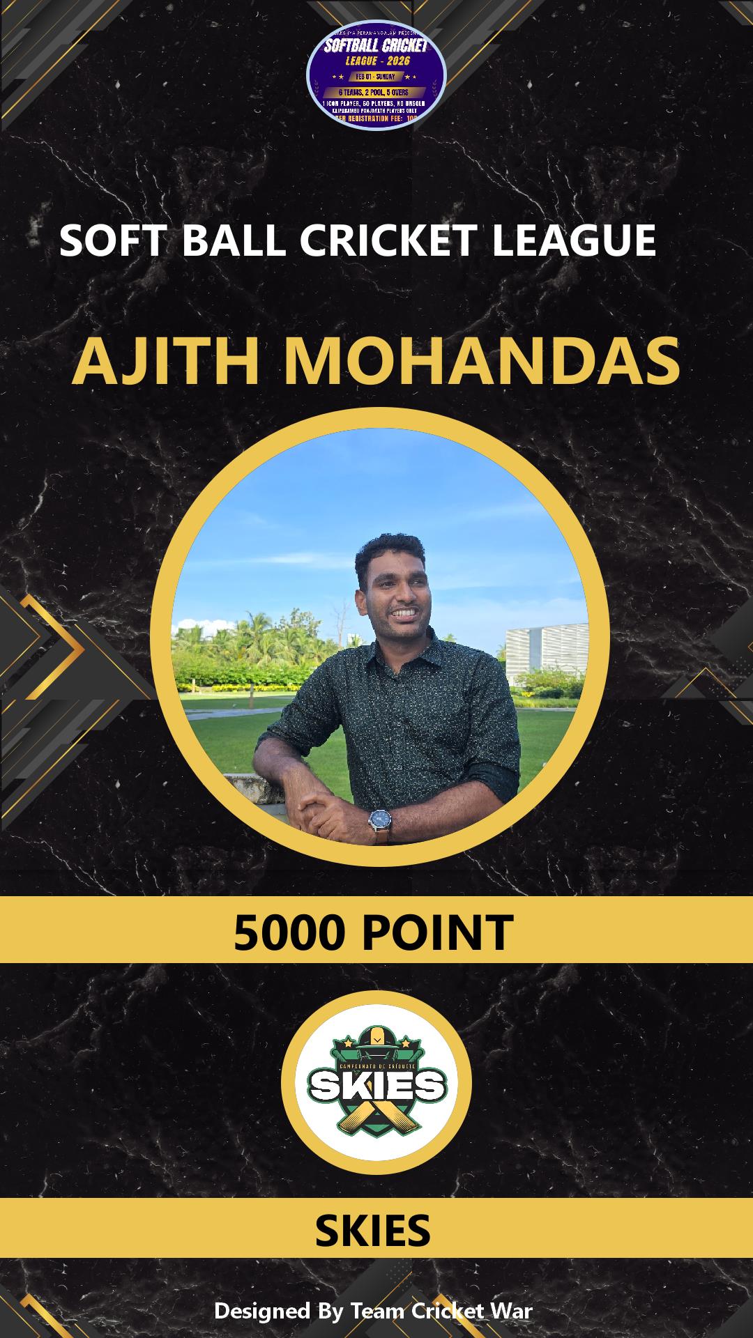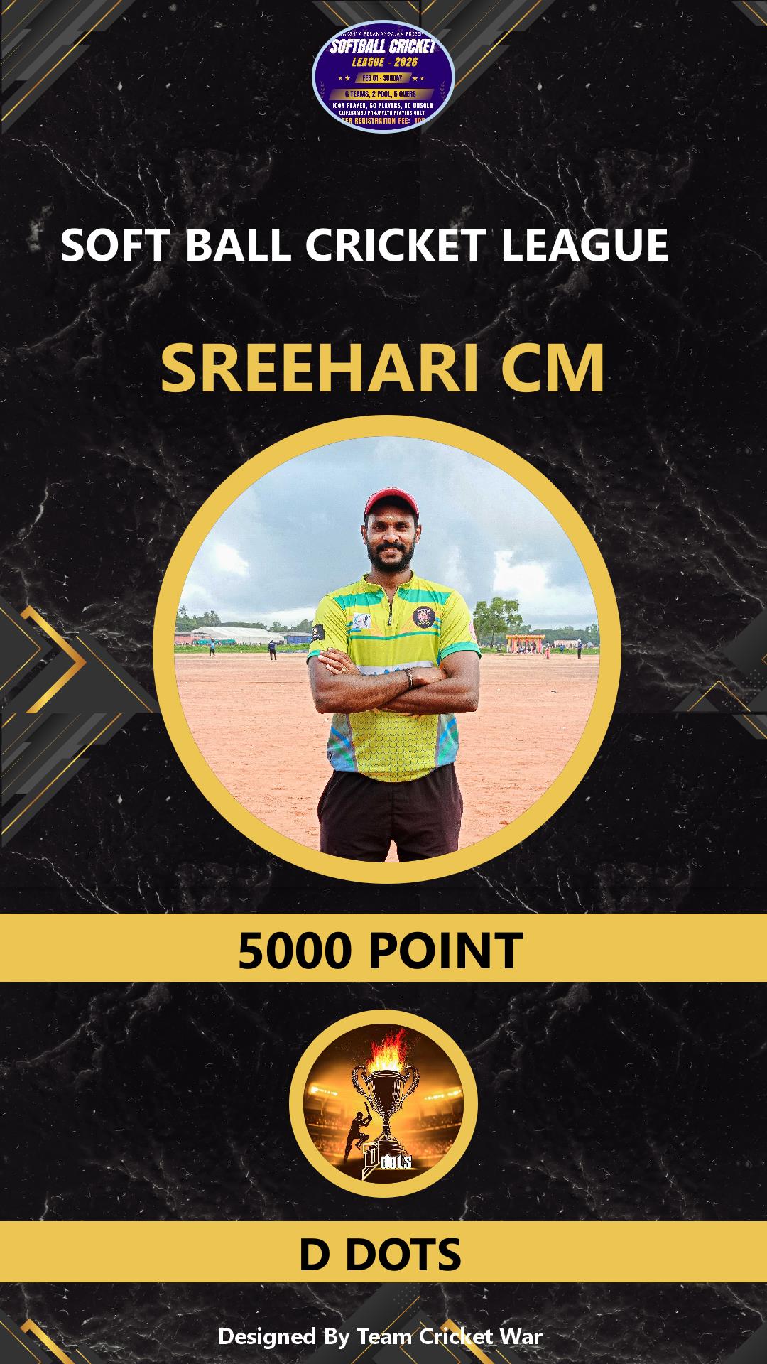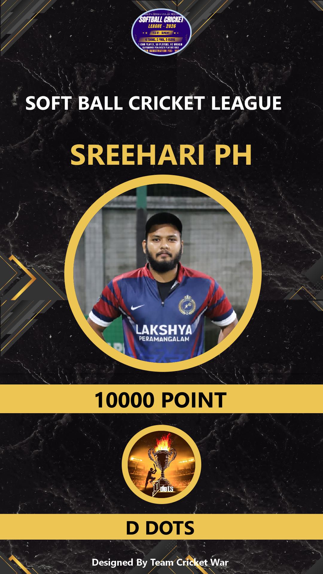 ALLROUNDER, AGE : 36 VARADIYAM Bid Amount : 1500 Team : SKIES Download ID Card VIEW PROFILE |