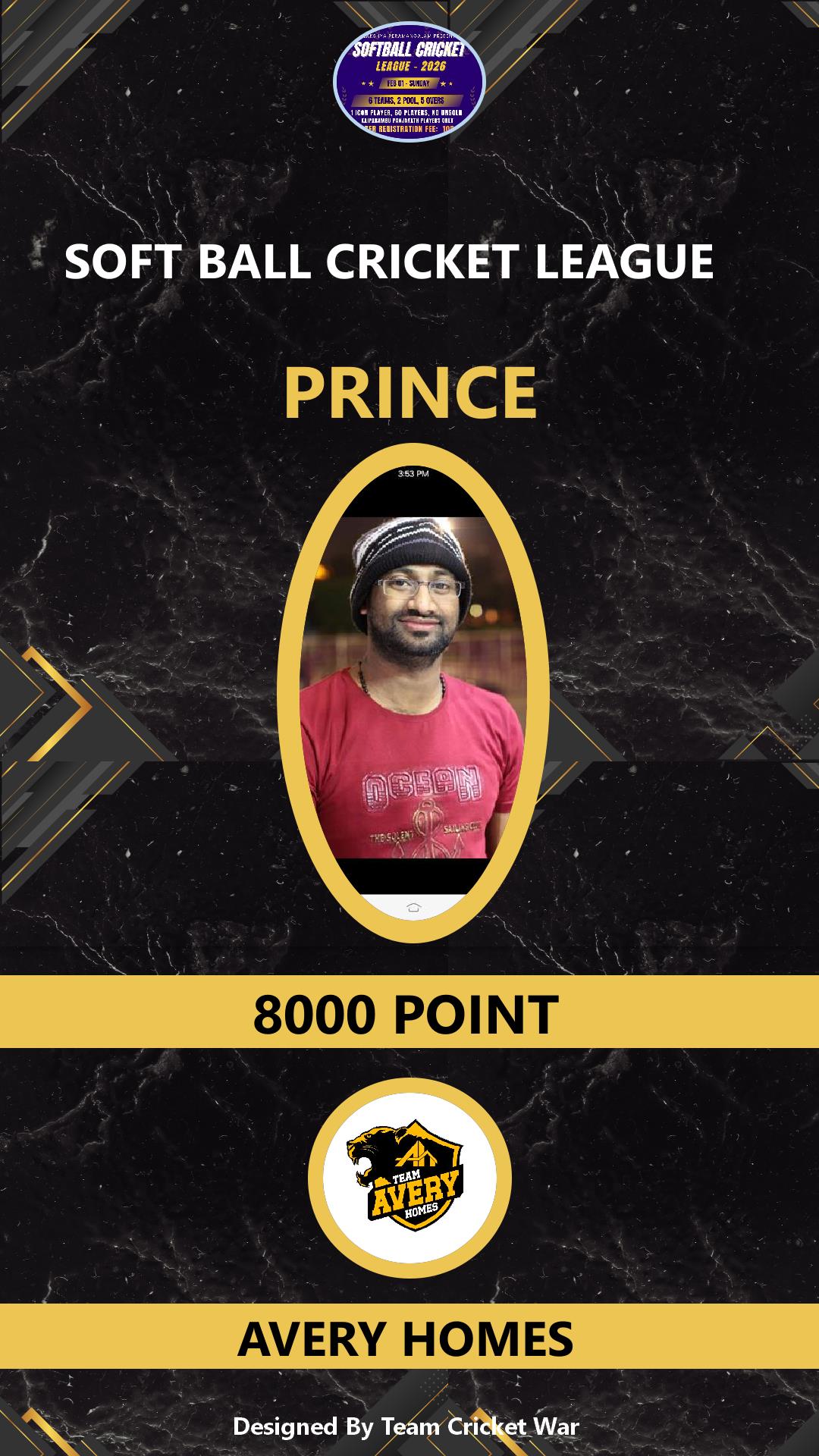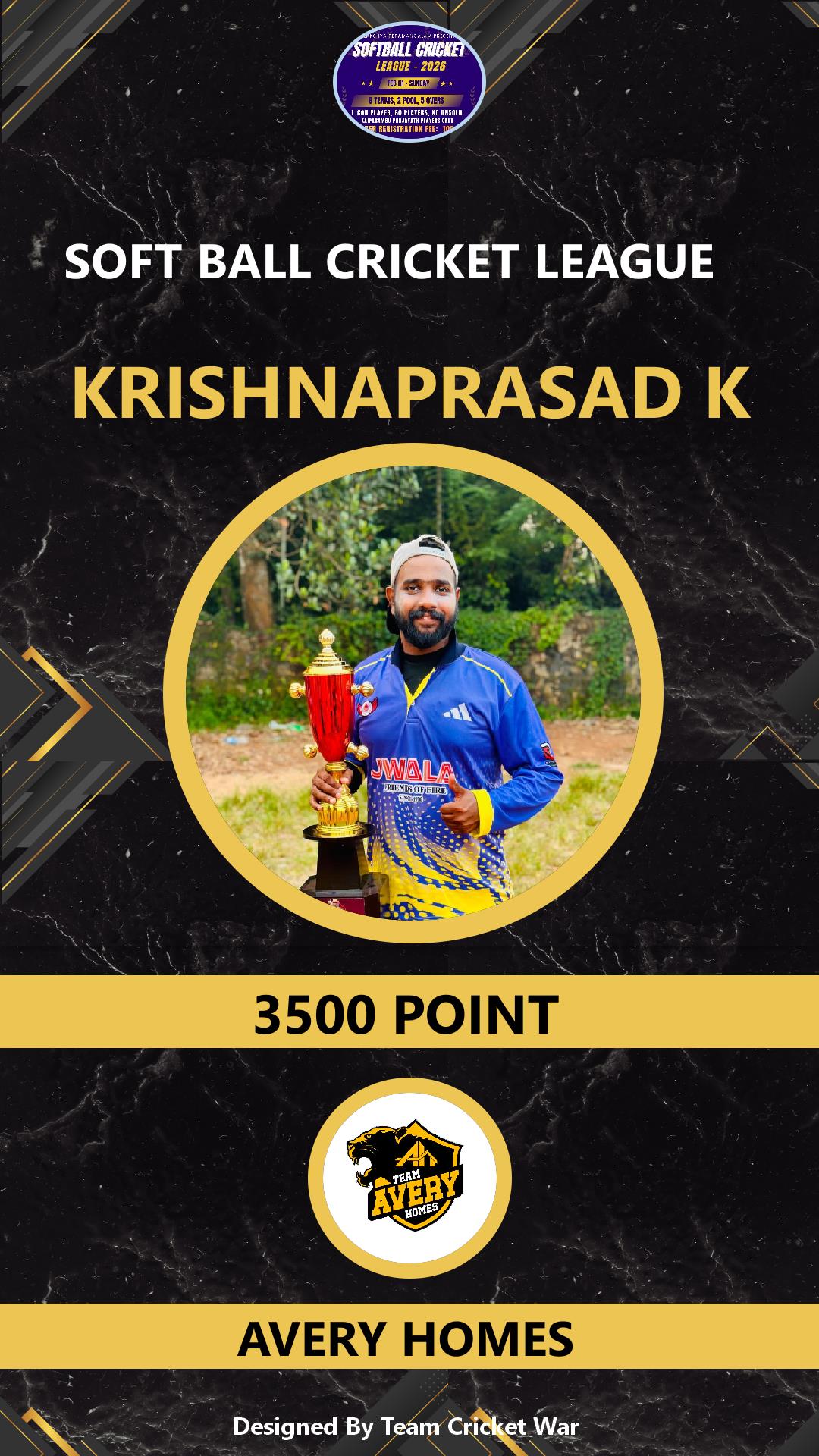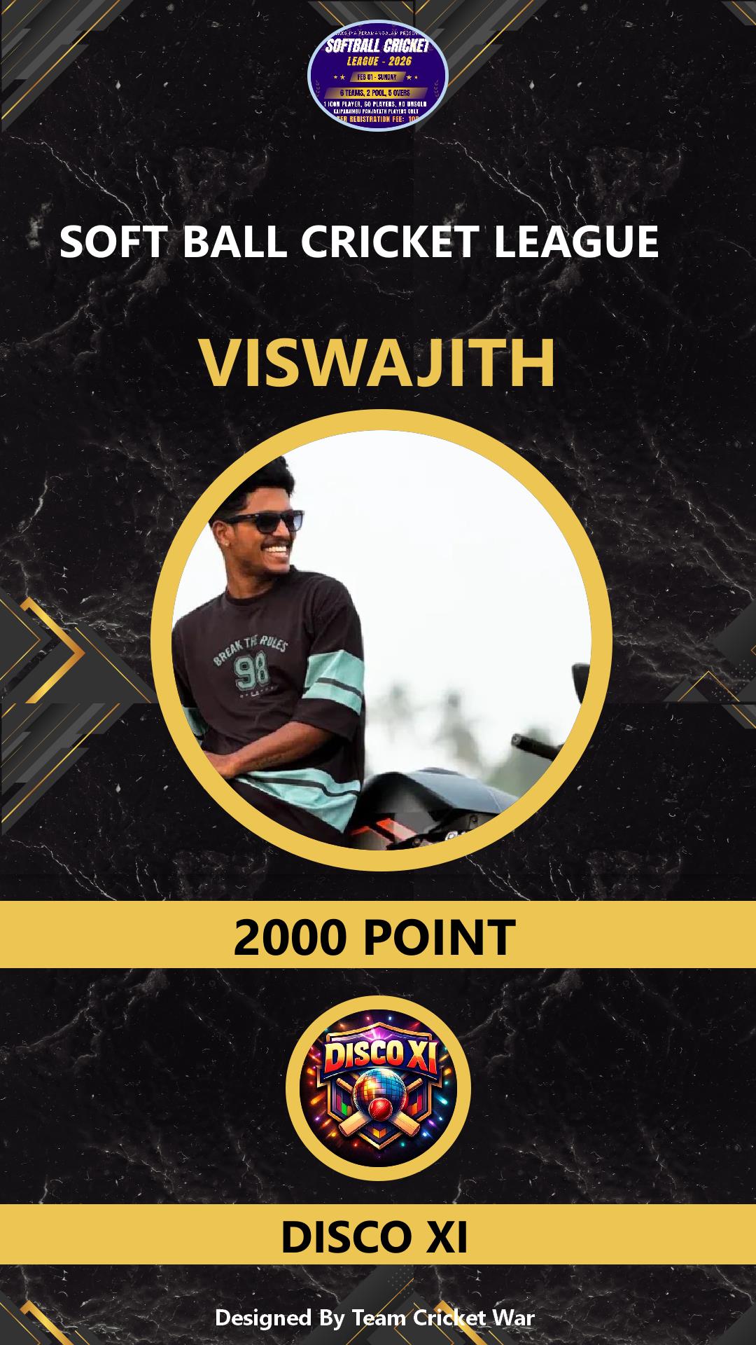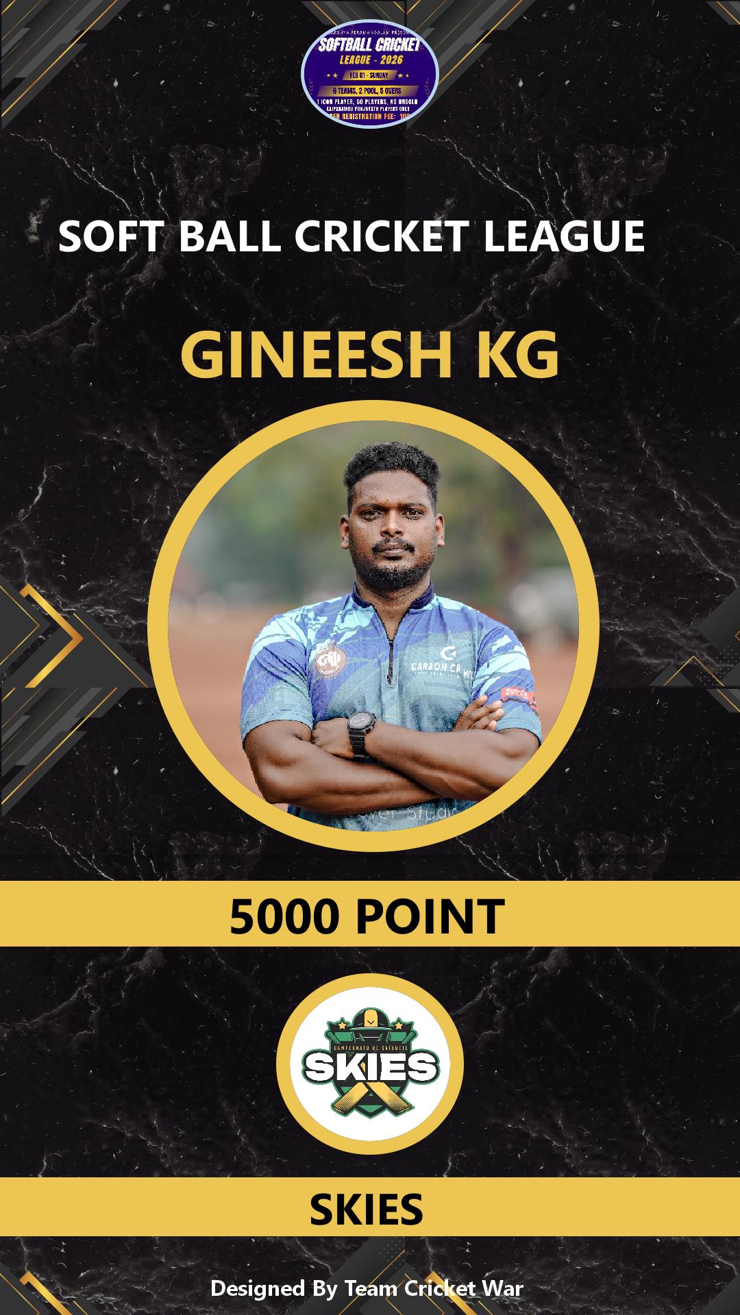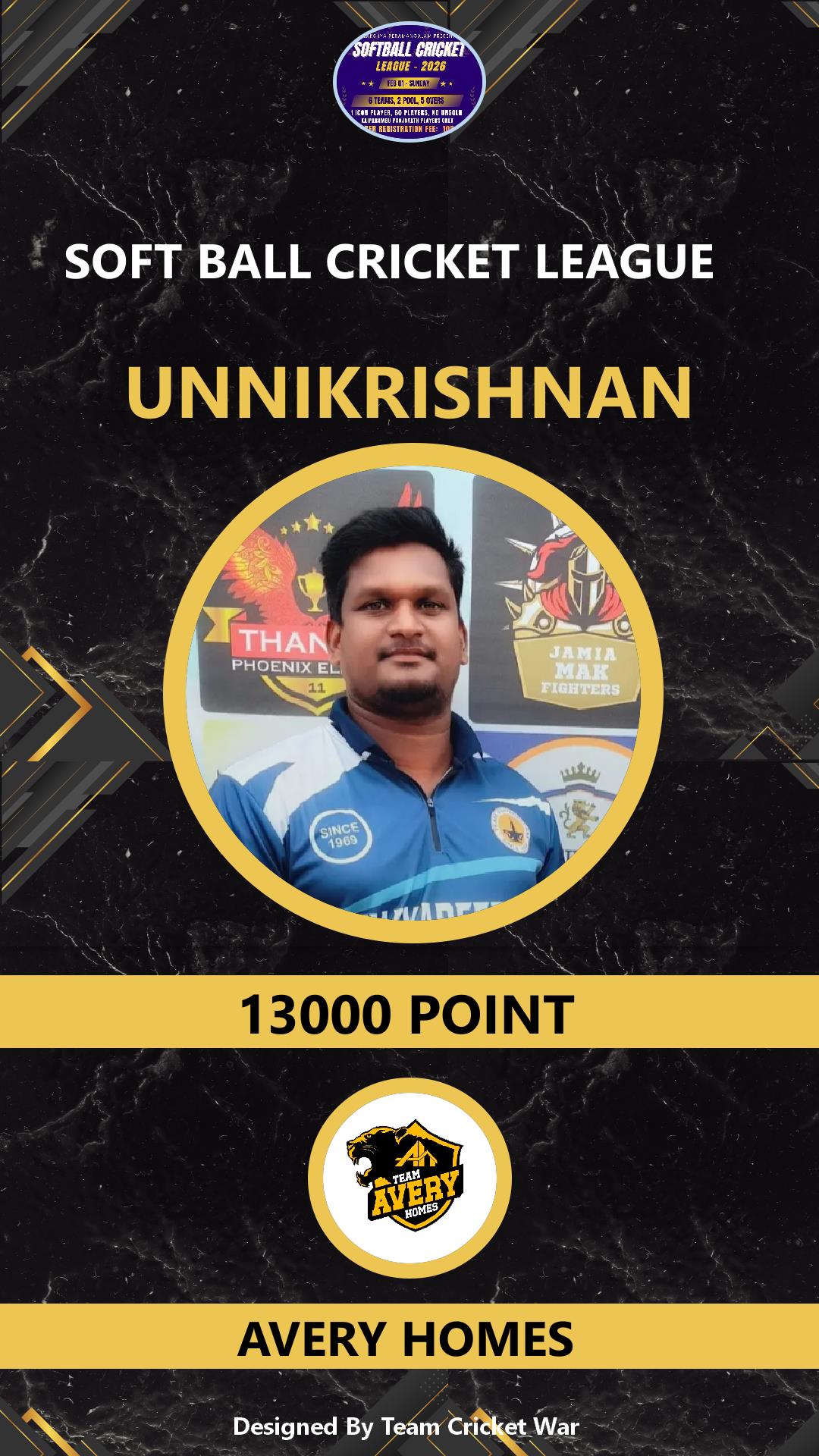 ALLROUNDER, AGE : 36 VARADIYAM Bid Amount : 1500 Team : SKIES Download ID Card VIEW PROFILE |