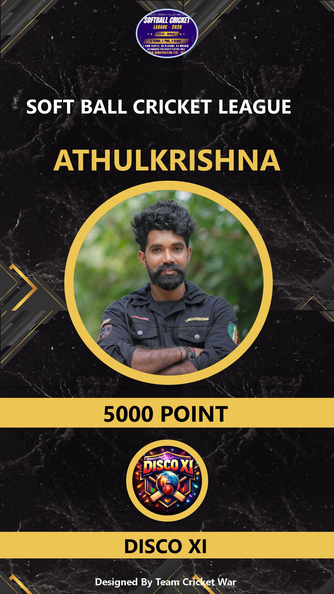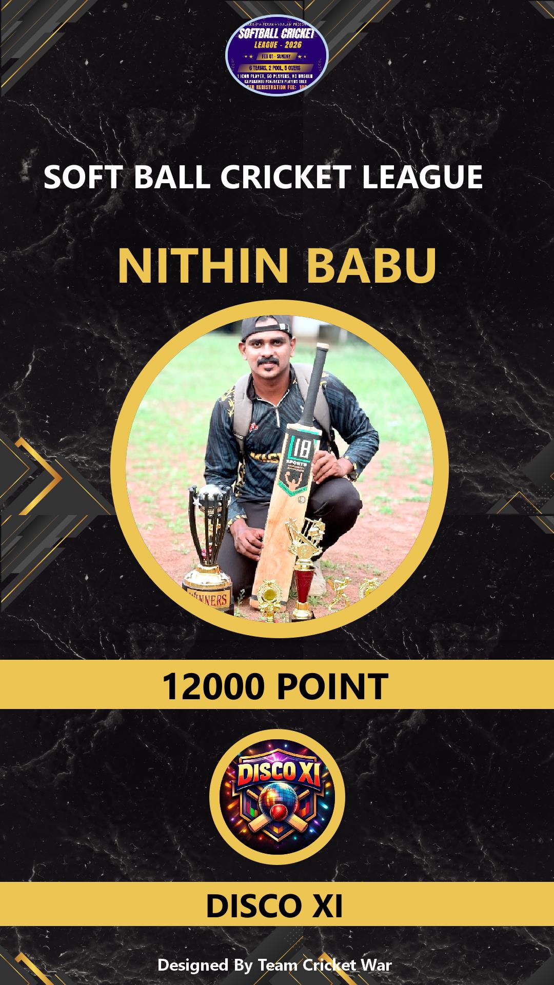 ALLROUNDER, AGE : 30 VARADIYAM Bid Amount : 12000 Team : DISCO XI Download ID Card VIEW PROFILE |