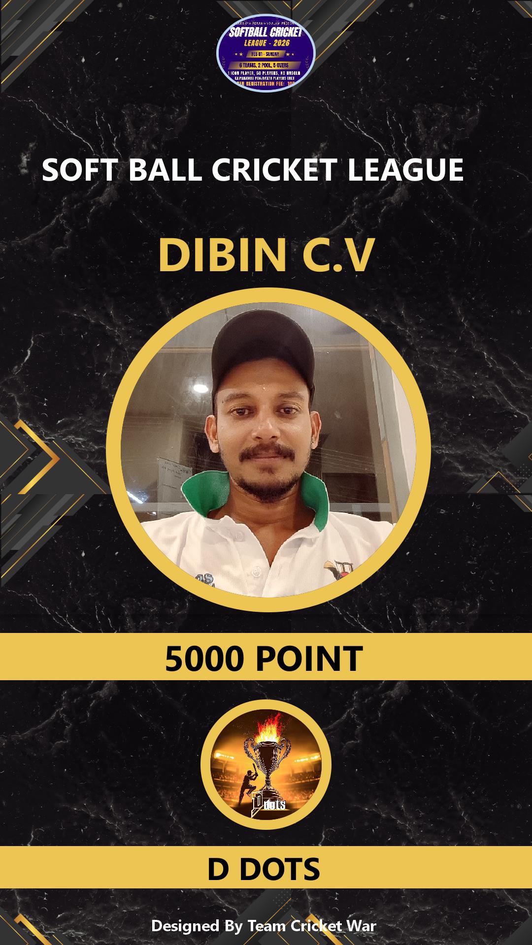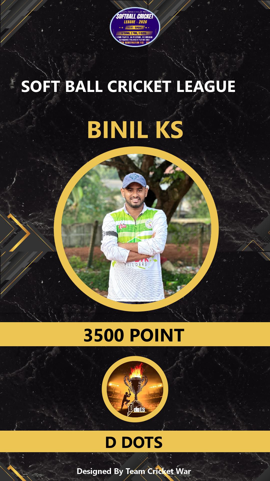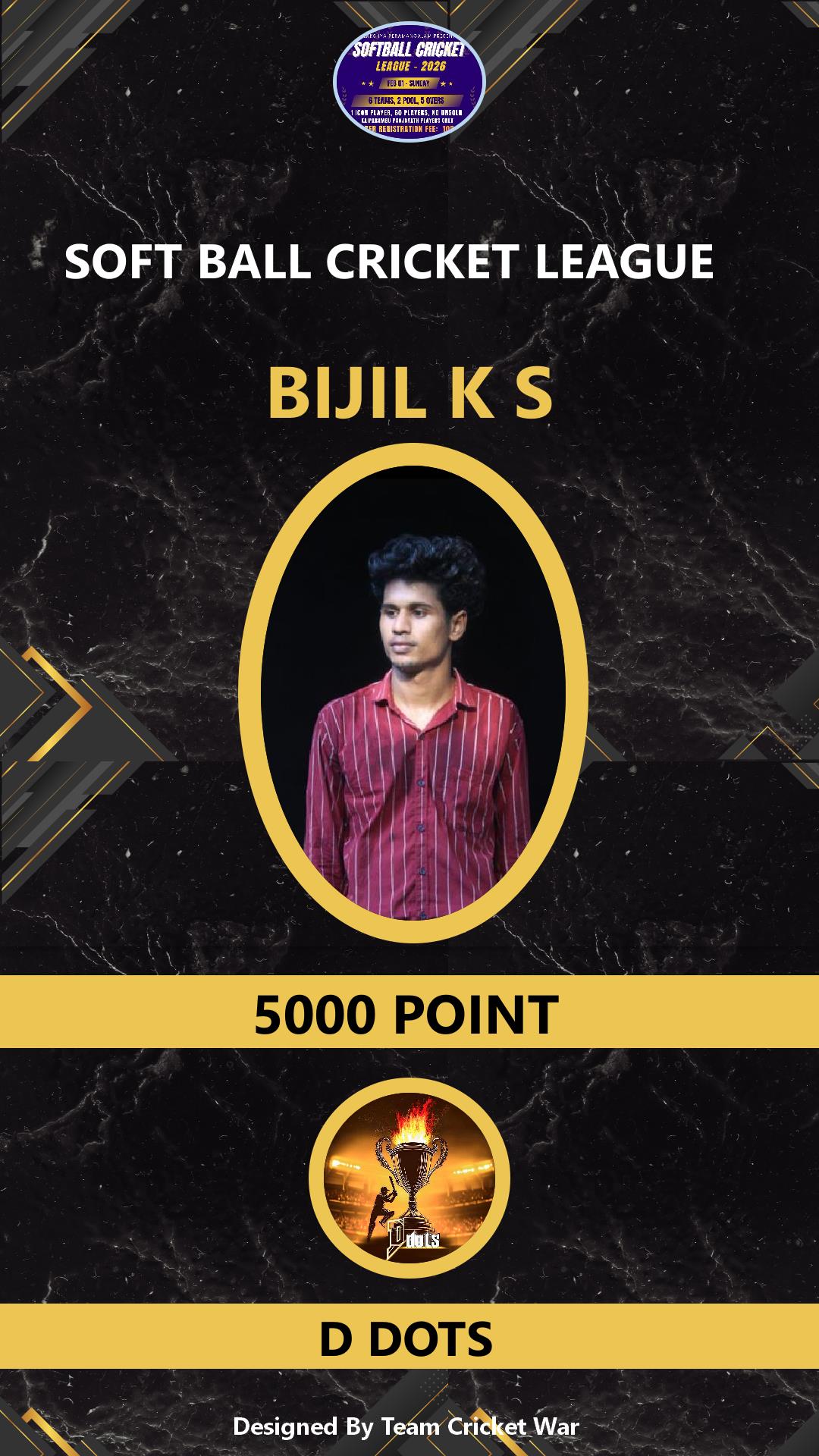 BOWLING ALLROUNDER, AGE : 38 Bid Amount : 1000 Team : D DOTS Download ID Card VIEW PROFILE |