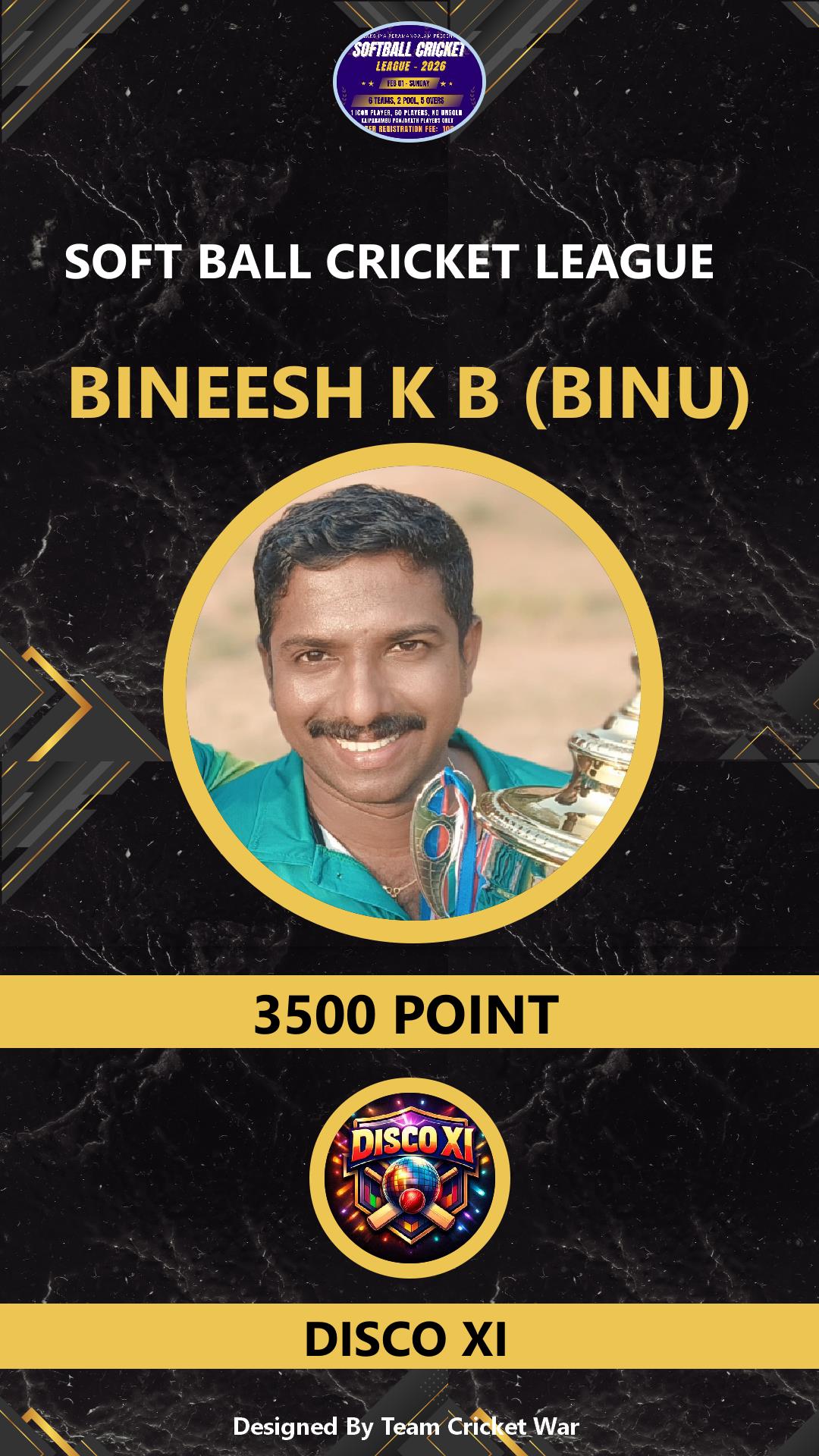 ALLROUNDER, AGE : 0 PERAMANGALAM Bid Amount : 2000 Team : DISCO XI Download ID Card VIEW PROFILE |