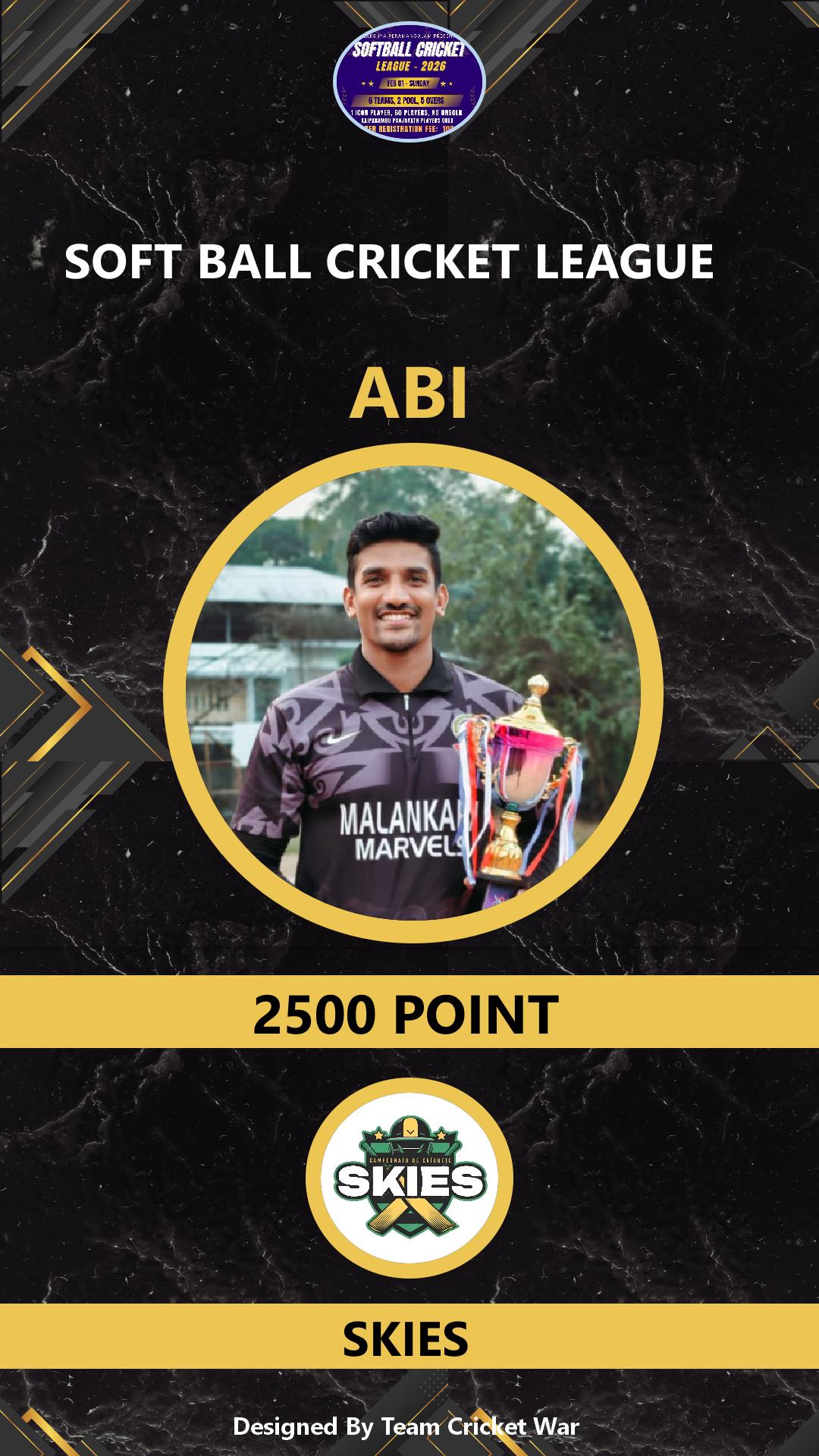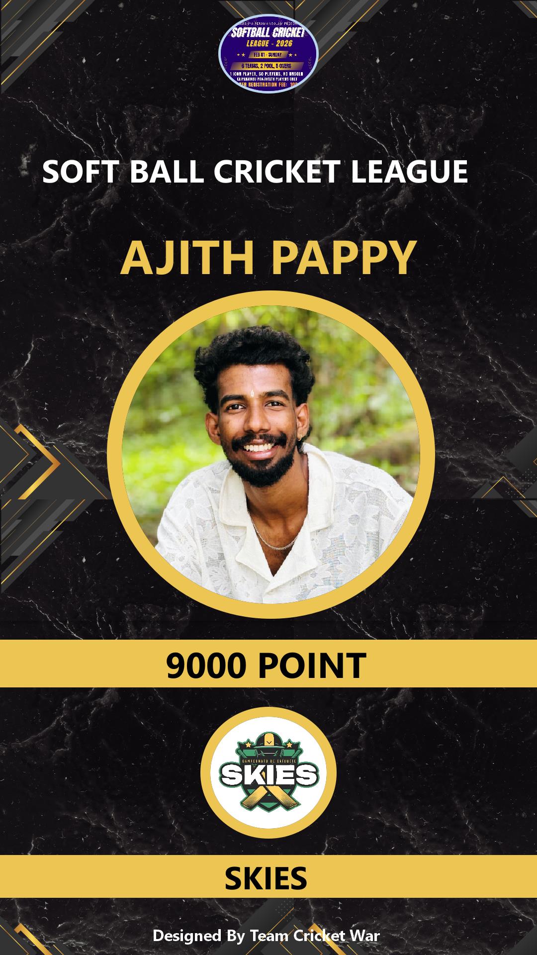 ALLROUNDER, AGE : 1 VARADIYAM Bid Amount : 2500 Team : SKIES Download ID Card VIEW PROFILE |