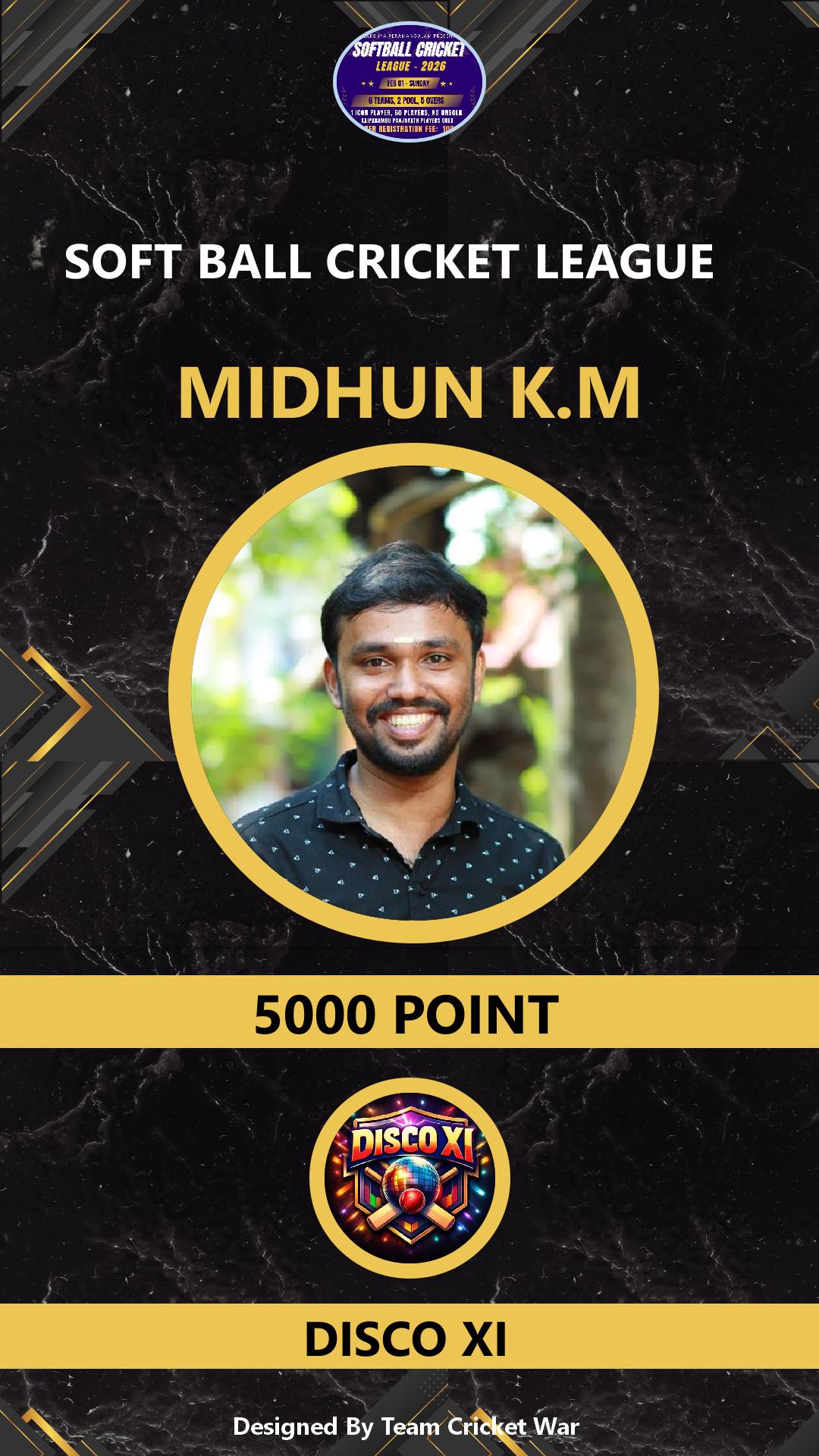 BATTING ALLROUNDER, AGE : 31 KAIPARAMBU Bid Amount : 2000 Team : DISCO XI Download ID Card VIEW PROFILE |