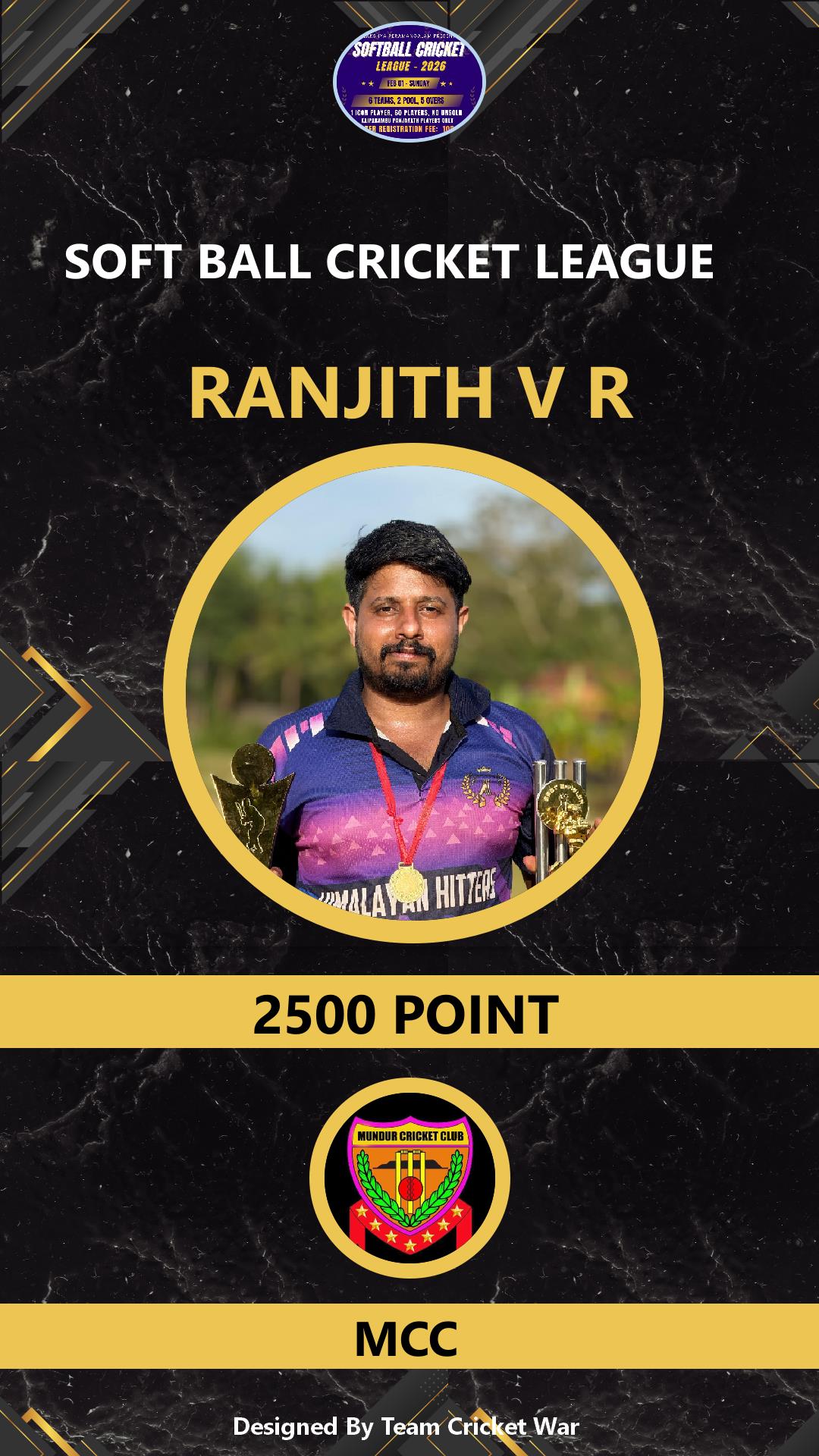 BATSMAN, AGE : 34 VARADIYAM Bid Amount : 2500 Team : DISCO XI Download ID Card VIEW PROFILE |
