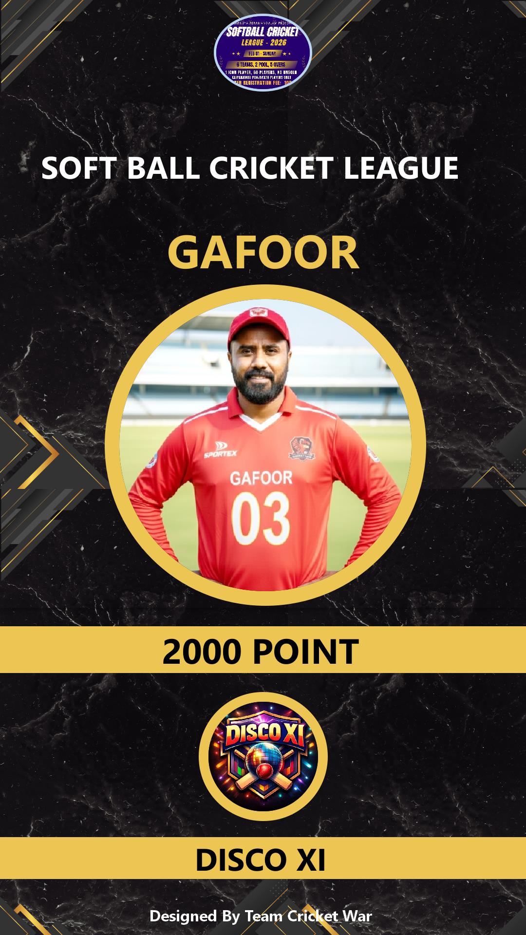 ALLROUNDER, AGE : 41 KAIPARAMBU Bid Amount : 2000 Team : DISCO XI Download ID Card VIEW PROFILE |