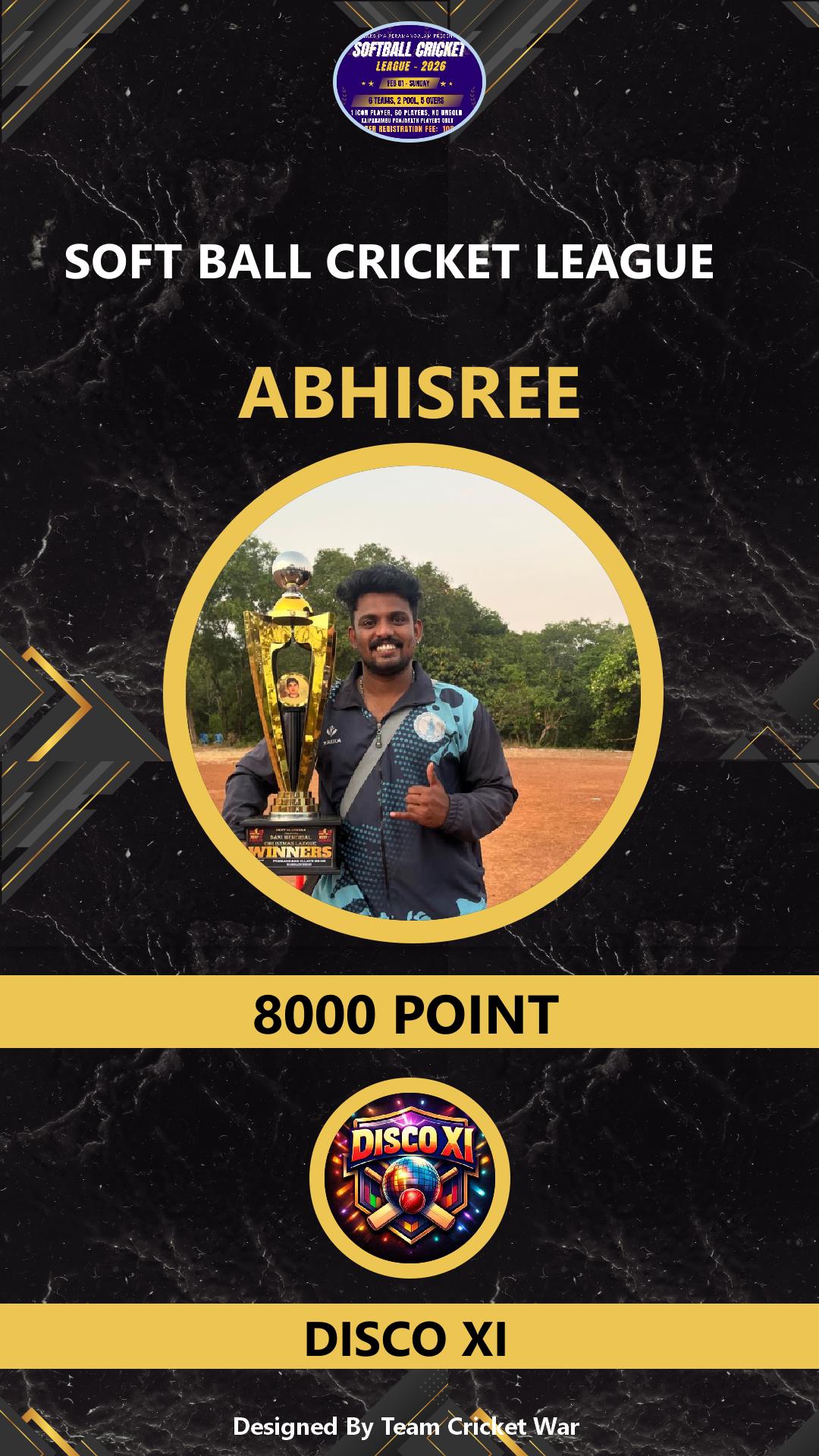 ALLROUNDER, AGE : 29 PERAMANGALM Bid Amount : 5000 Team : DISCO XI Download ID Card VIEW PROFILE |