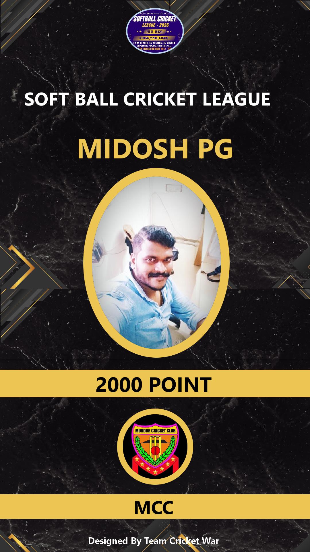 BATSMAN, AGE : 35 PERAMANGALAM Bid Amount : 2000 Team : MCC Download ID Card VIEW PROFILE |