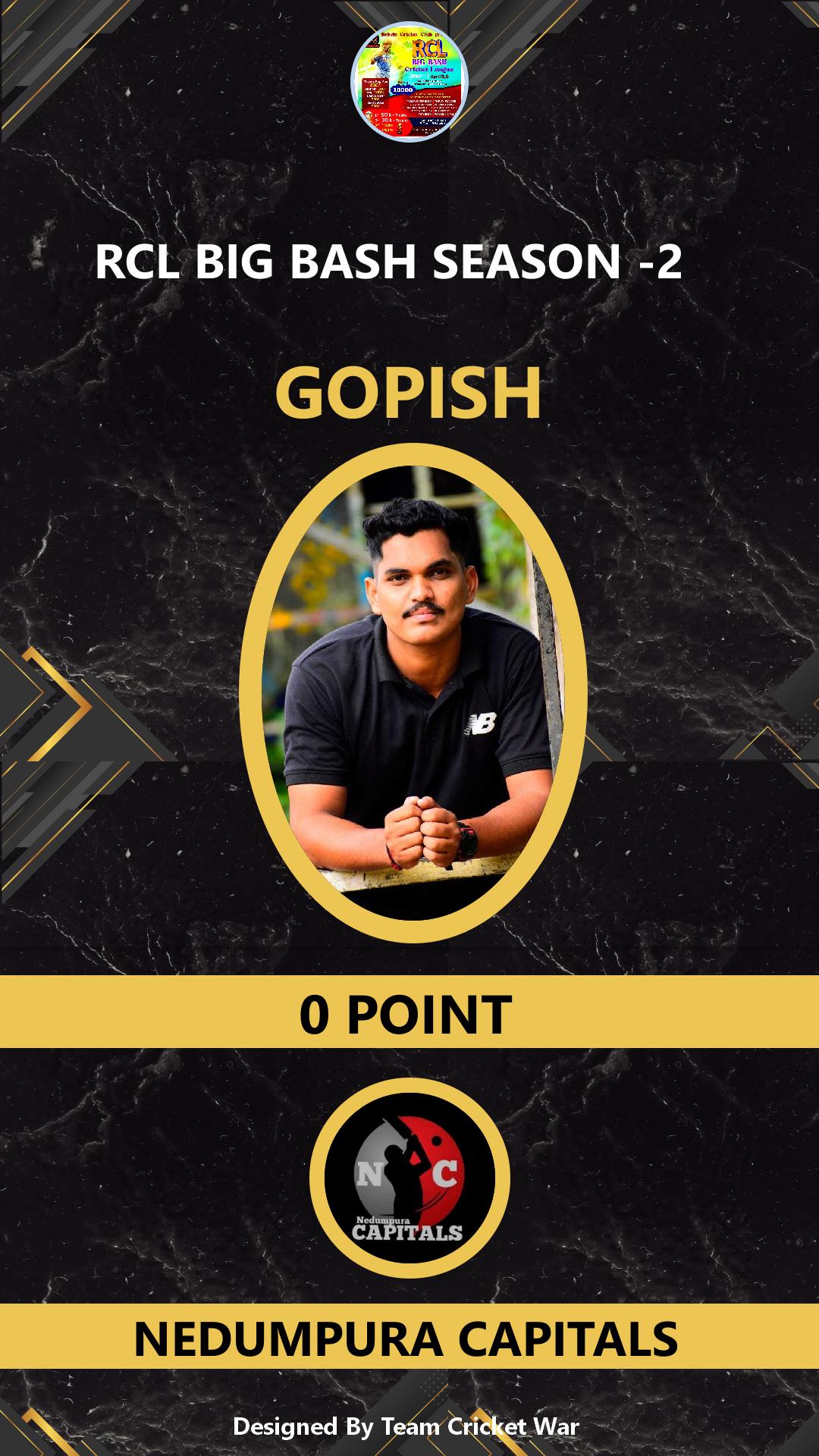 ALLROUNDER, AGE : 27 ARAGGOTTUKARA Bid Amount : 2000 Team : NEDUMPURA CAPITALS Download ID Card VIEW PROFILE |