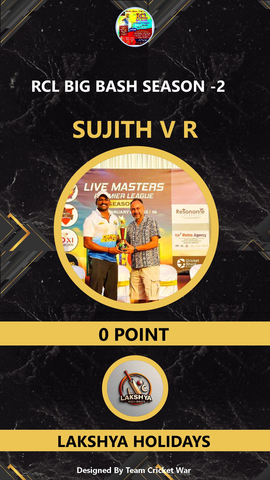BOWLING ALLROUNDER, AGE : 1 CTY Bid Amount : 1000 Team : LAKSHYA HOLIDAYS Download ID Card |